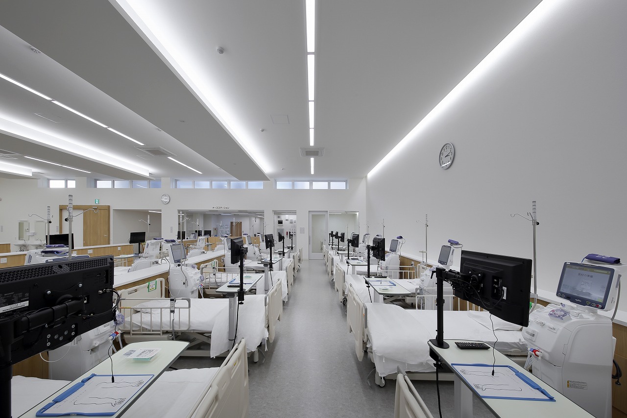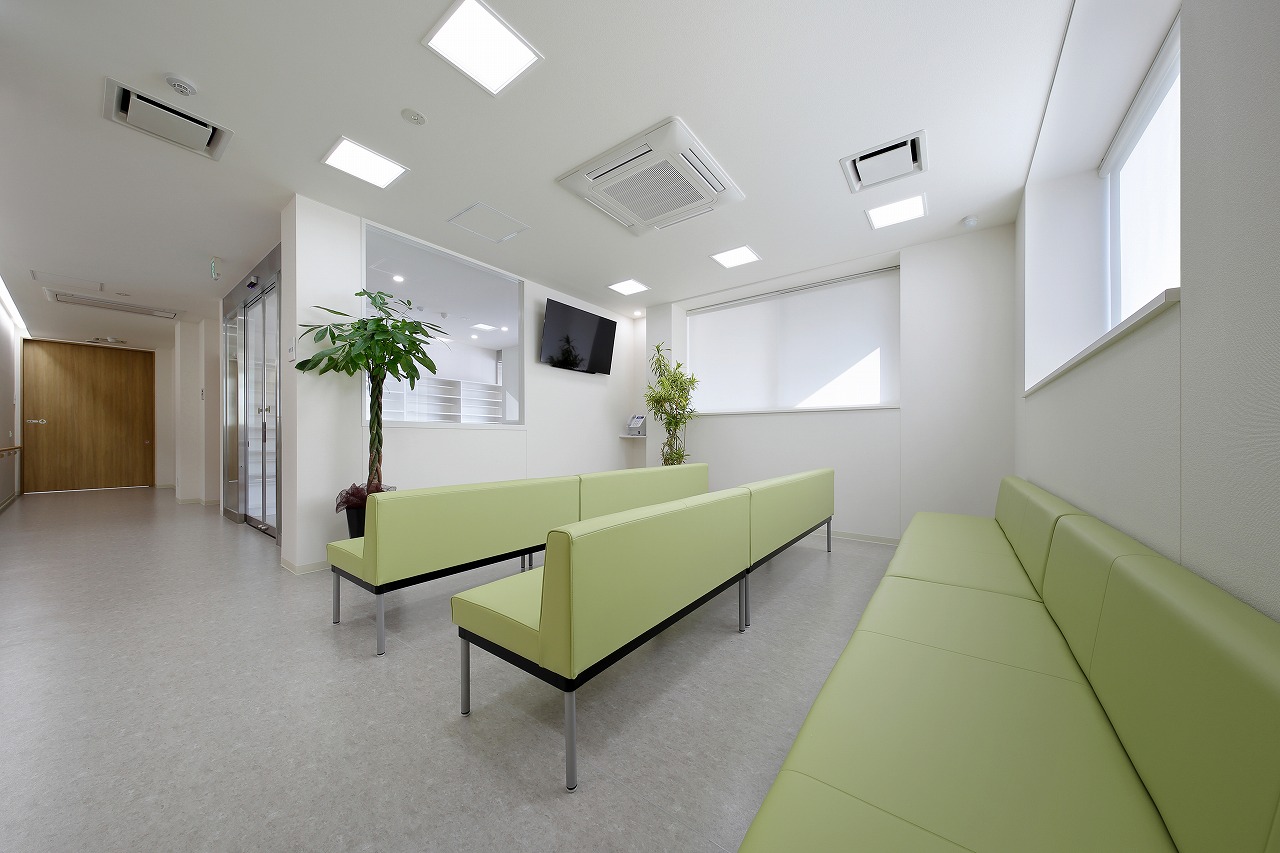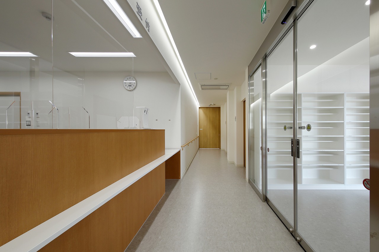 患者様のことを考えた照明計画は、治療中の眩しさを軽減するため、直射日光が入らないようにし、調光可能な間接照明による柔らかな治療空間としています。インテリアは白と木を基調にした温かみのある空間とし、車椅子での移動に配慮したプランとなっています。
