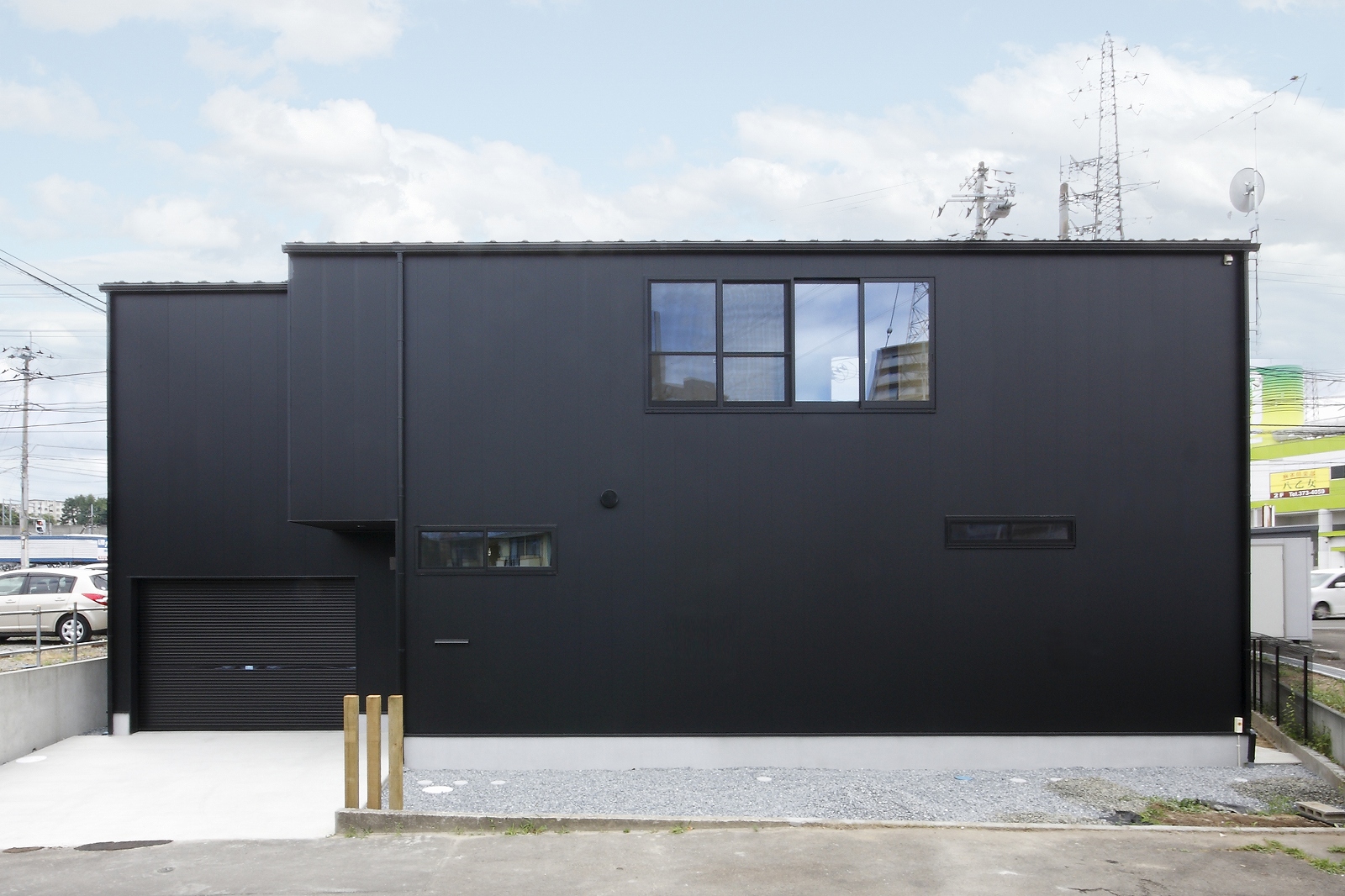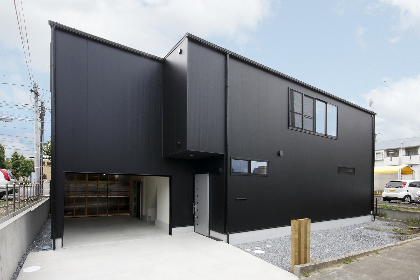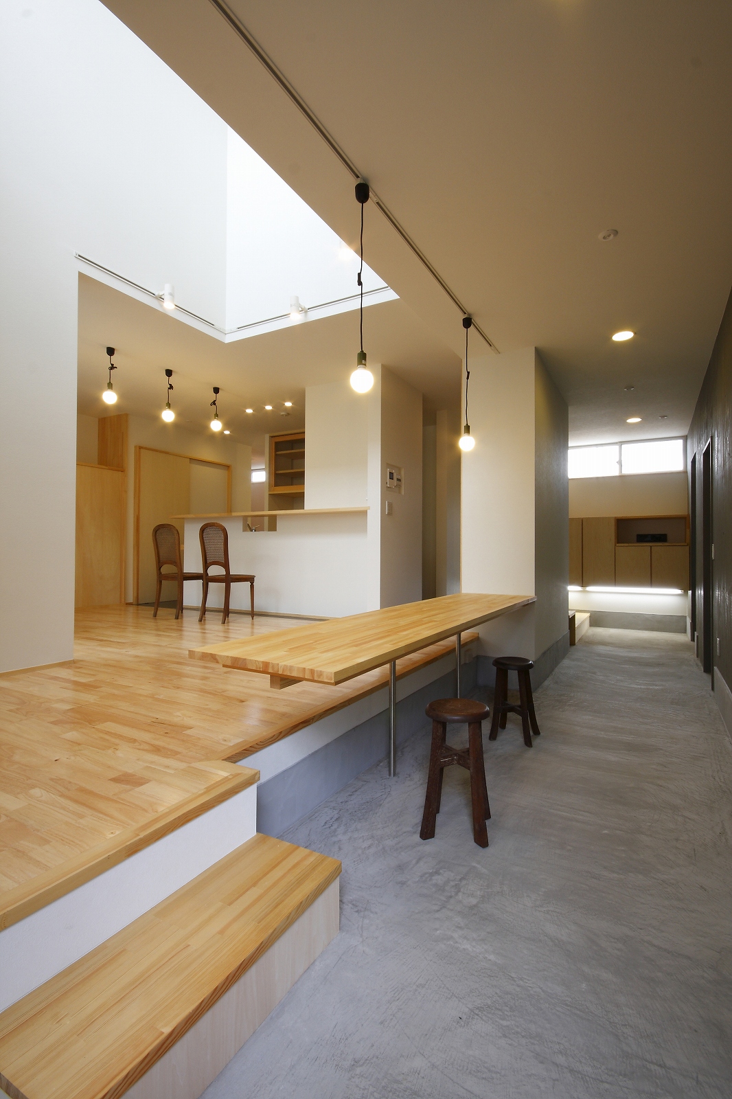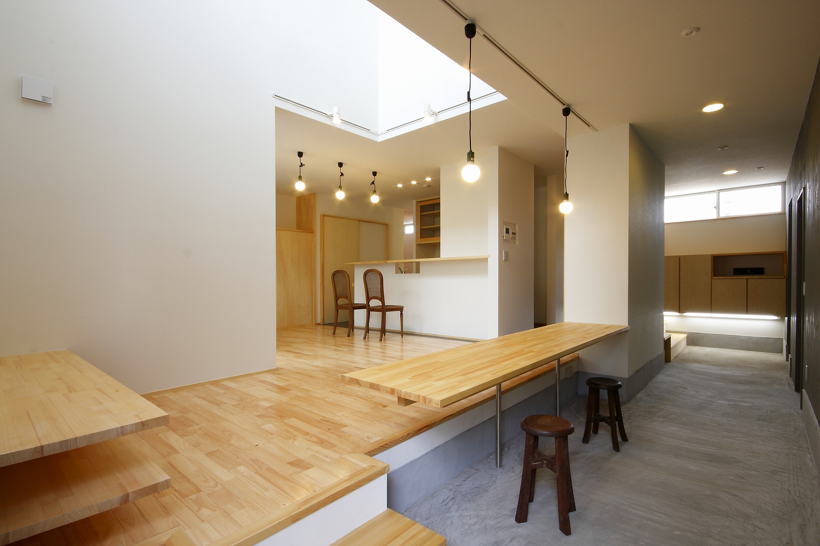 計画地は仙台市泉区の幹線道路に面している敷地で既存住宅の建替えである。当初リフォームのご相談をしていたが、話をしているうちに建替えとなった。オーナー様からは、お客様を持て成す空間として通り土間を設ける、桜が見えるようにしたい、息子さんからインナーガレージが欲しいとの要望があった。その要望から、通り土間と2階のテラスを軸に建物を構成した。桜の正面に通り土間、テラスを設け、子供世帯と親世帯を左右で分けた。子供世帯へはガレージ、通り土間から直接アクセスできるようになっている。通り土間には大きいカウンターを設け、お客さんが来たときには靴を履いたまま、話が出来るようにした。2階は、子供世帯が今後自由に内装を行なうことが出来るように未完としている。また、2階はプライベートな空間となるため、窓の配置に注意し外部からの視線をあまり気にすることなく生活できるようにした。