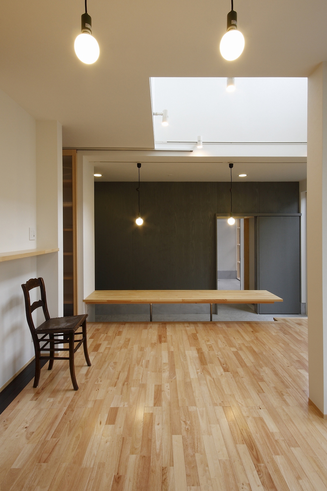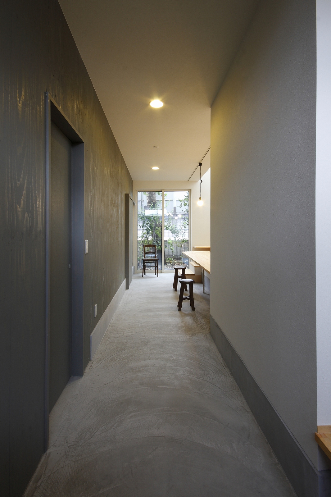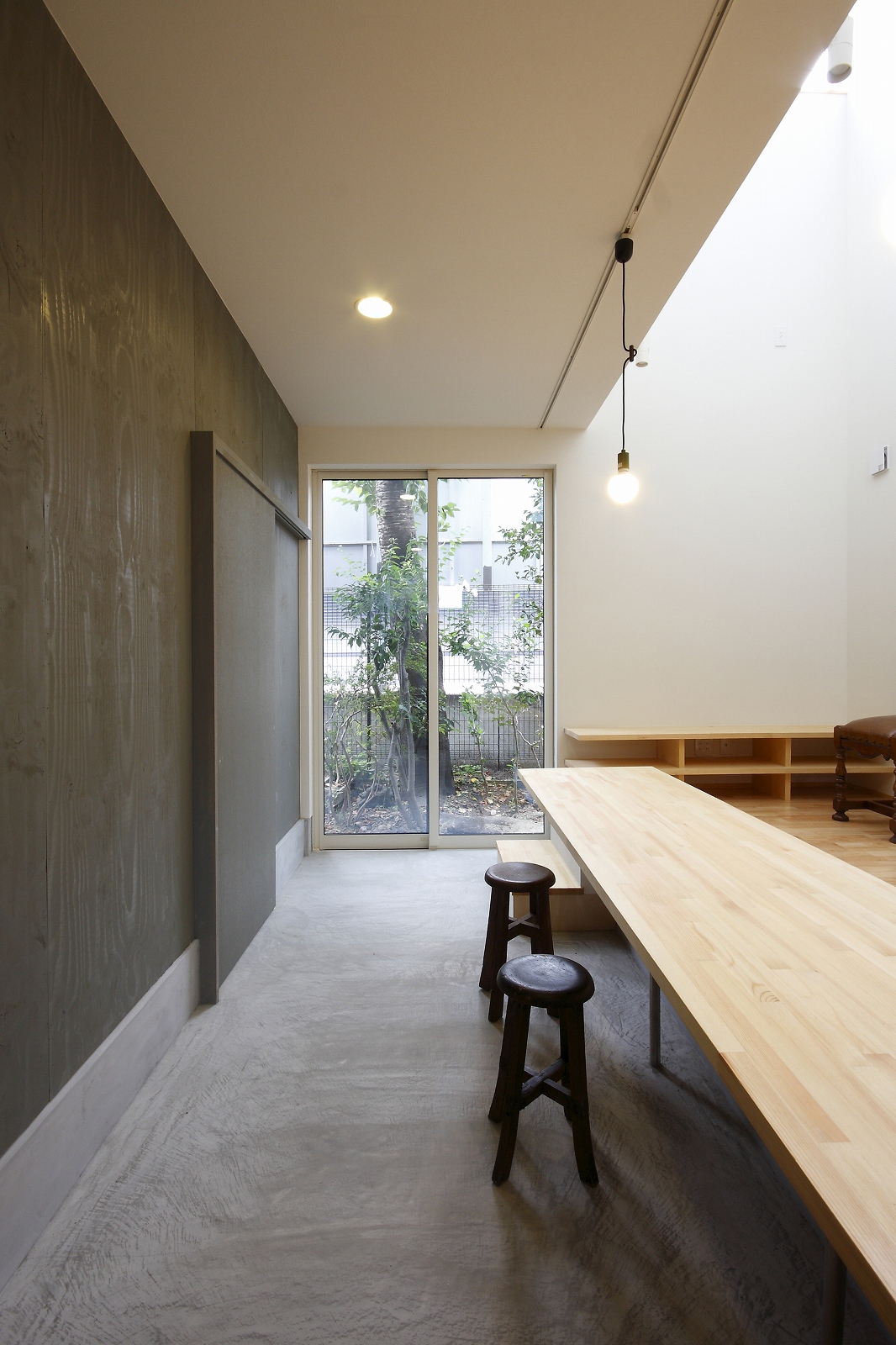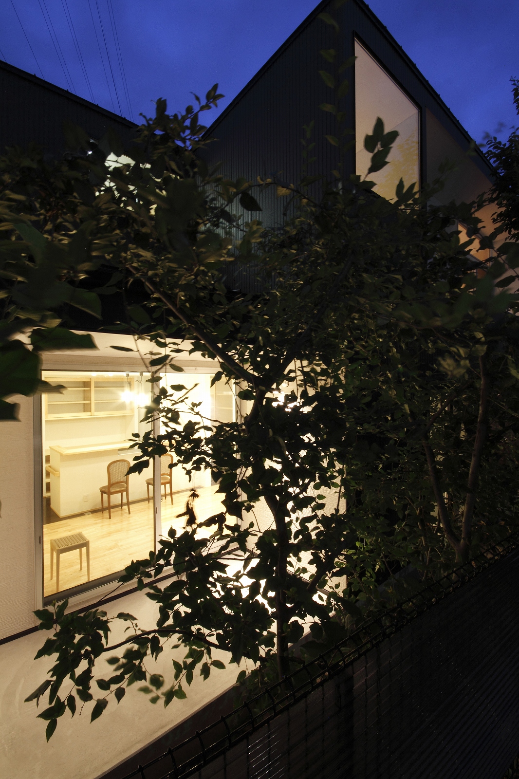 計画地は仙台市泉区の幹線道路に面している敷地で既存住宅の建替えである。当初リフォームのご相談をしていたが、話をしているうちに建替えとなった。オーナー様からは、お客様を持て成す空間として通り土間を設ける、桜が見えるようにしたい、息子さんからインナーガレージが欲しいとの要望があった。その要望から、通り土間と2階のテラスを軸に建物を構成した。桜の正面に通り土間、テラスを設け、子供世帯と親世帯を左右で分けた。子供世帯へはガレージ、通り土間から直接アクセスできるようになっている。通り土間には大きいカウンターを設け、お客さんが来たときには靴を履いたまま、話が出来るようにした。2階は、子供世帯が今後自由に内装を行なうことが出来るように未完としている。また、2階はプライベートな空間となるため、窓の配置に注意し外部からの視線をあまり気にすることなく生活できるようにした。