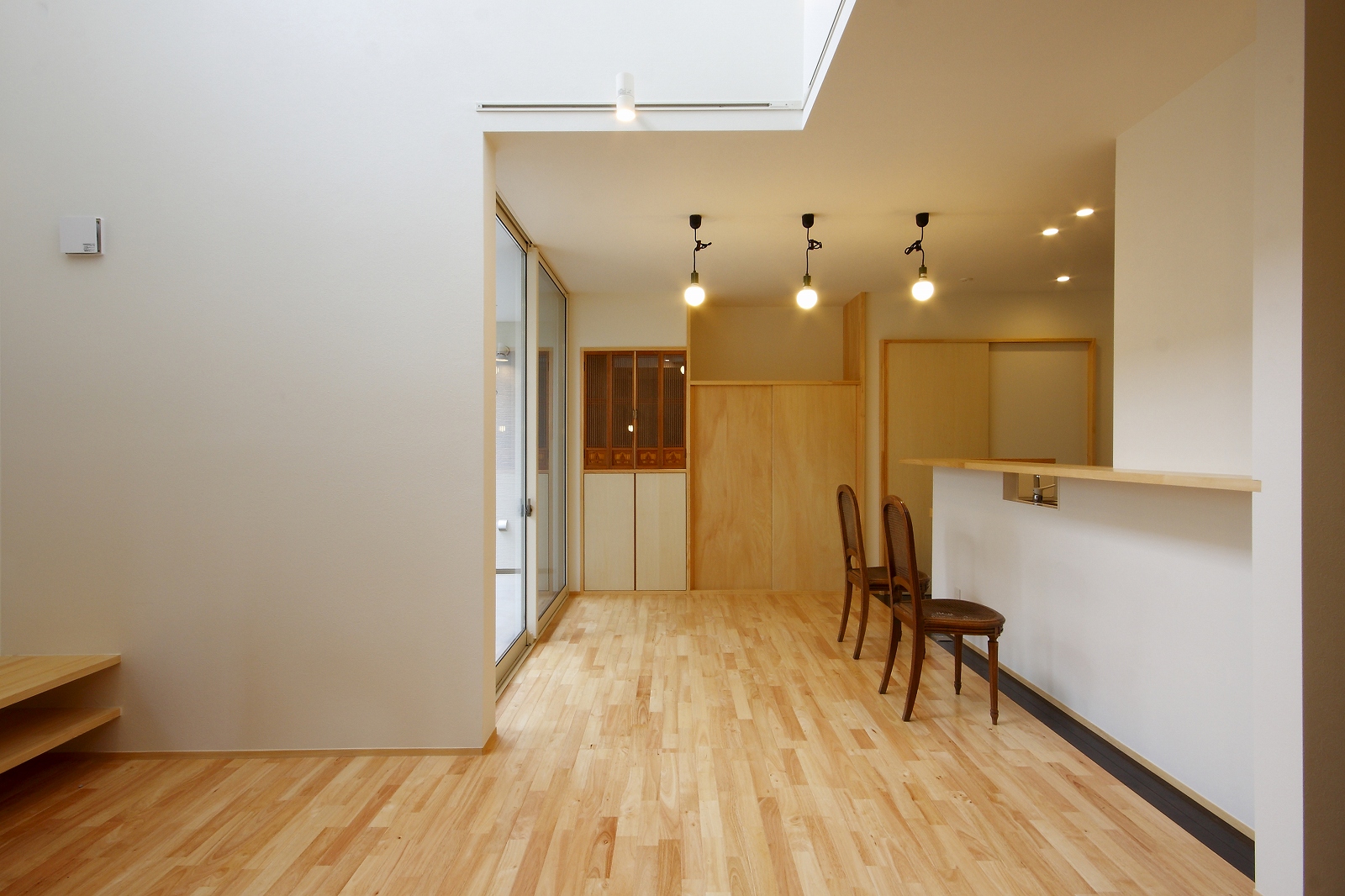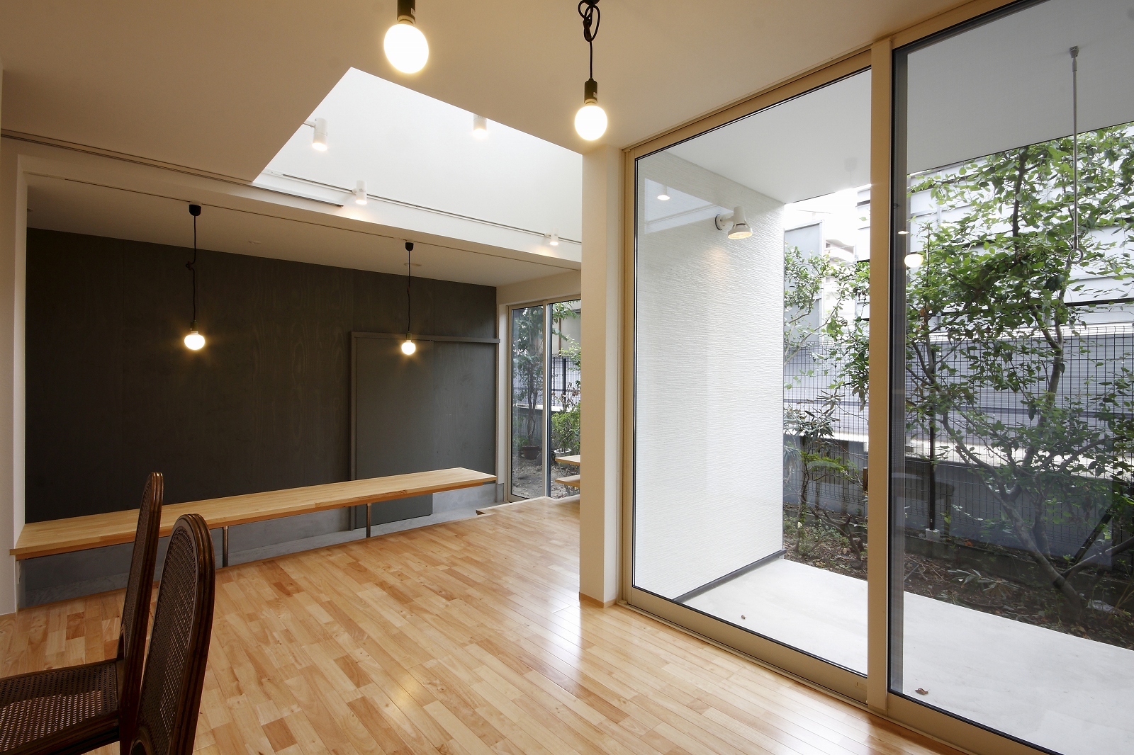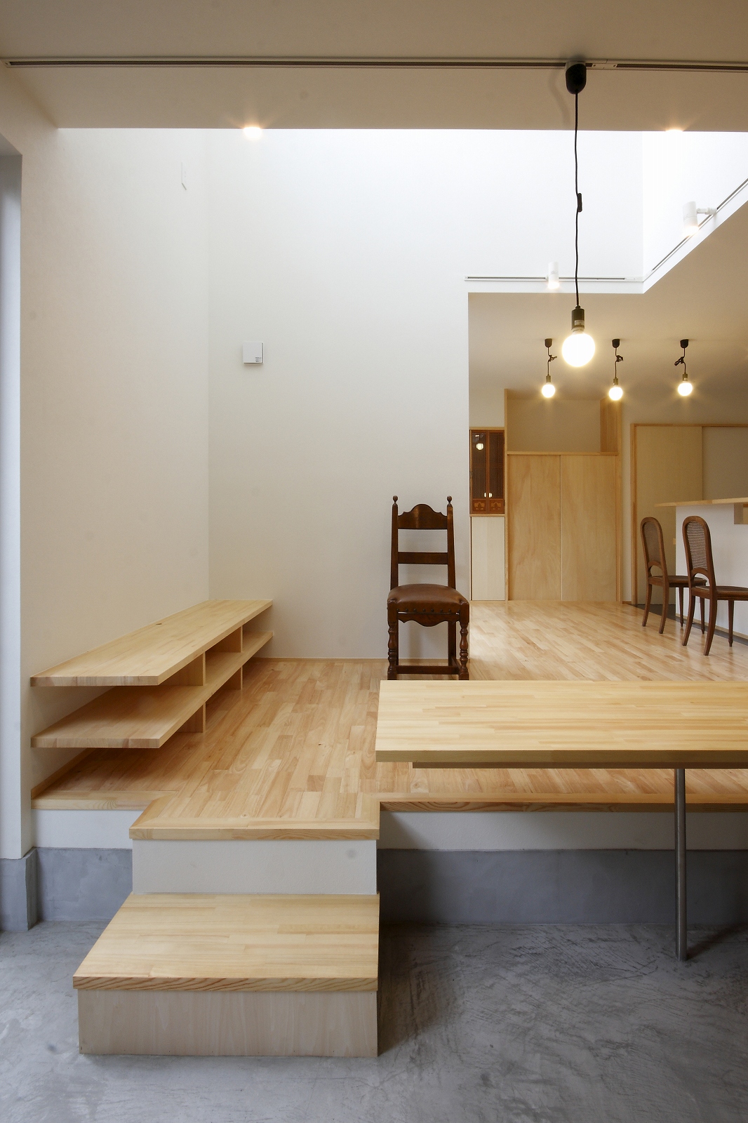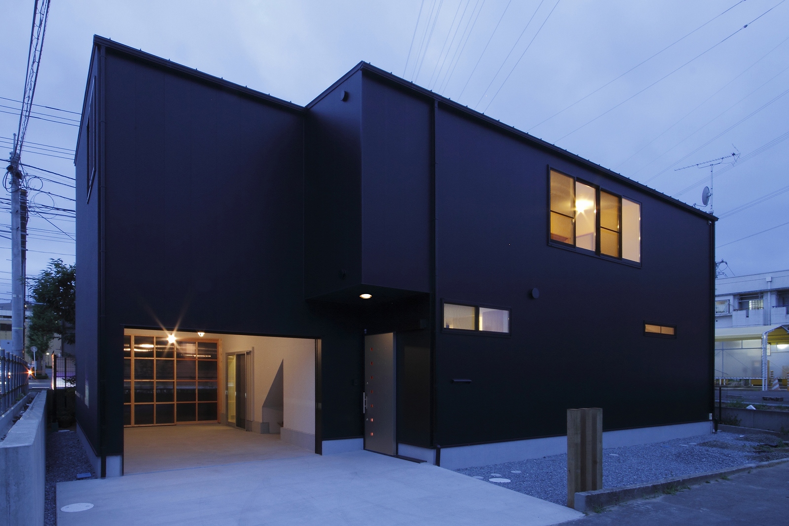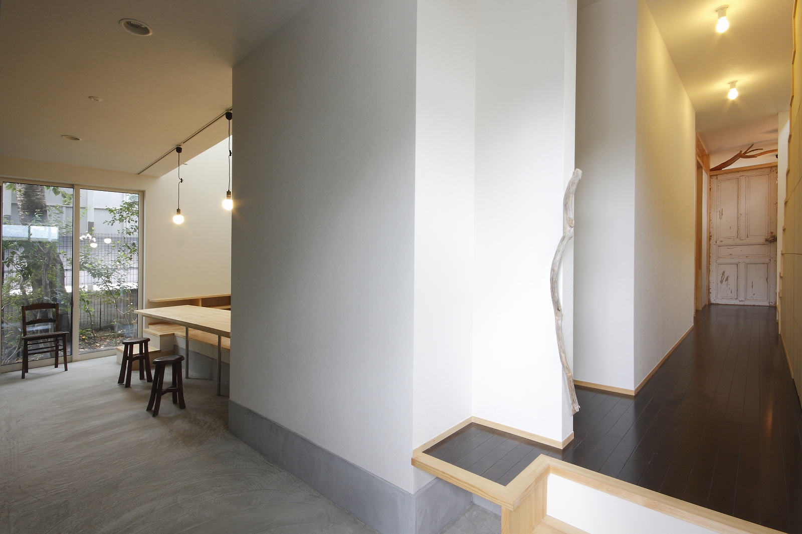 計画地は仙台市泉区の幹線道路に面している敷地で既存住宅の建替えである。当初リフォームのご相談をしていたが、話をしているうちに建替えとなった。オーナー様からは、お客様を持て成す空間として通り土間を設ける、桜が見えるようにしたい、息子さんからインナーガレージが欲しいとの要望があった。その要望から、通り土間と2階のテラスを軸に建物を構成した。桜の正面に通り土間、テラスを設け、子供世帯と親世帯を左右で分けた。子供世帯へはガレージ、通り土間から直接アクセスできるようになっている。通り土間には大きいカウンターを設け、お客さんが来たときには靴を履いたまま、話が出来るようにした。2階は、子供世帯が今後自由に内装を行なうことが出来るように未完としている。また、2階はプライベートな空間となるため、窓の配置に注意し外部からの視線をあまり気にすることなく生活できるようにした。