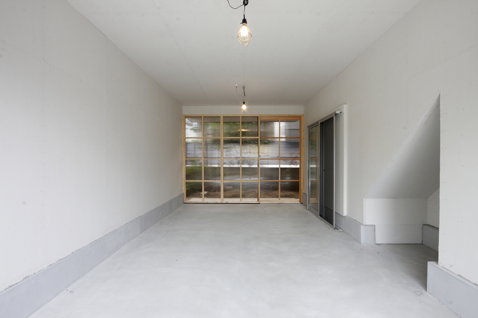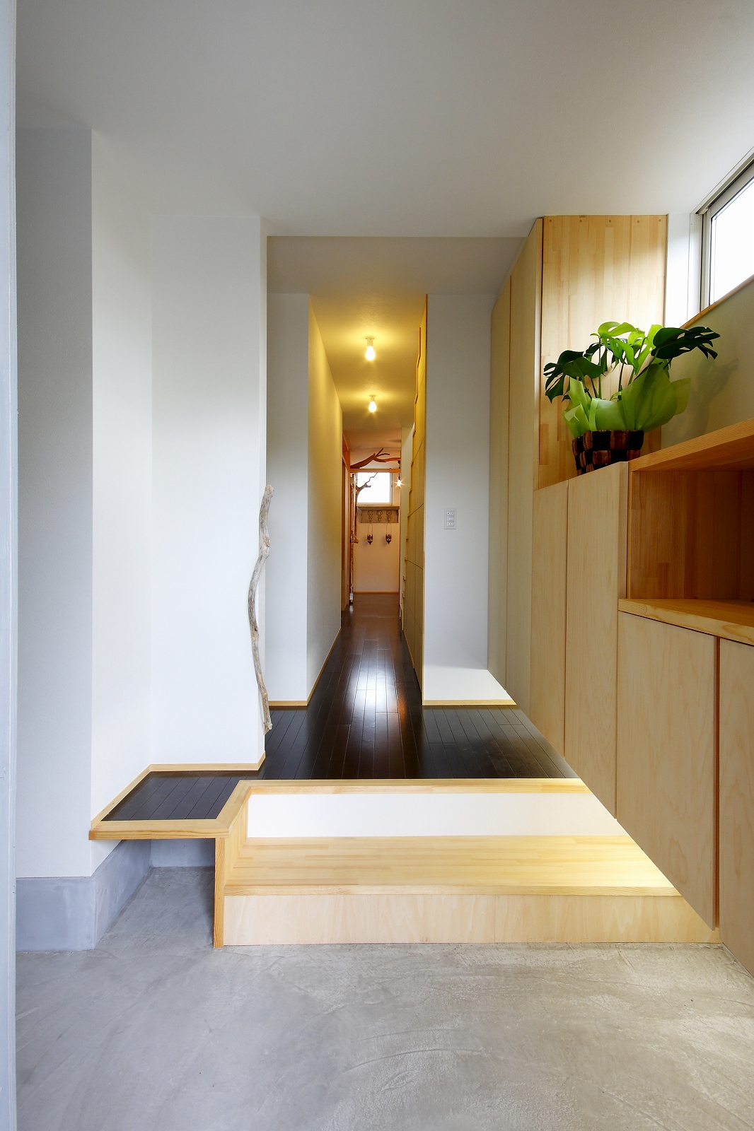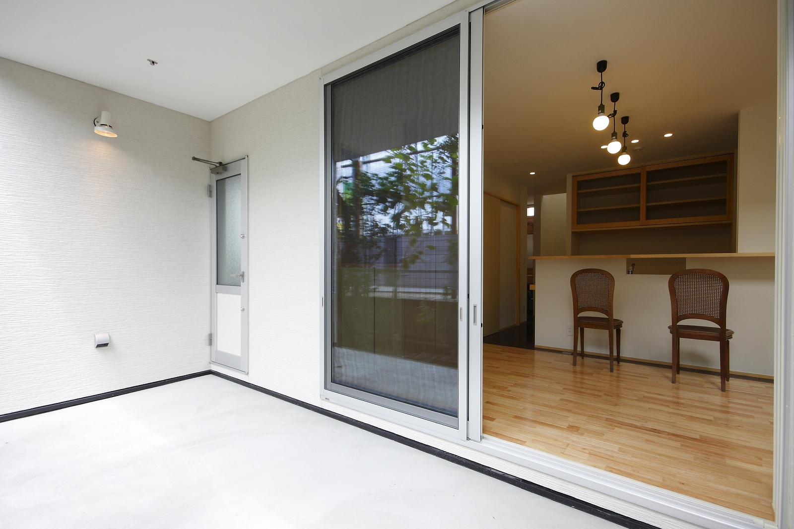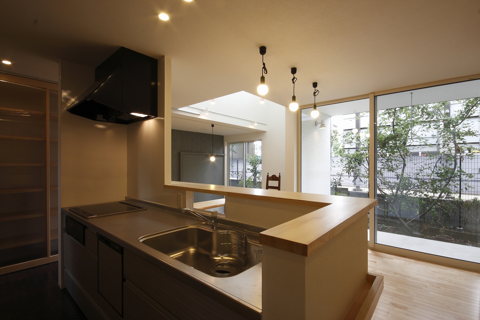 計画地は仙台市泉区の幹線道路に面している敷地で既存住宅の建替えである。当初リフォームのご相談をしていたが、話をしているうちに建替えとなった。オーナー様からは、お客様を持て成す空間として通り土間を設ける、桜が見えるようにしたい、息子さんからインナーガレージが欲しいとの要望があった。その要望から、通り土間と2階のテラスを軸に建物を構成した。桜の正面に通り土間、テラスを設け、子供世帯と親世帯を左右で分けた。子供世帯へはガレージ、通り土間から直接アクセスできるようになっている。通り土間には大きいカウンターを設け、お客さんが来たときには靴を履いたまま、話が出来るようにした。2階は、子供世帯が今後自由に内装を行なうことが出来るように未完としている。また、2階はプライベートな空間となるため、窓の配置に注意し外部からの視線をあまり気にすることなく生活できるようにした。