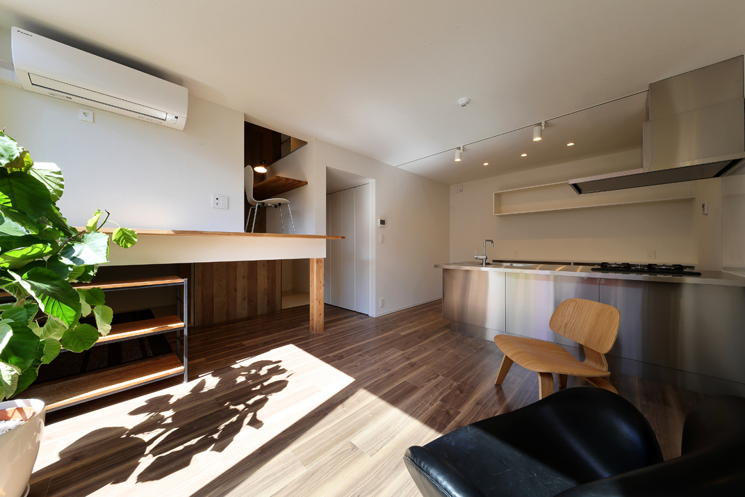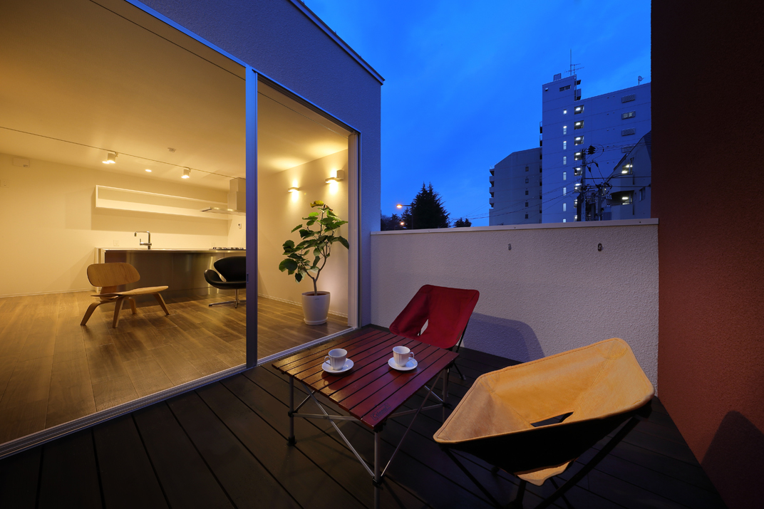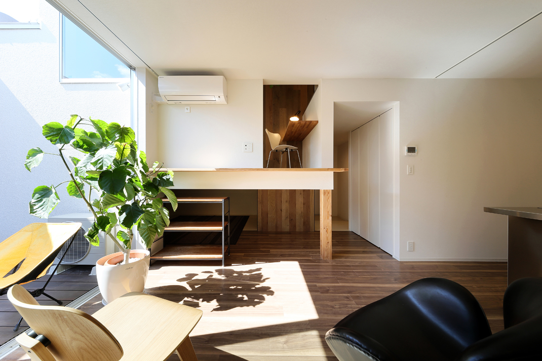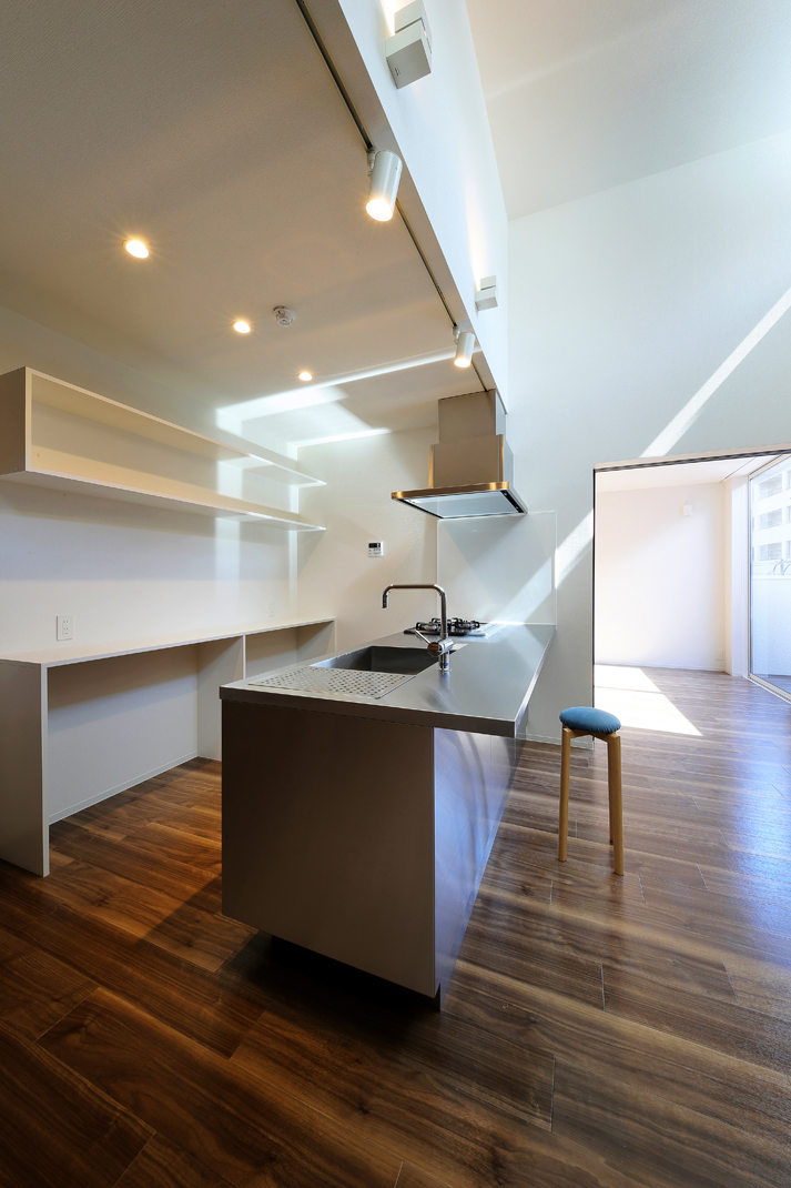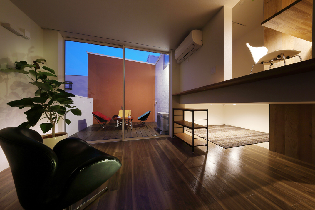 住戸の計画については南北に長い建物形状で採光を確保しつつ、商業施設の上階ながらもプライバシーが確保された空間を目指した。構造とのバランスで大小様々なテラスを計画することで南の採光を取り入れる工夫をしている。最上階ということもあり、賃貸では珍しい吹き抜け空間を提案した。このことによってBOXの凹凸のある外観を形成しているとともに採光・通風を確保できる開口部を計画できた。