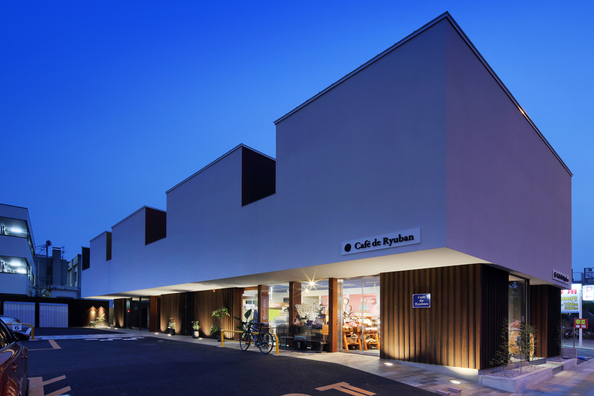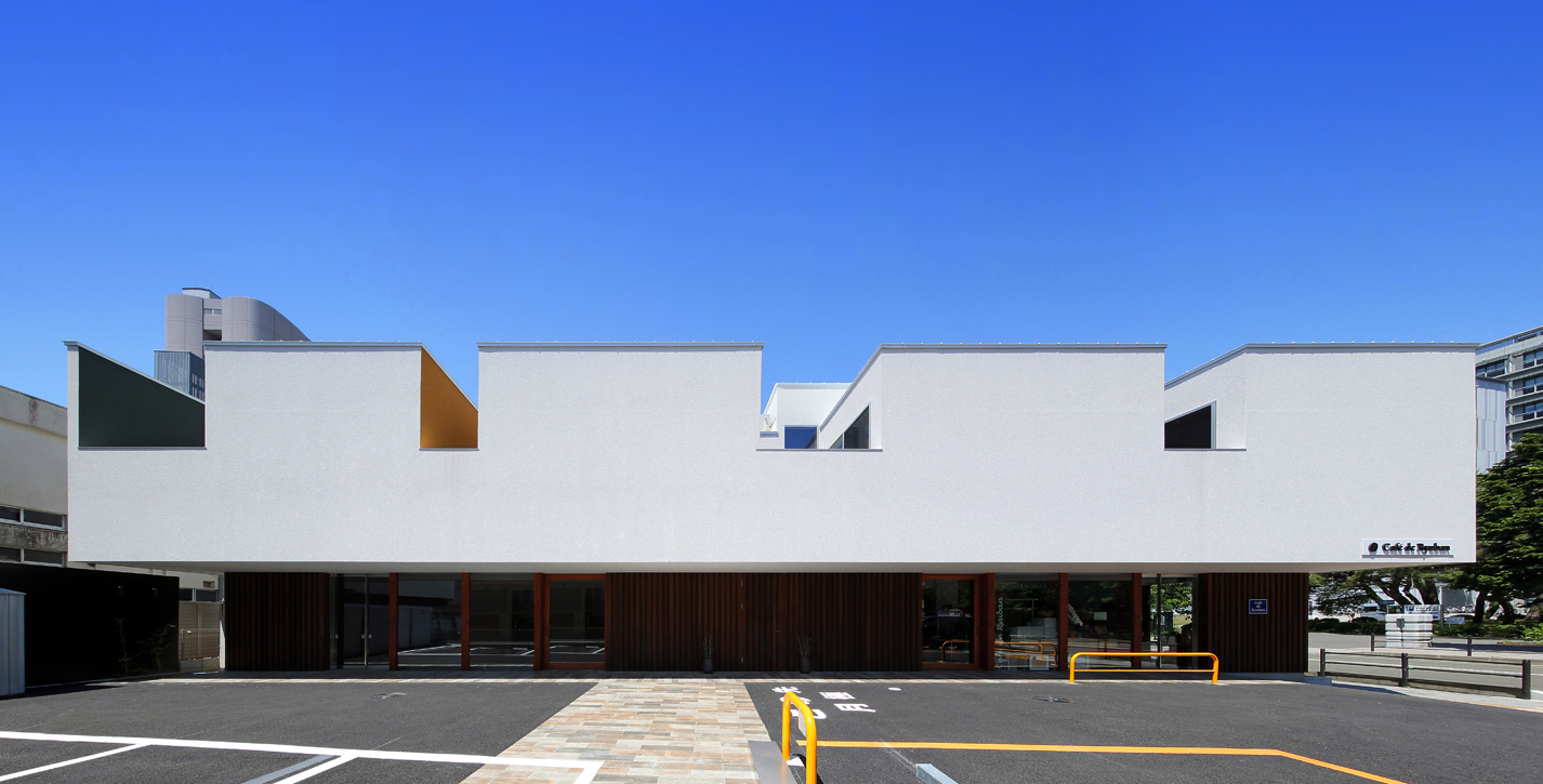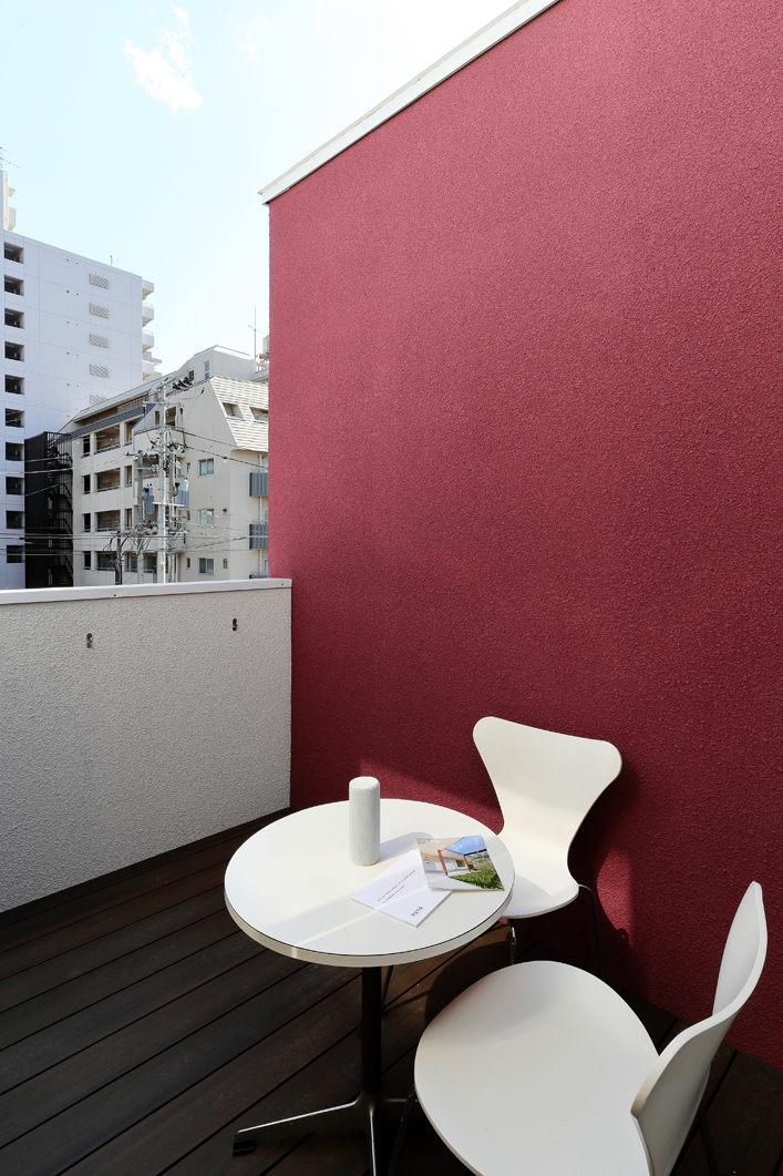 テラスの一面の色を変えることによってメインファサードである国道からのインパクトを与え、人々の印象に残るように計画している。