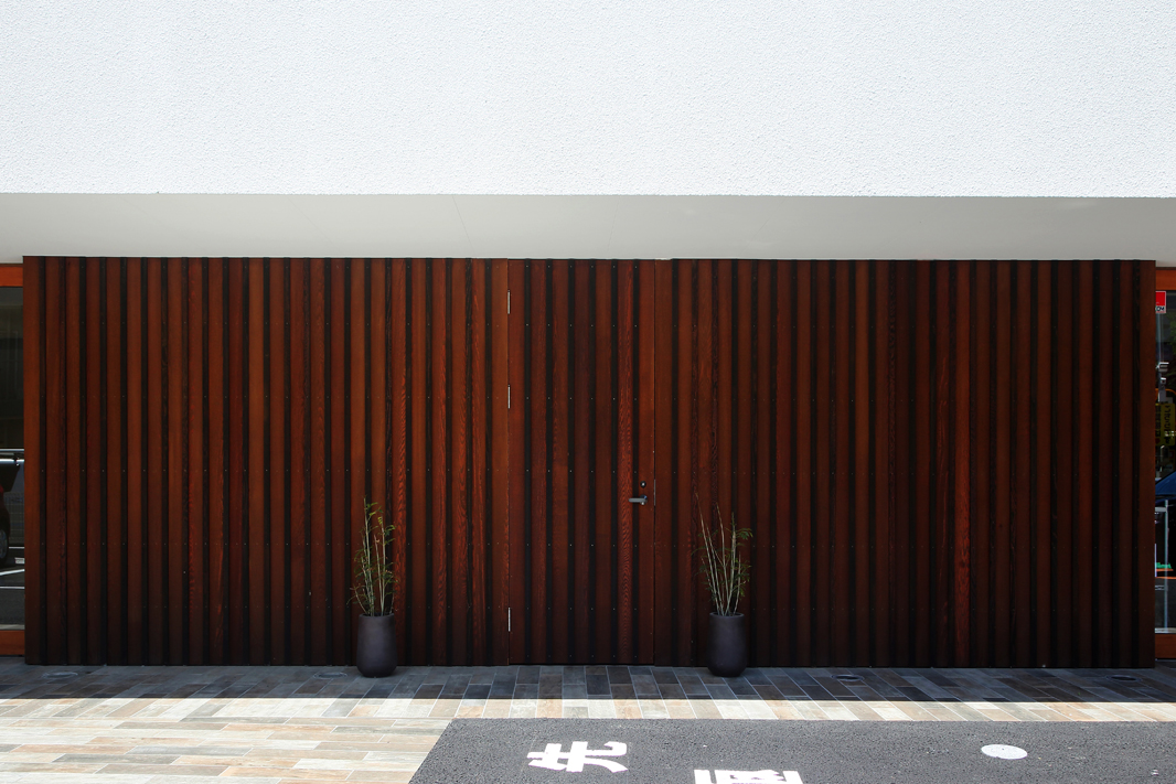 配置計画について国道沿いの視認性や動線を考慮し、コインパーキングを配置することで1台あたりの単価を担保した。この配置によって建物形状が南北に長い特殊な形状になっている。店舗の単価も担保するために人の動線が敷地の奥までいくようにアプローチを計画した。2階住戸を迫り出すことで下屋空間を活用している。商業施設と共同住宅の動線をうまく干渉しないようにするために住戸のアプローチを限定して、住戸に関する外部要因をコインパーキングの南に配置した。さらにコインパーキングと領域を分け、月極駐車場も配置計画した。