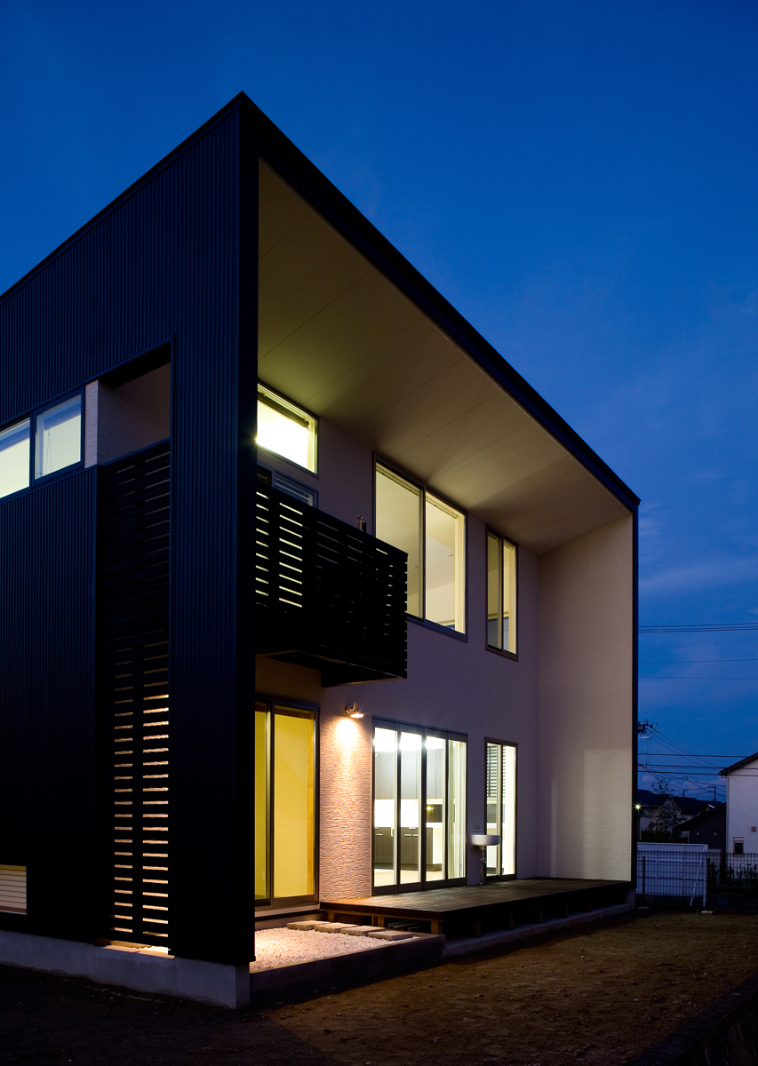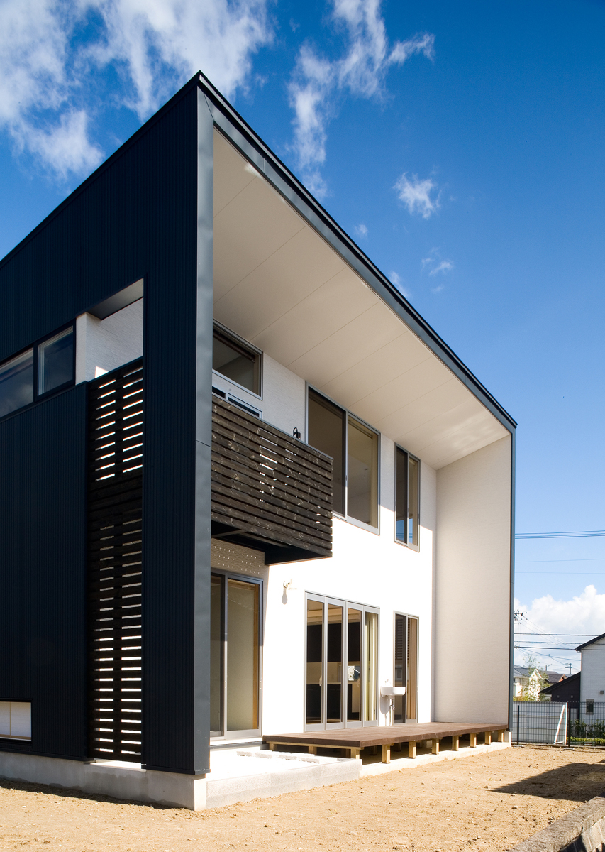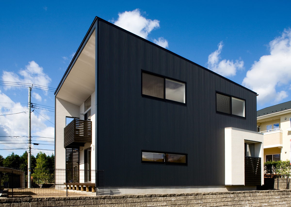 建物の外観は道路から見るファサードの表現を抑えモダンにしながらも、深い軒の中に大きな窓を多くとることで、外観から想像される以上に明るく大きな室内空間を実現しました。外観は黒いガルバリウム鋼板ですっきり仕上げ、それと対照的に、ポーチから玄関のアプローチ空間は白いタイル・ジョリパット塗の壁・木板貼の軒で丁重にオーナーや来客を迎え、特別な家へ入っていく気持ちを自然と整えてもらうよう配慮しました。