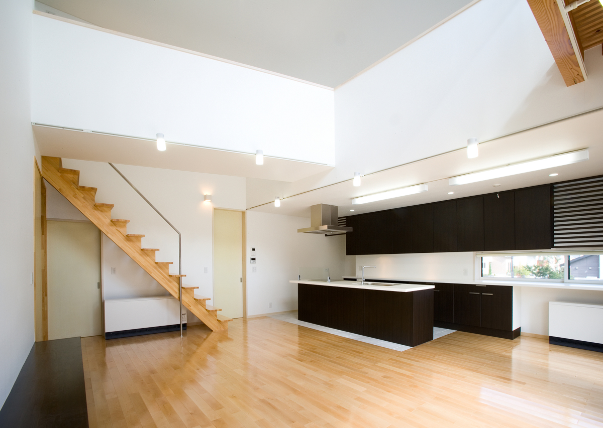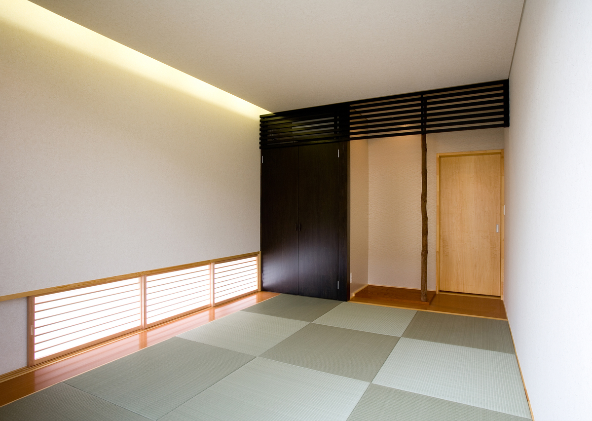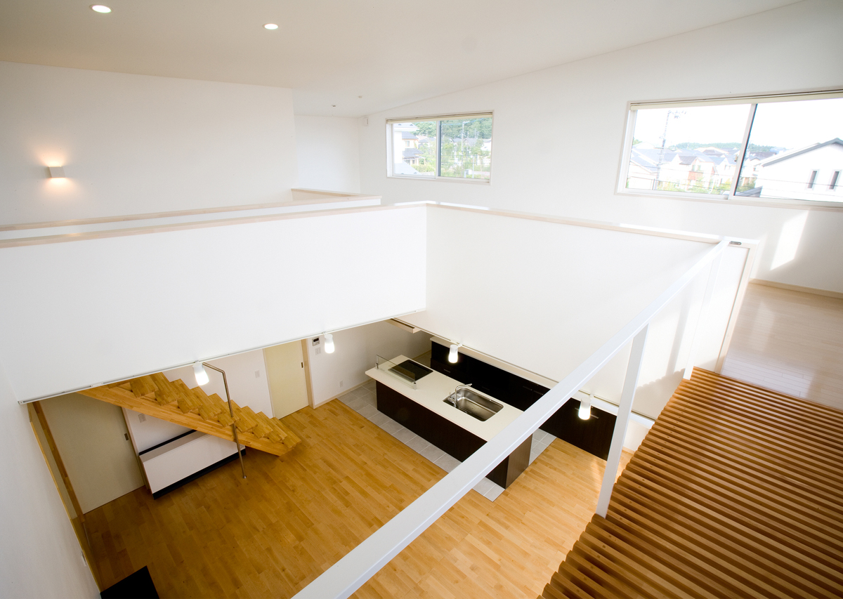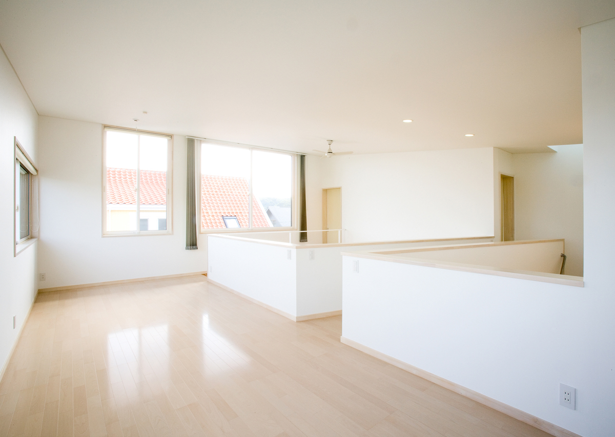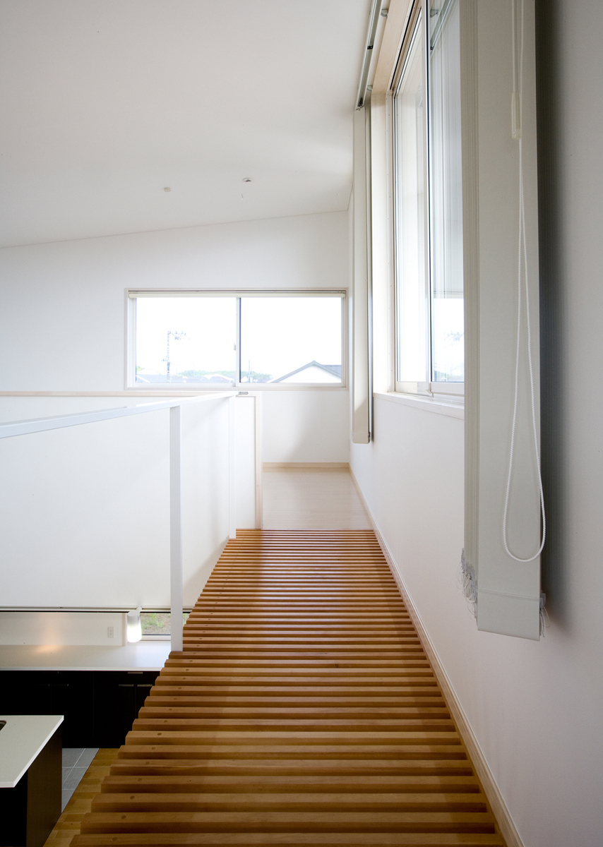 玄関には靴のまま出入りできるクロークを設け、靴やコートが増えても玄関から見えないよう仕切りました。リビングは大きな吹き抜けを介し、2階の予備室とつながっており、吹き抜けには斜めにブリッジをかけシンプルな空間に変化を与えています。予備室は当面は2ndリビングとして機能し、将来の子供部屋として2つに仕切れるようブリッジが予備室の中央にかかっている。1階の和室は、玄関脇に高さ1.8mの低いドアから入りサルスベリの床柱や黒い塗装等でしっかりとした和室として仕上げており、そこでは、室内全体のモダン雰囲気とは一線を引いています。主寝室は、大きなWCLとつながっており、予備室と共に効率よく収納空間を確保しています。