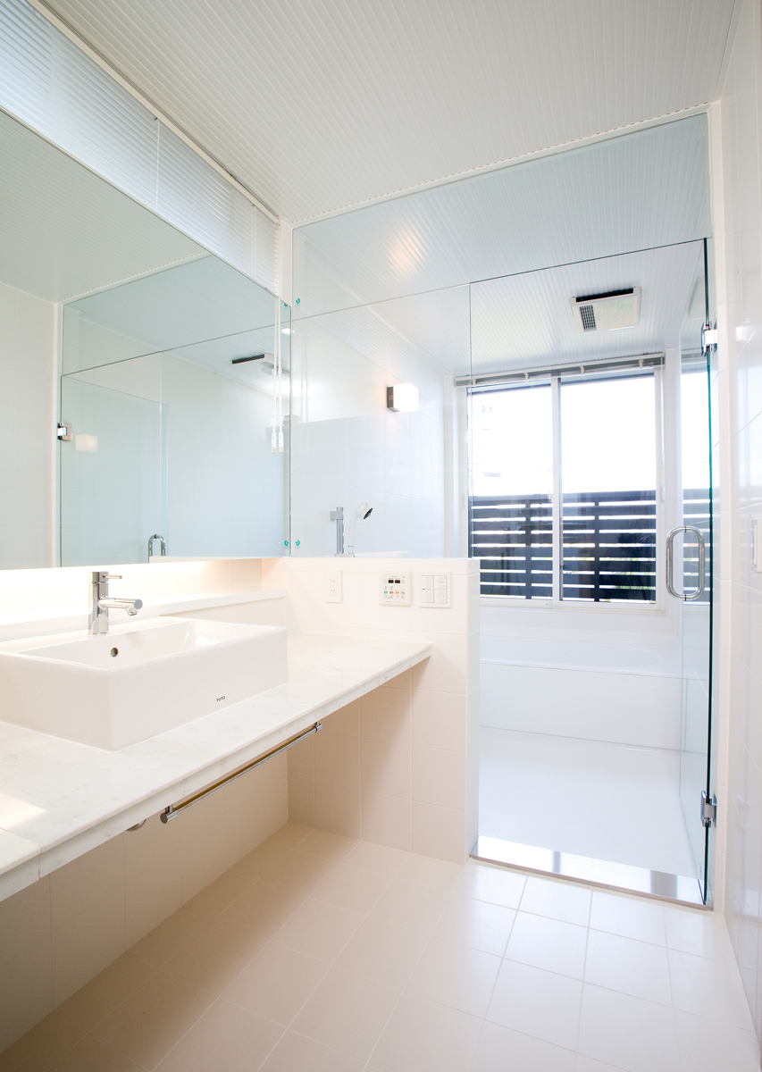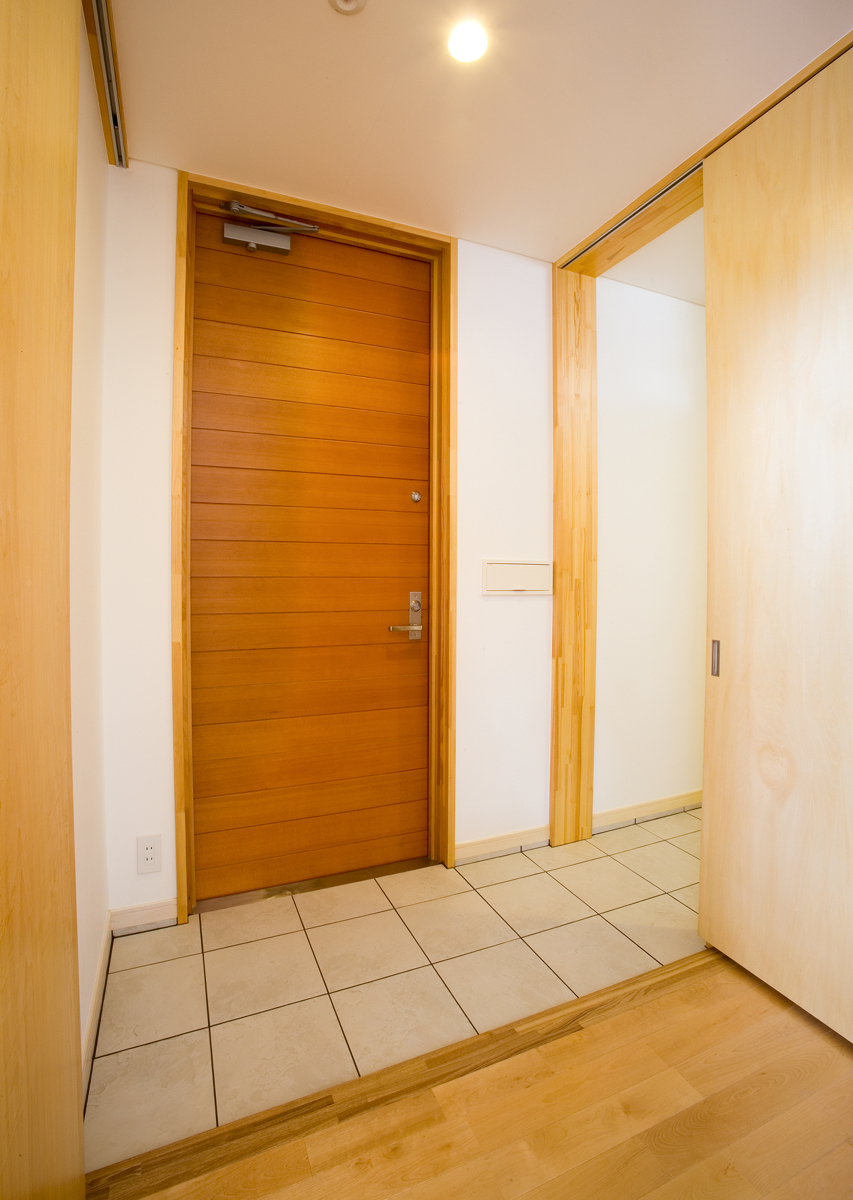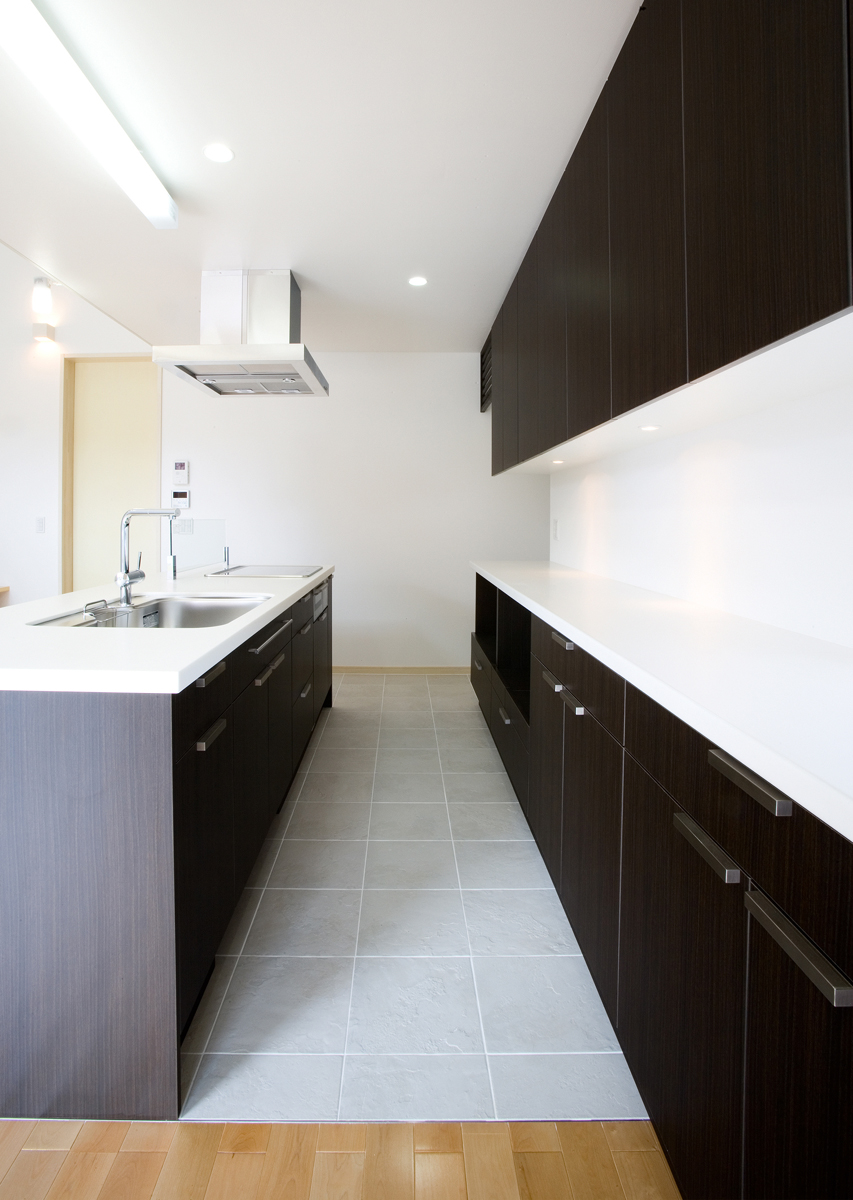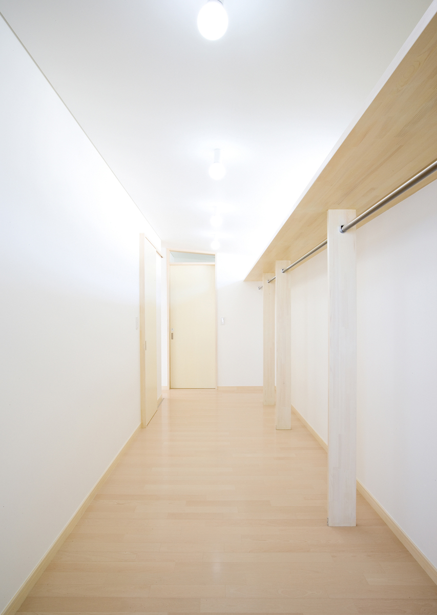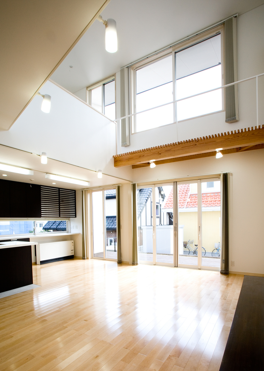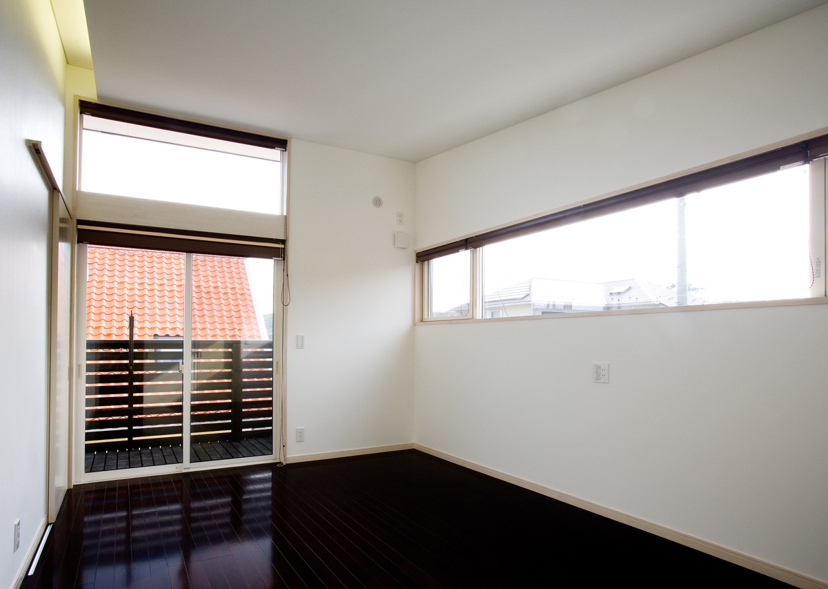 玄関には靴のまま出入りできるクロークを設け、靴やコートが増えても玄関から見えないよう仕切りました。リビングは大きな吹き抜けを介し、2階の予備室とつながっており、吹き抜けには斜めにブリッジをかけシンプルな空間に変化を与えています。予備室は当面は2ndリビングとして機能し、将来の子供部屋として2つに仕切れるようブリッジが予備室の中央にかかっている。1階の和室は、玄関脇に高さ1.8mの低いドアから入りサルスベリの床柱や黒い塗装等でしっかりとした和室として仕上げており、そこでは、室内全体のモダン雰囲気とは一線を引いています。主寝室は、大きなWCLとつながっており、予備室と共に効率よく収納空間を確保しています。
