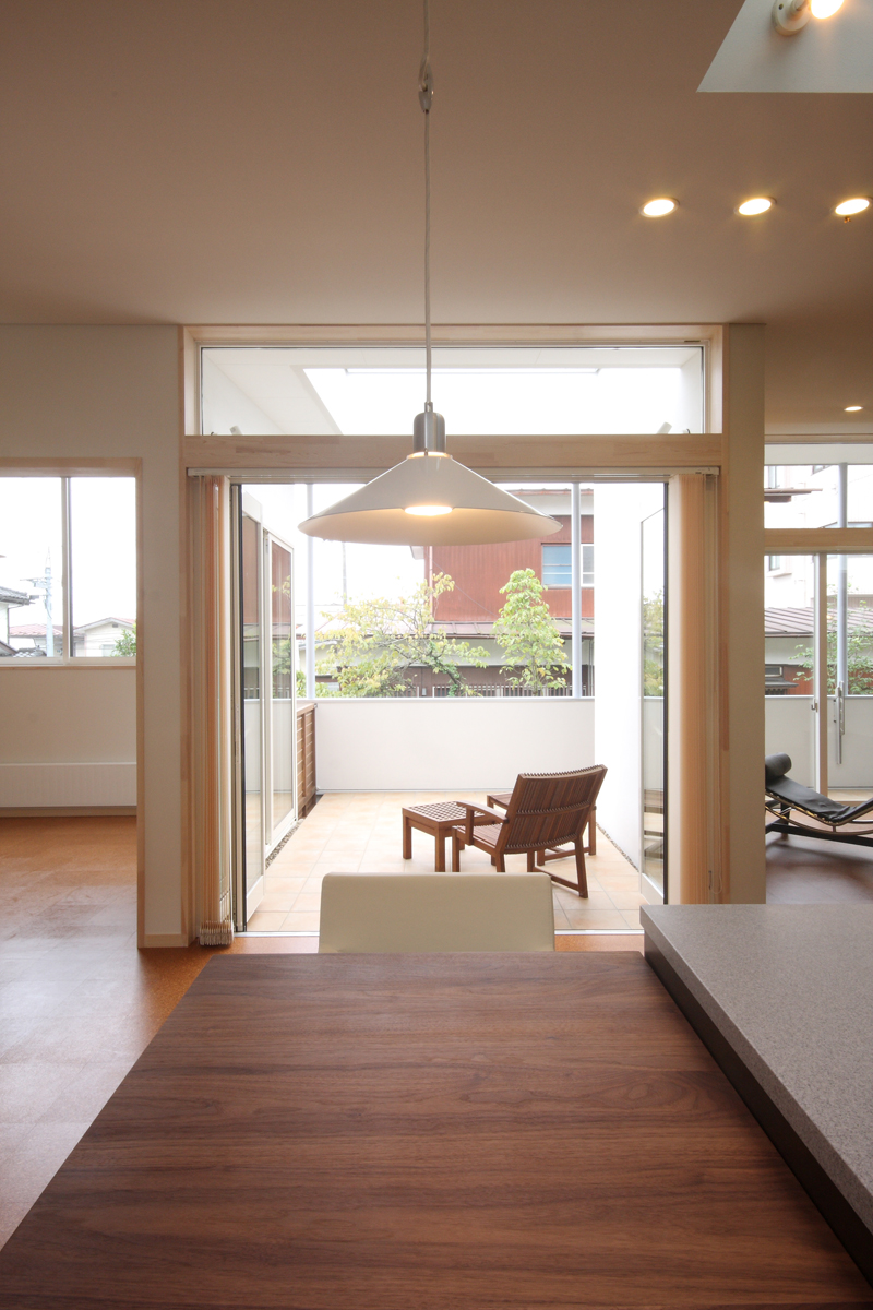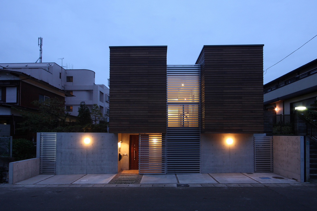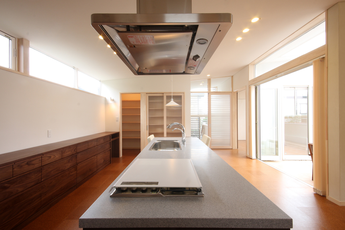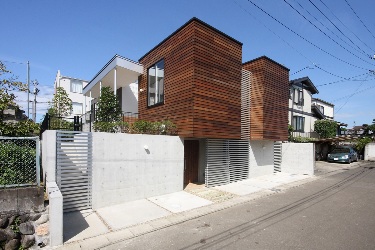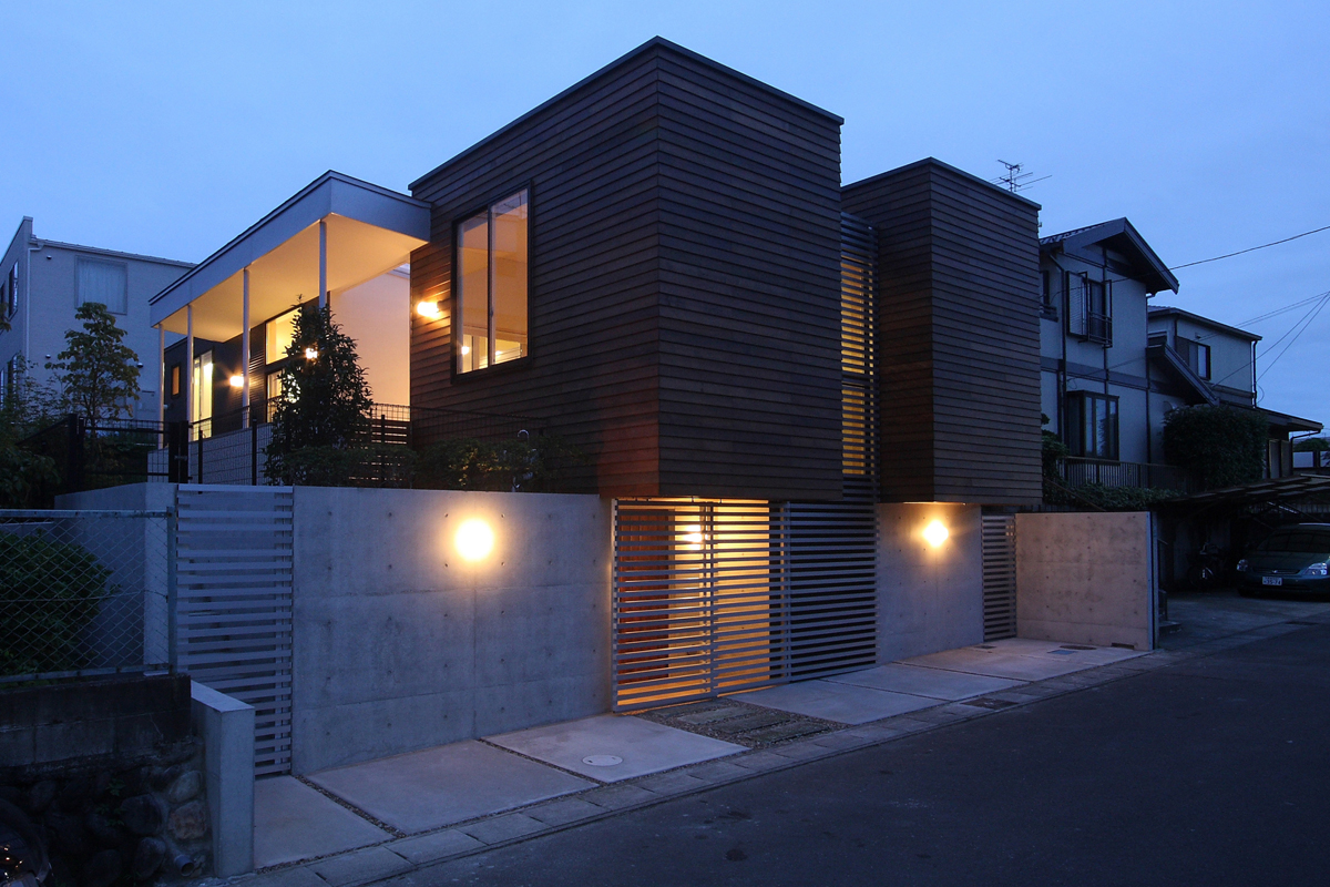 計画地は40年程前に造成された宅地で路と宅盤に玉石積で2mほどの高低差があり、築35年の家が建っていました。70坪ほどの平坦で広く明るい敷地を生かし平屋建ての伸びやかな空間を配置すると共に、外階段からの不便な出入りを解消するため一部を地下として道路レベルから家に出入りできるよう計画しました。道路側からの外観には窓を設けず、コンクリート打ち放しの新しい擁壁・温もりを感じる木貼の外壁とアルミのルーバーで構成し、閉鎖的でありながらも内部空間への期待を持たせ、同時にプライバシーの確保にも繋がっています。地下の玄関からルーバー越しのやわらかい光に導かれ1階へと上がると、明るく伸びやかなワンルームのような内部空間が広がります。フラットな平面にアルコーブテラスや中庭といった外部空間を配置することで内部空間同士や内と外が穏やかに繋がり、たっぷりの採光と通風が確保されます。こうした繋がりやキッチン・浴室等の水周りを中心とした回遊性のある空間は奥行と変化をもたらし、生活動線においてもコンパクトで効率的な計画となっています。