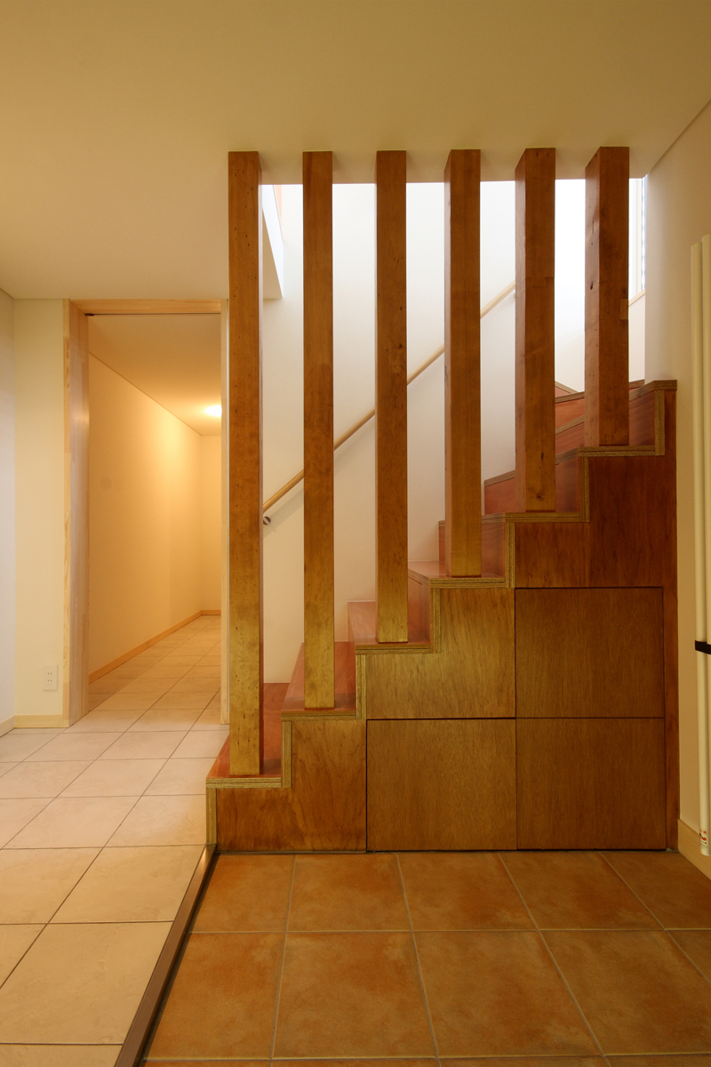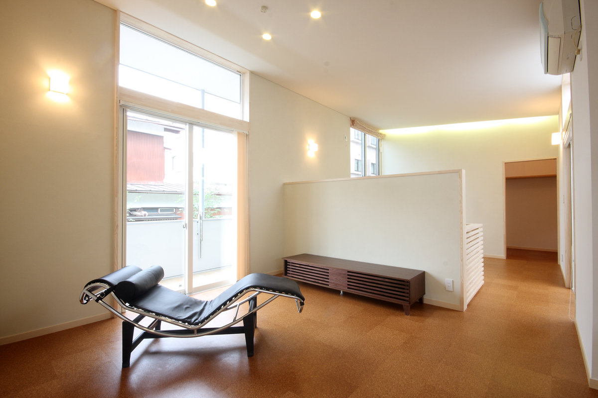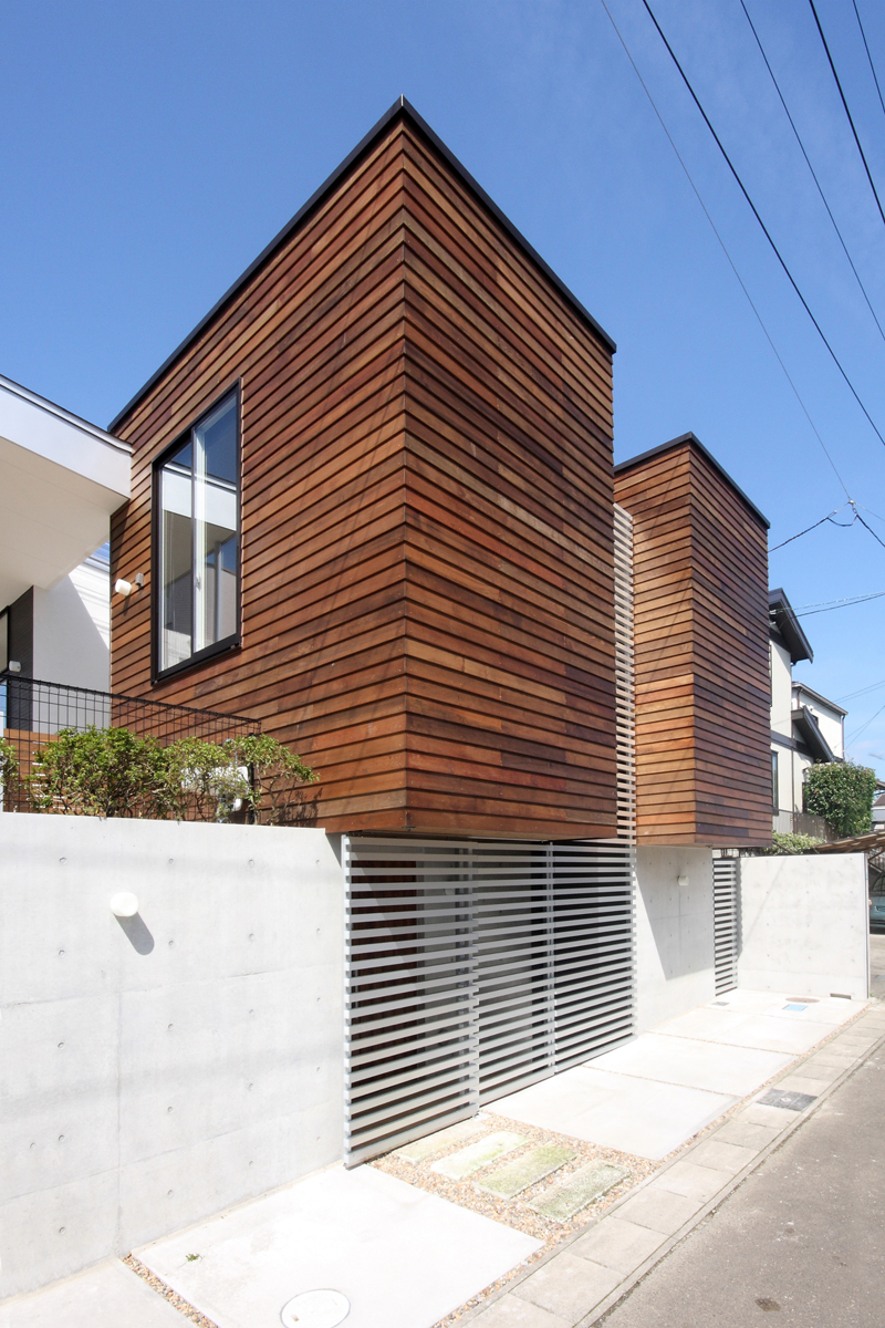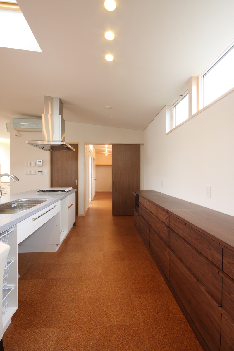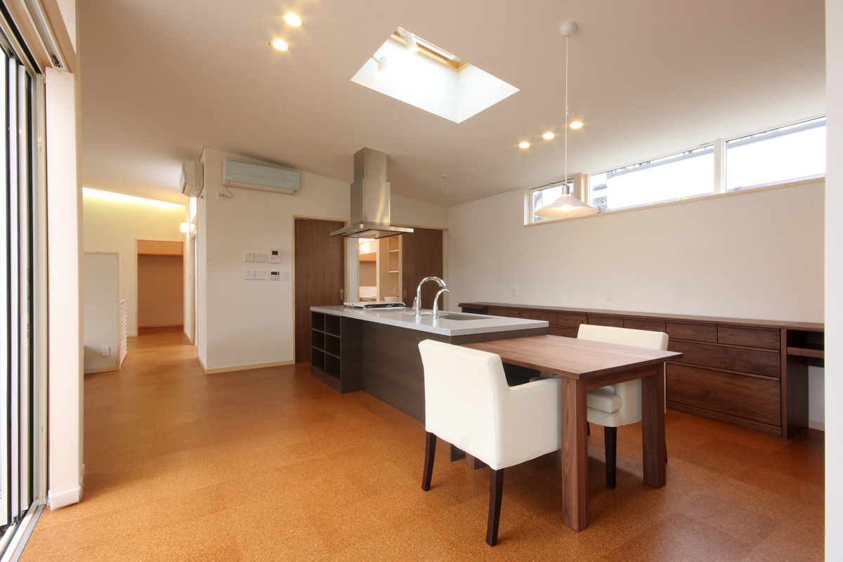 計画地は40年程前に造成された宅地で路と宅盤に玉石積で2mほどの高低差があり、築35年の家が建っていました。70坪ほどの平坦で広く明るい敷地を生かし平屋建ての伸びやかな空間を配置すると共に、外階段からの不便な出入りを解消するため一部を地下として道路レベルから家に出入りできるよう計画しました。道路側からの外観には窓を設けず、コンクリート打ち放しの新しい擁壁・温もりを感じる木貼の外壁とアルミのルーバーで構成し、閉鎖的でありながらも内部空間への期待を持たせ、同時にプライバシーの確保にも繋がっています。地下の玄関からルーバー越しのやわらかい光に導かれ1階へと上がると、明るく伸びやかなワンルームのような内部空間が広がります。フラットな平面にアルコーブテラスや中庭といった外部空間を配置することで内部空間同士や内と外が穏やかに繋がり、たっぷりの採光と通風が確保されます。こうした繋がりやキッチン・浴室等の水周りを中心とした回遊性のある空間は奥行と変化をもたらし、生活動線においてもコンパクトで効率的な計画となっています。