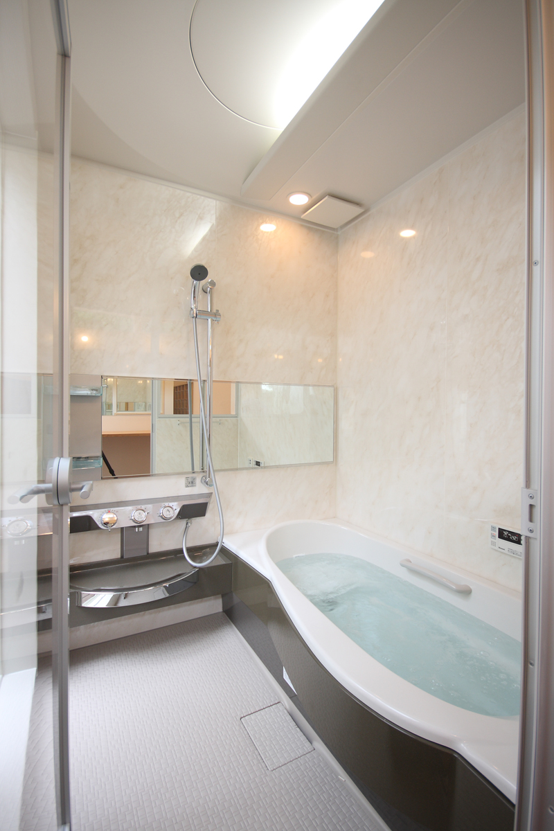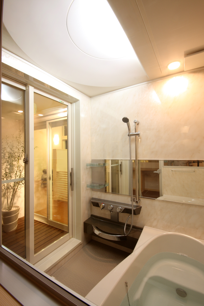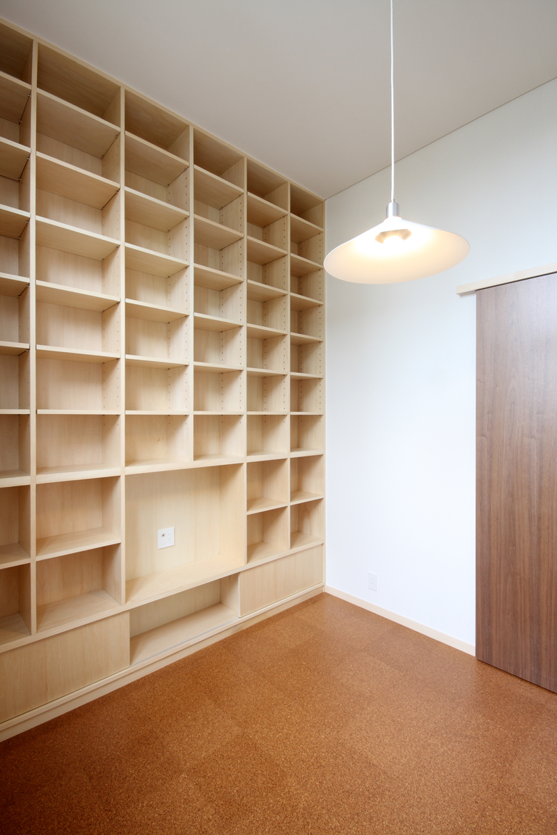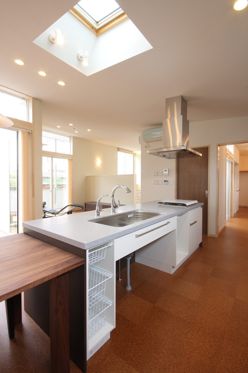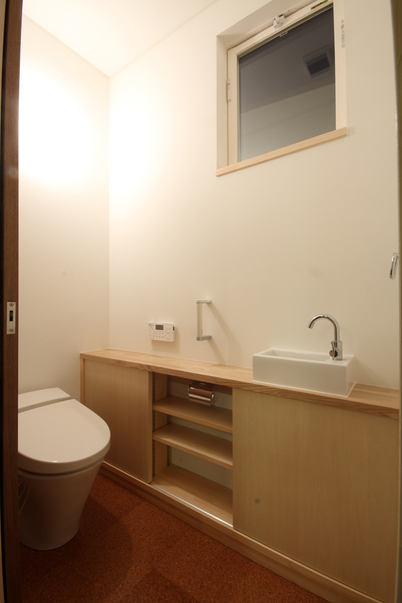 計画地は40年程前に造成された宅地で路と宅盤に玉石積で2mほどの高低差があり、築35年の家が建っていました。70坪ほどの平坦で広く明るい敷地を生かし平屋建ての伸びやかな空間を配置すると共に、外階段からの不便な出入りを解消するため一部を地下として道路レベルから家に出入りできるよう計画しました。道路側からの外観には窓を設けず、コンクリート打ち放しの新しい擁壁・温もりを感じる木貼の外壁とアルミのルーバーで構成し、閉鎖的でありながらも内部空間への期待を持たせ、同時にプライバシーの確保にも繋がっています。地下の玄関からルーバー越しのやわらかい光に導かれ1階へと上がると、明るく伸びやかなワンルームのような内部空間が広がります。フラットな平面にアルコーブテラスや中庭といった外部空間を配置することで内部空間同士や内と外が穏やかに繋がり、たっぷりの採光と通風が確保されます。こうした繋がりやキッチン・浴室等の水周りを中心とした回遊性のある空間は奥行と変化をもたらし、生活動線においてもコンパクトで効率的な計画となっています。