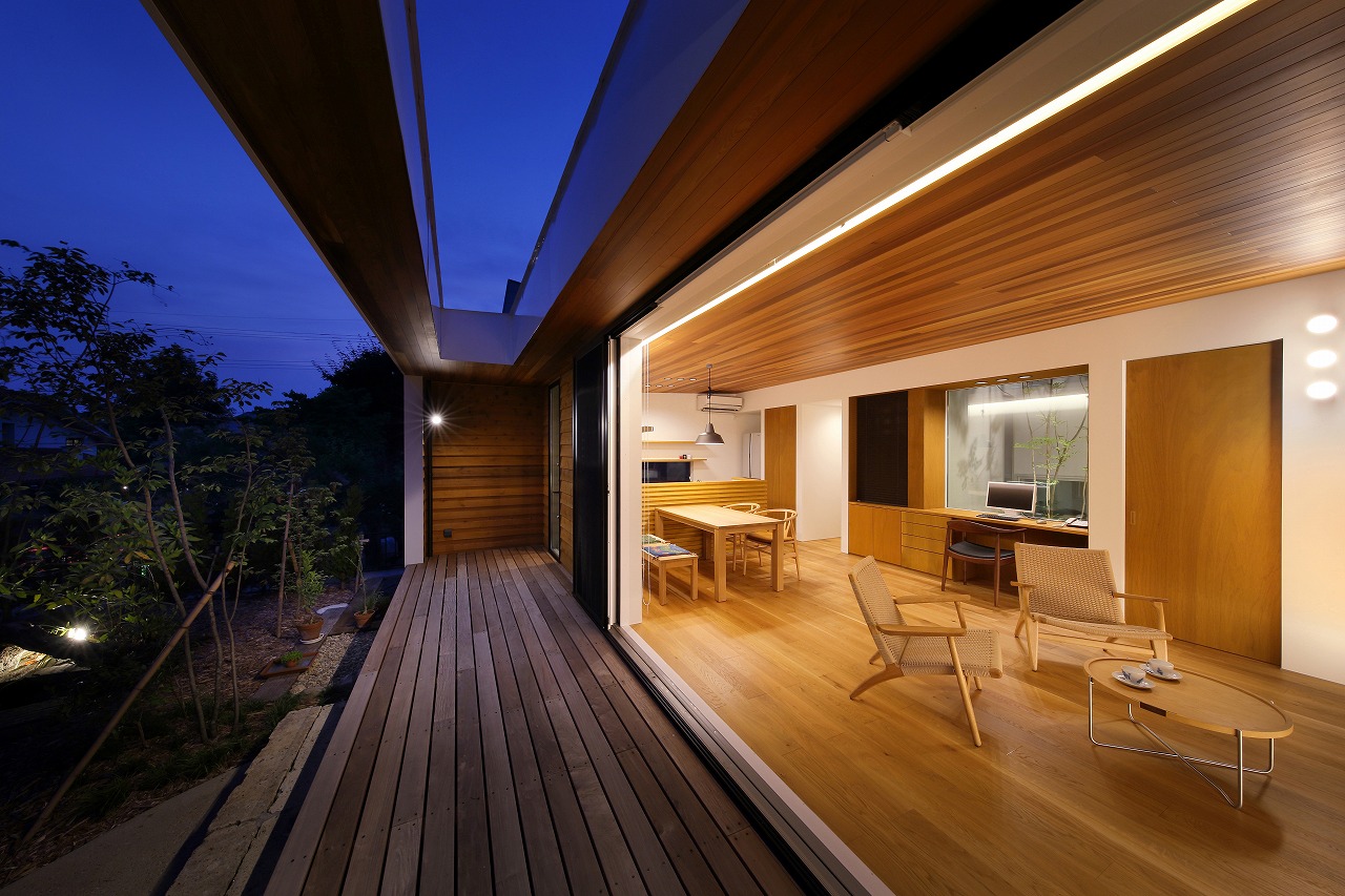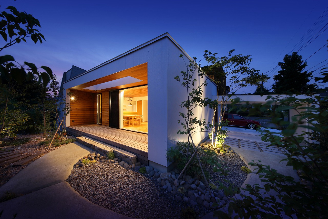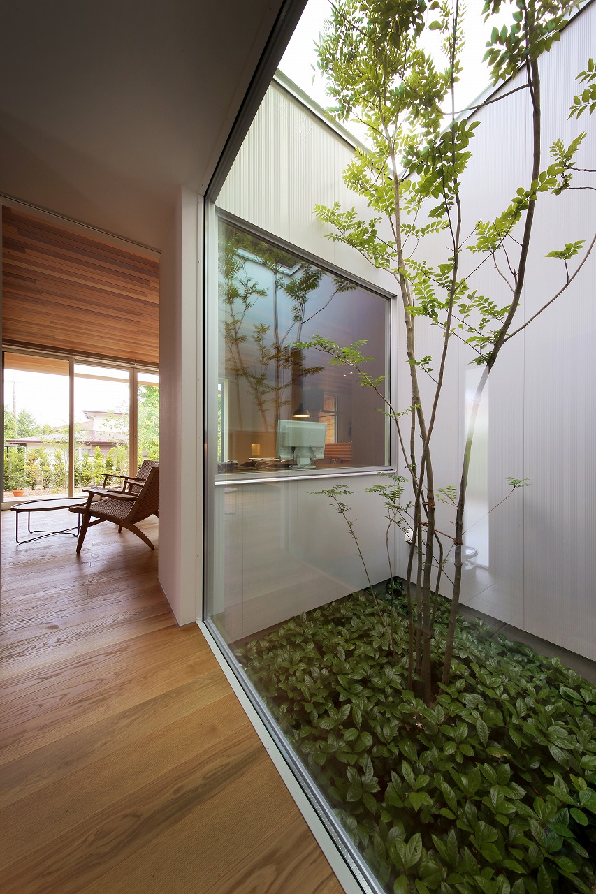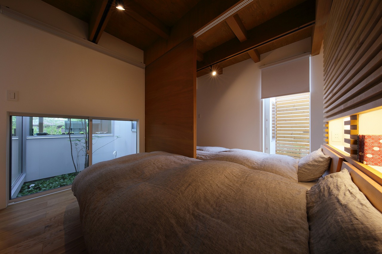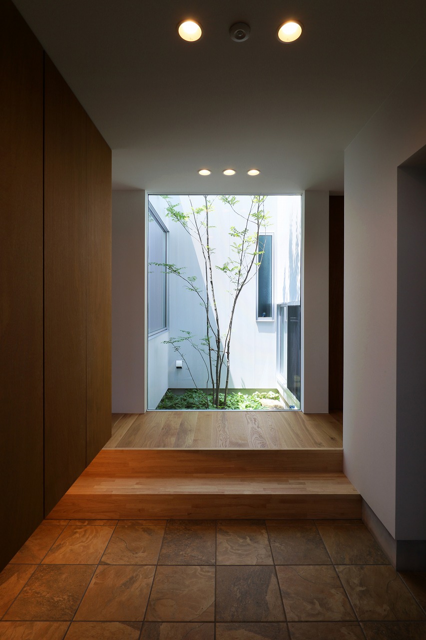 家事動線をコンパクトにし、光庭を中心に回遊性のある動線となっています。光庭を設けることで、北側に配置された寝室に白い外壁に反射されたやわらかい南の光を運んでくれます。また、玄関・LDK・寝室・トイレと4室に光庭が面する事で、それぞれの空間に広がりや演出、換気など様々な効果をもたらしてくれます。延床面積29.5坪とコンパクトながらも狭さを感じさせないためにも光庭が重要な役割を果たしています。
