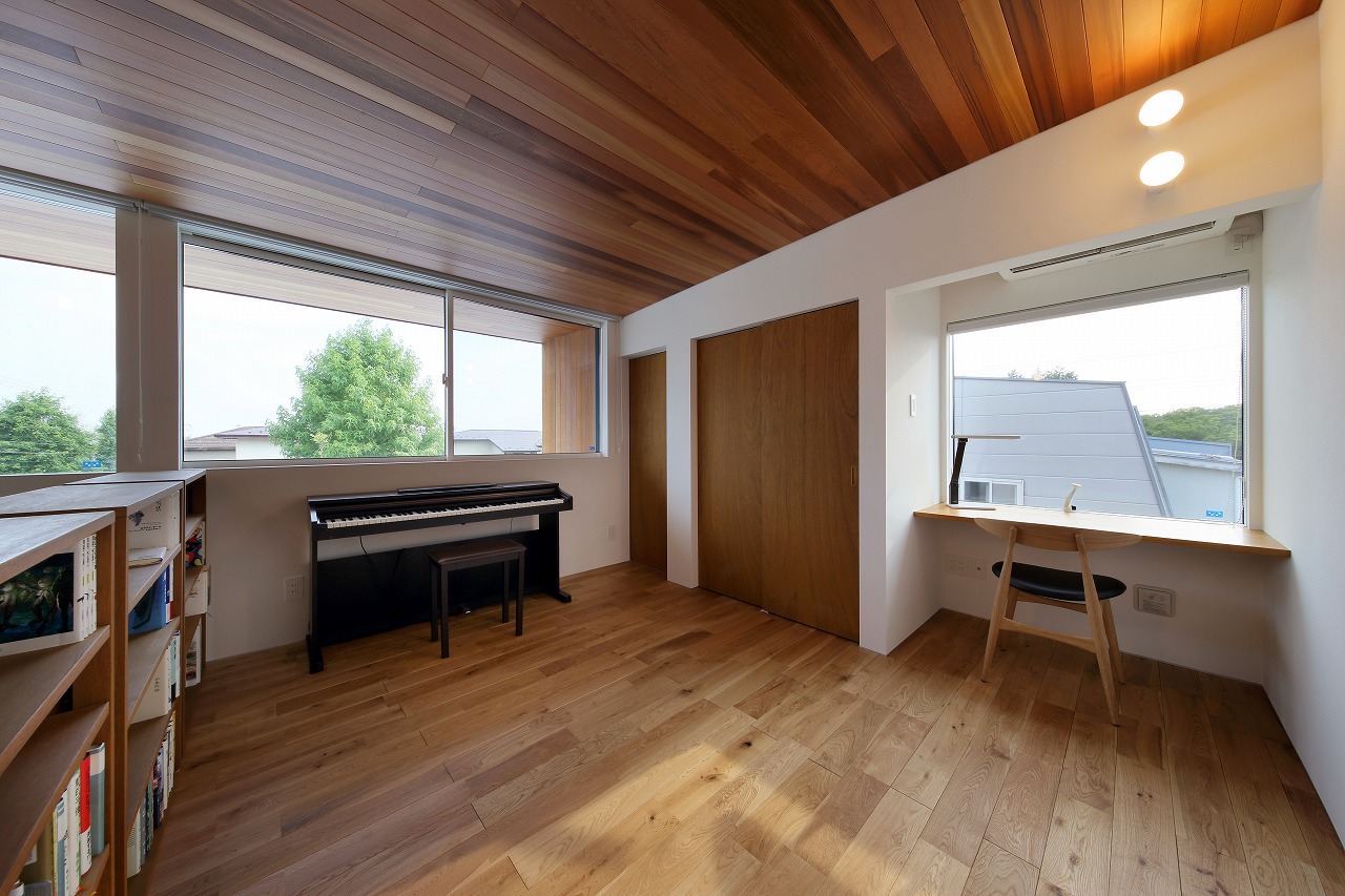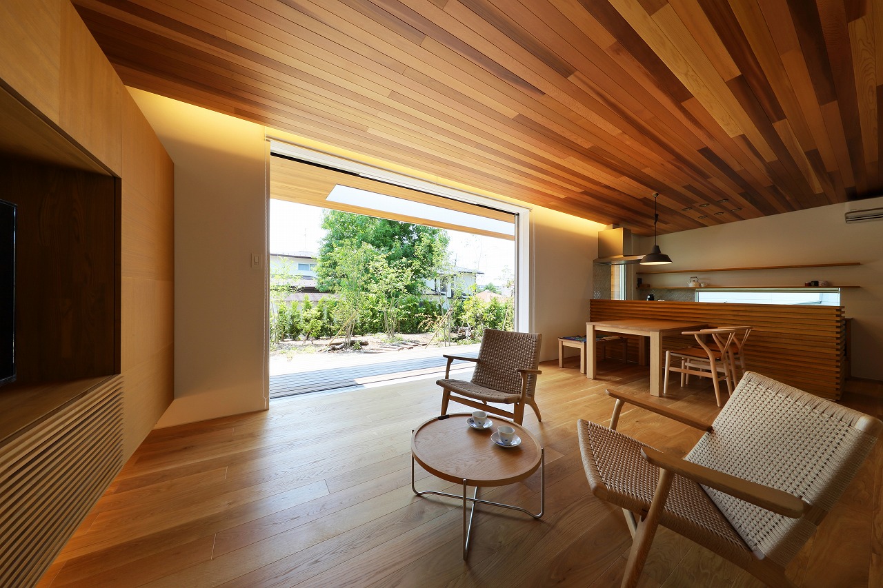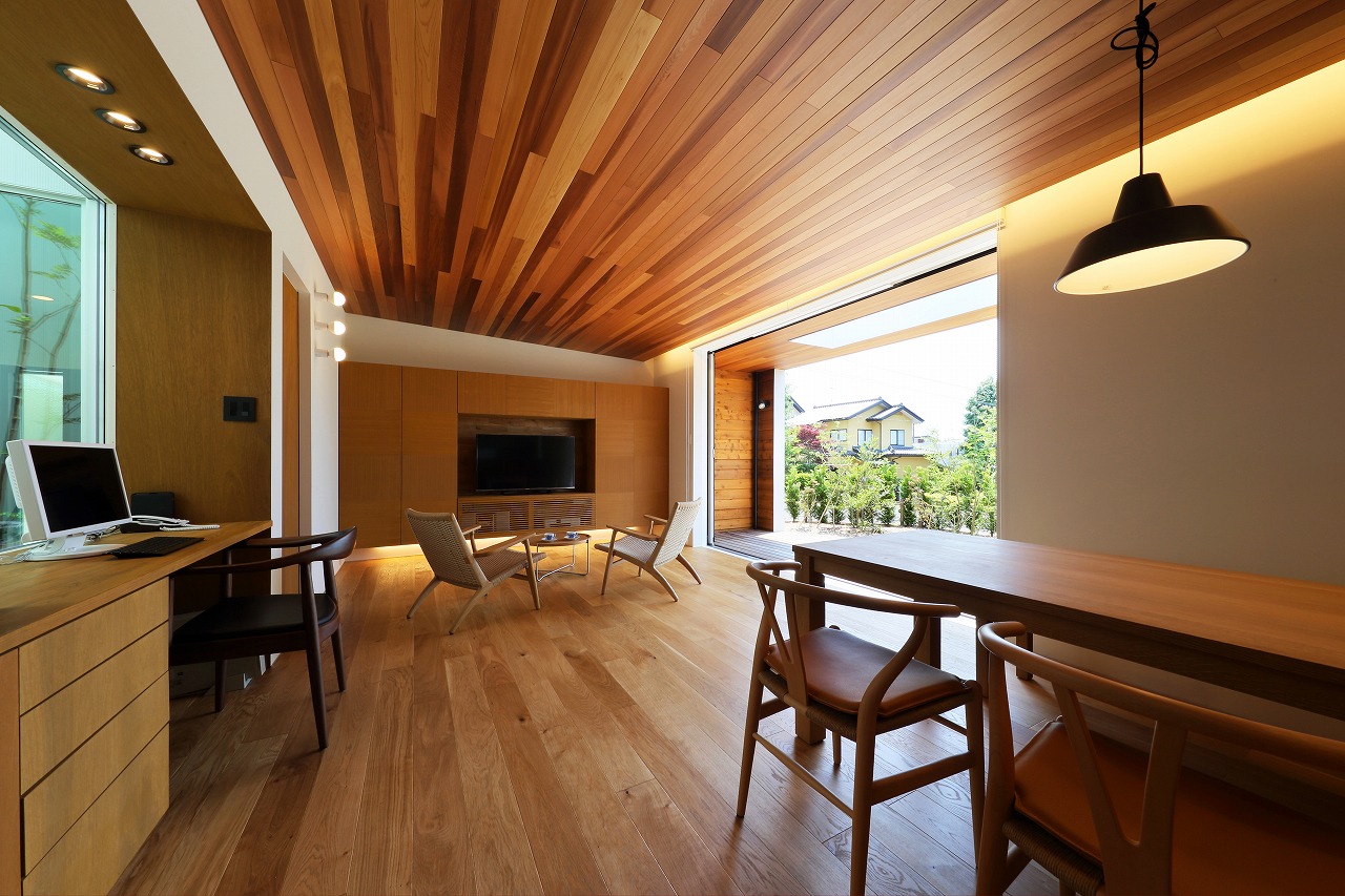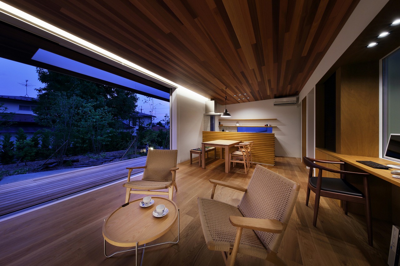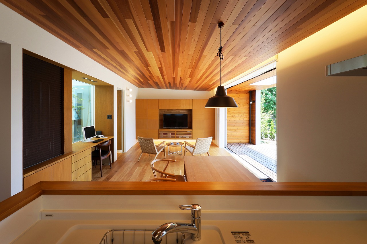コンパクトにまとめる中で、天井を低くして空間の高さも抑えています。通常よりもボリュームを抑えることで建築コストを圧縮し、仕上げなどにこだわるための予算を生み出すこともできました。また、窓や製作家具の配置で視線の方向をコントロールすることで、低さを感じないようにしています。