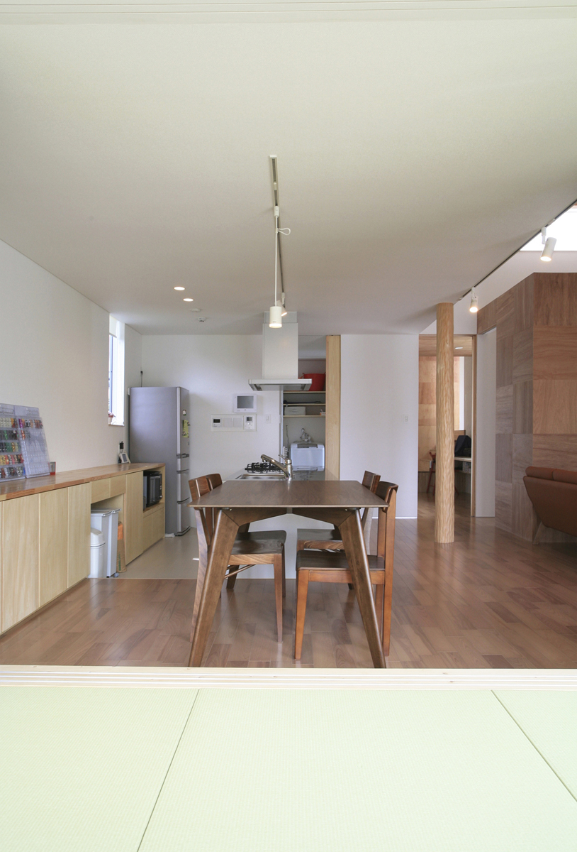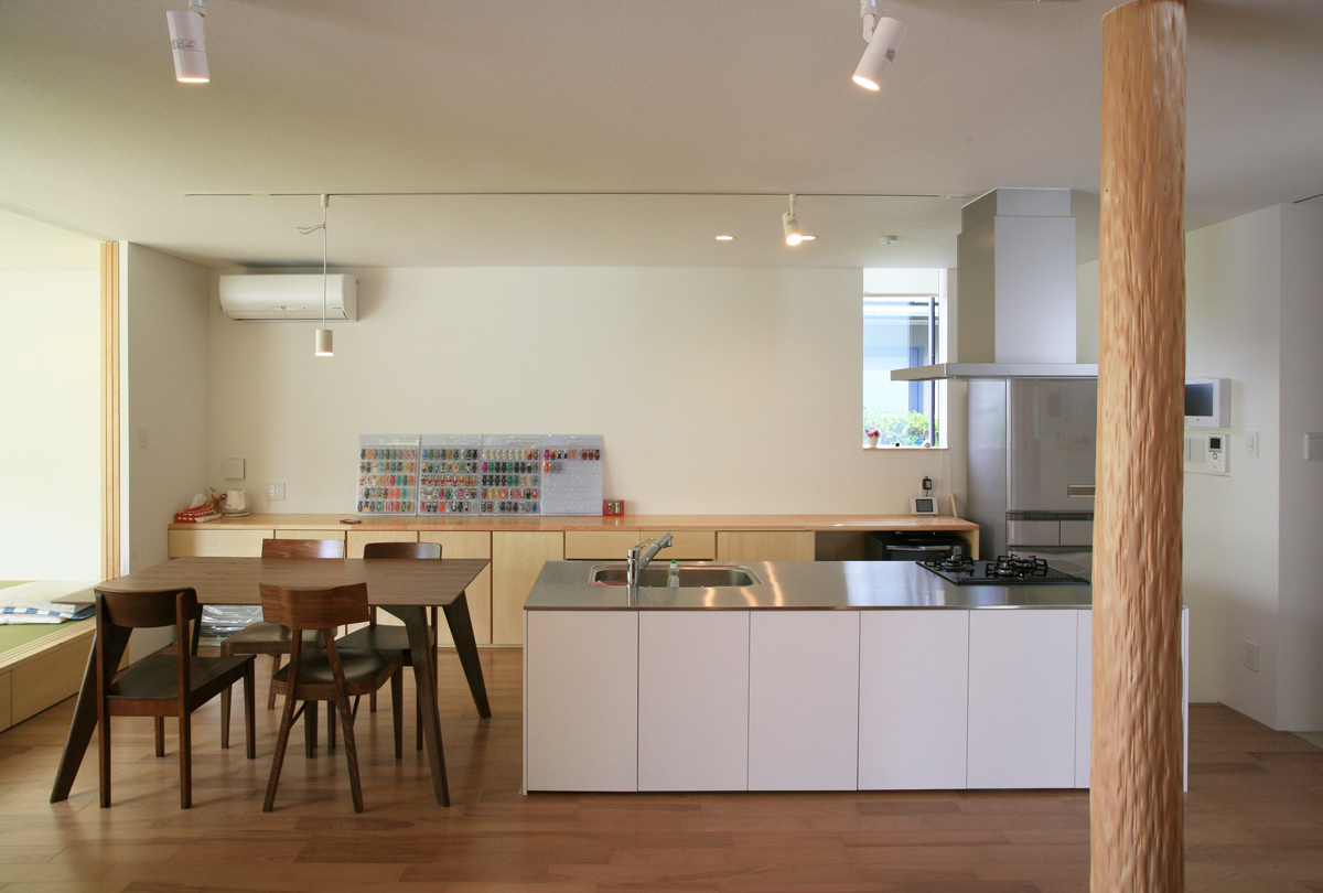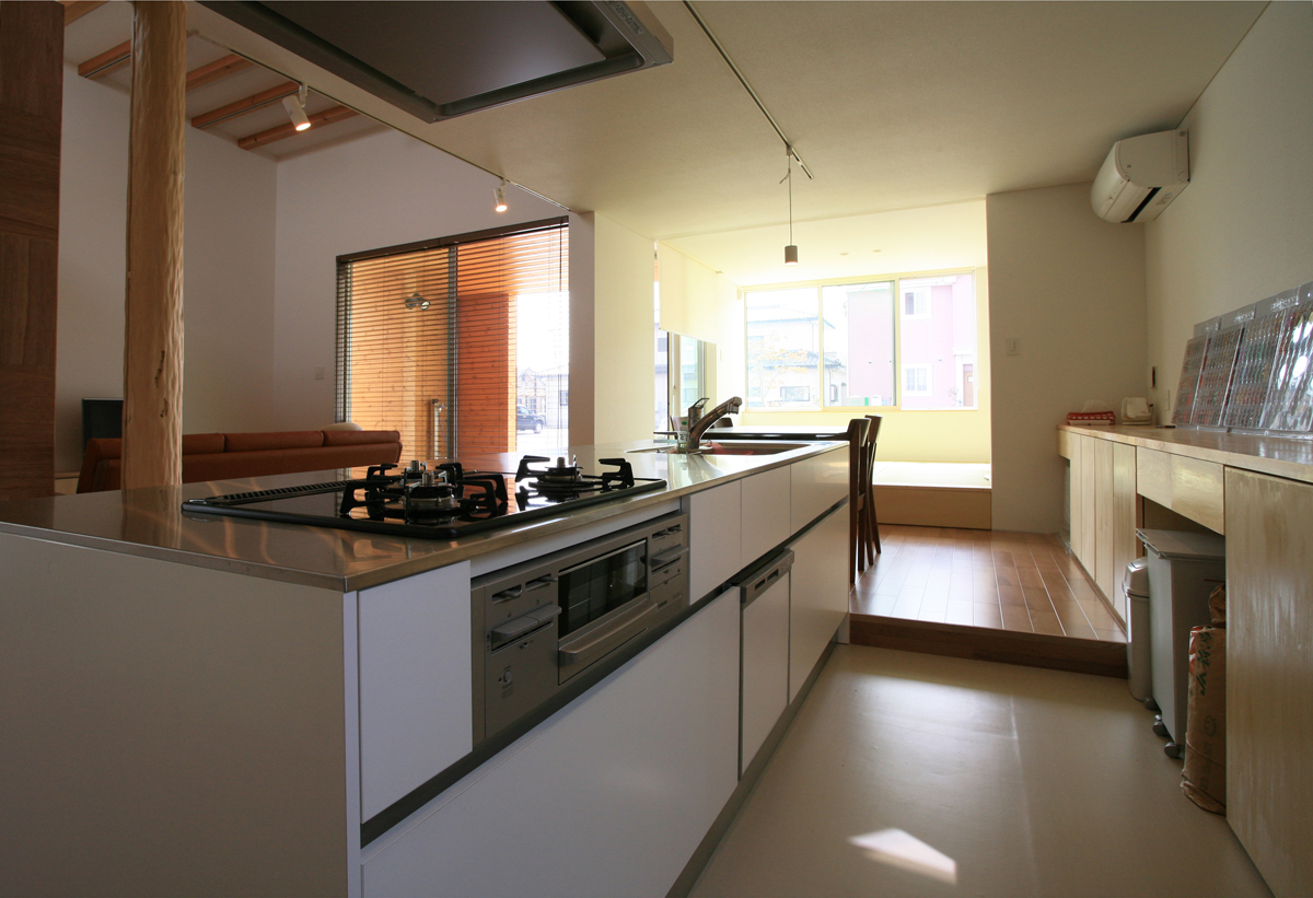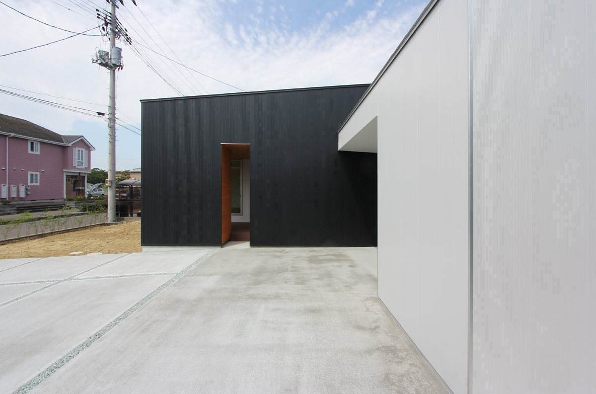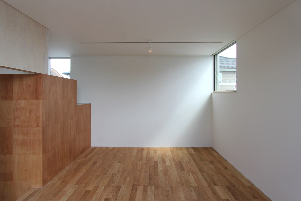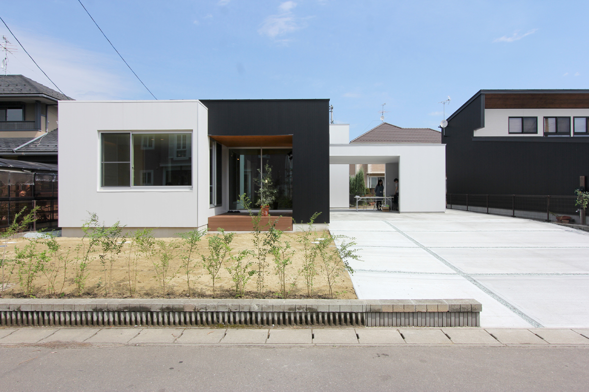 計画地は閑静な住宅地にある。広々とした敷地に平屋の建物を計画した。全体的に平屋だが、一部床を上げ、下部を収納、上部を居室として利用した「1.5層」の平屋である。床を一部高くすることによって生まれた床下スペースを内外から利用できる収納とし、外部収納は施主の趣味である自転車なども納められるようになっている。また、平屋の中に、一部レベルの高いスペースを作ることによって、万が一の水害などにも対応できるものとした。