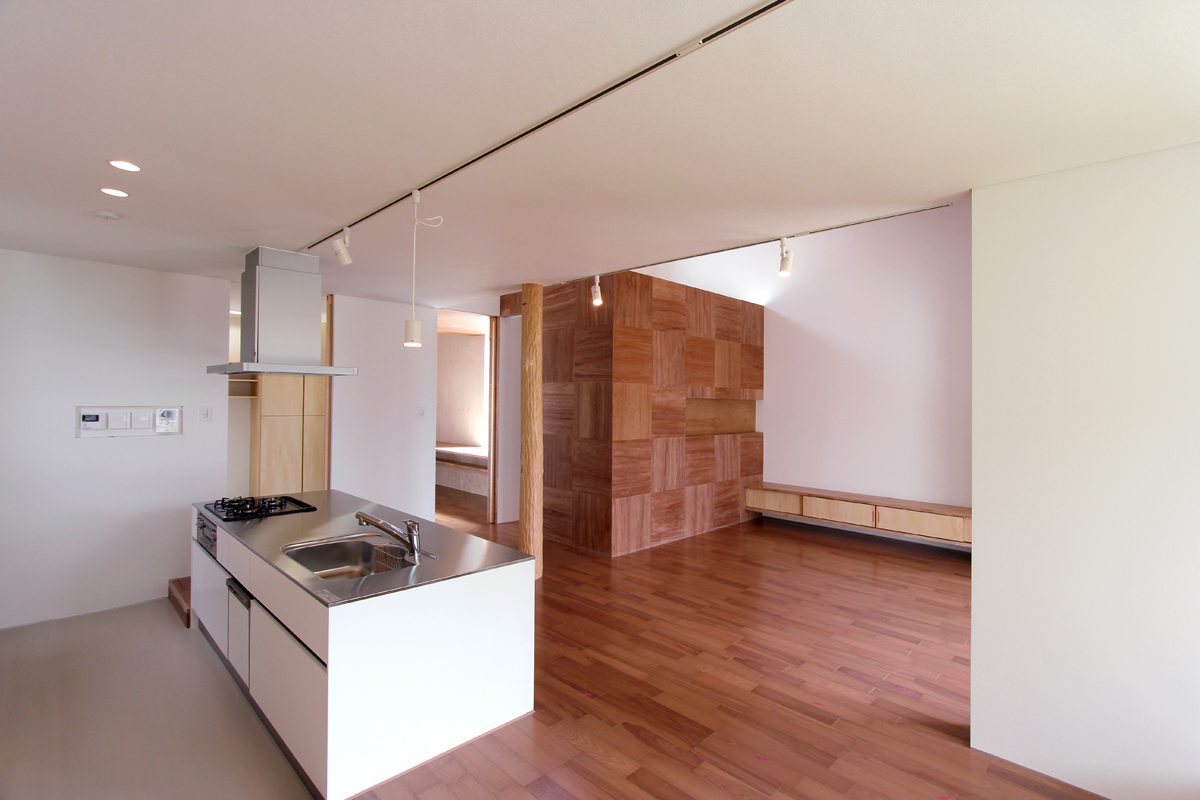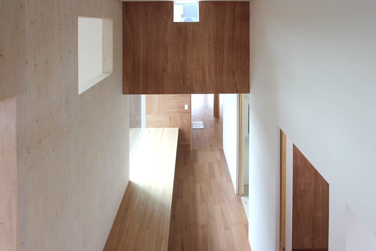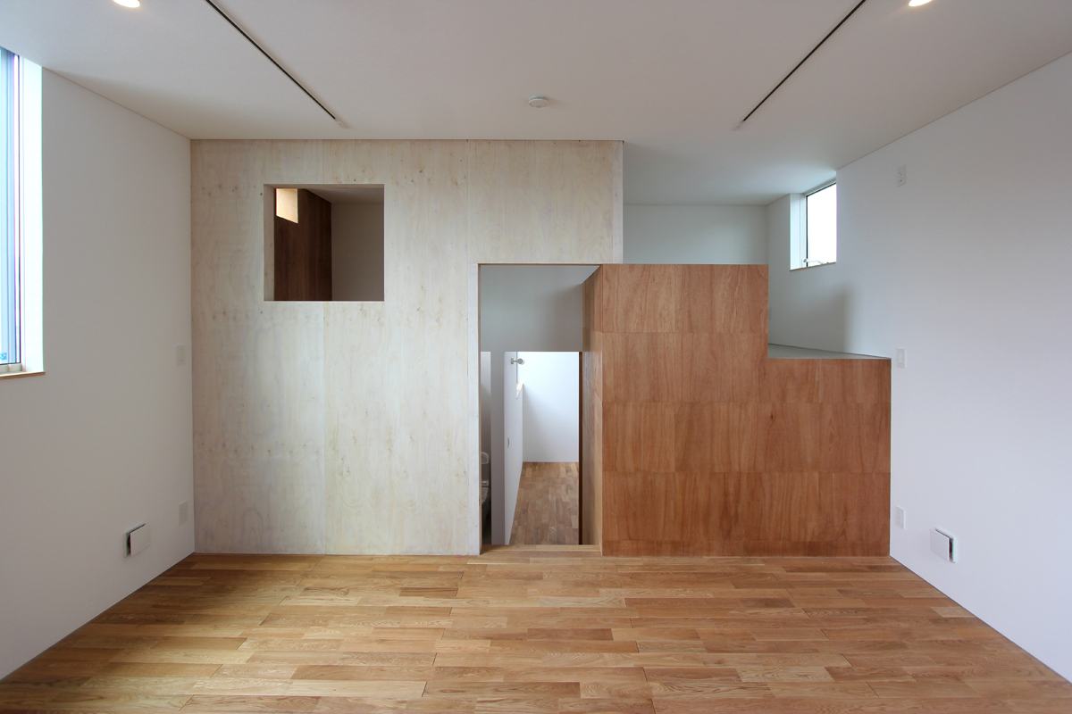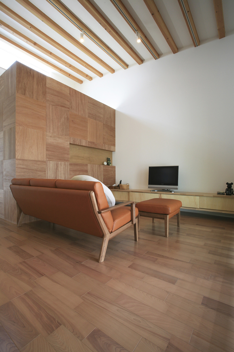 プランは、南側に共有スペースを配置し、北側にプライベートスペースを集約させた。外観は、4つのブロックにわけて構成されたデザインとなっており、四角いハコを組み合わせたイメージとなっている。内部には複数のWood boxやWood wallが点在し、空間に変化を与えている。