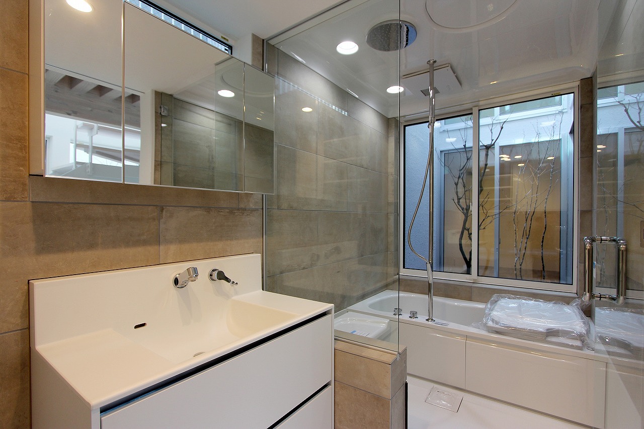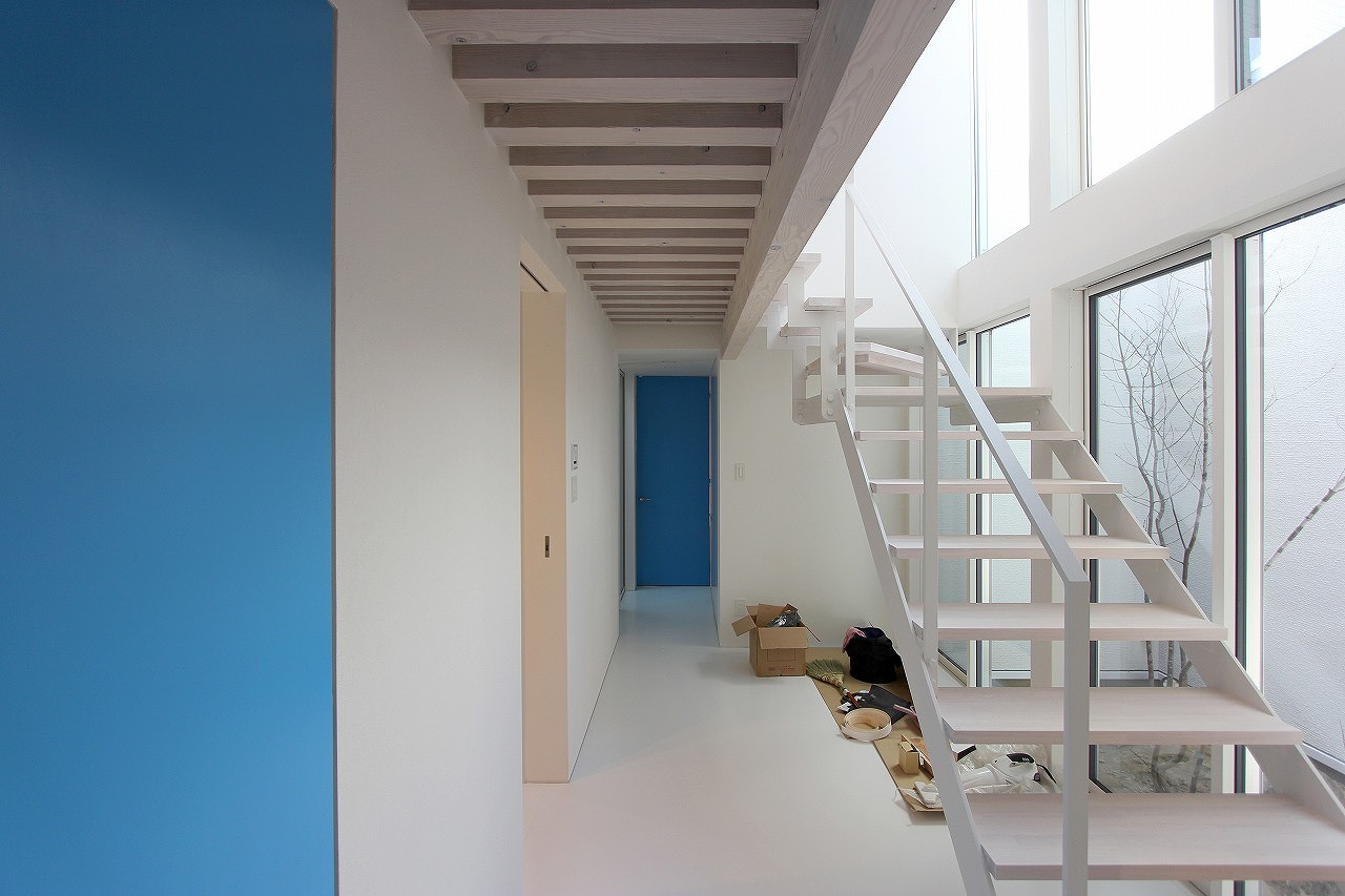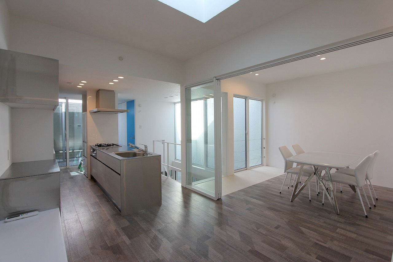 計画地は、古い町で商店などが点在するエリアである。計画地周囲も昔は商店であり、建替えが少しずつ始まり現在は専用住宅へと変わった建物が多くある。そのような事から計画地は道路に対して間口が狭く、東西の元商店であった隣家に挟まれた狭小地である。狭小地であるため有効的な敷地利用が求められた。そこで計画地全体に建築を広げ、建築内部に庭を配置する中庭型の住宅を提案した。中庭型とすることで、敷地全体を建築とすることが可能となり隣地からの影響を受けにくい。また、プライバシーを確保しながら大胆に外部(中庭)とつながることが可能となるので、採光や通風も良好なものとなる。計画地周辺は緑も少なく、好んで見たい景観もない。しかし中庭とすることで窓からは好きな植物と空が見え、景色もコントロール出来る。狭小地でありながらも残された外部空間を最大限に利用することで、建蔽率以上の空間が広がり、狭さを感じさせない住宅となっている。