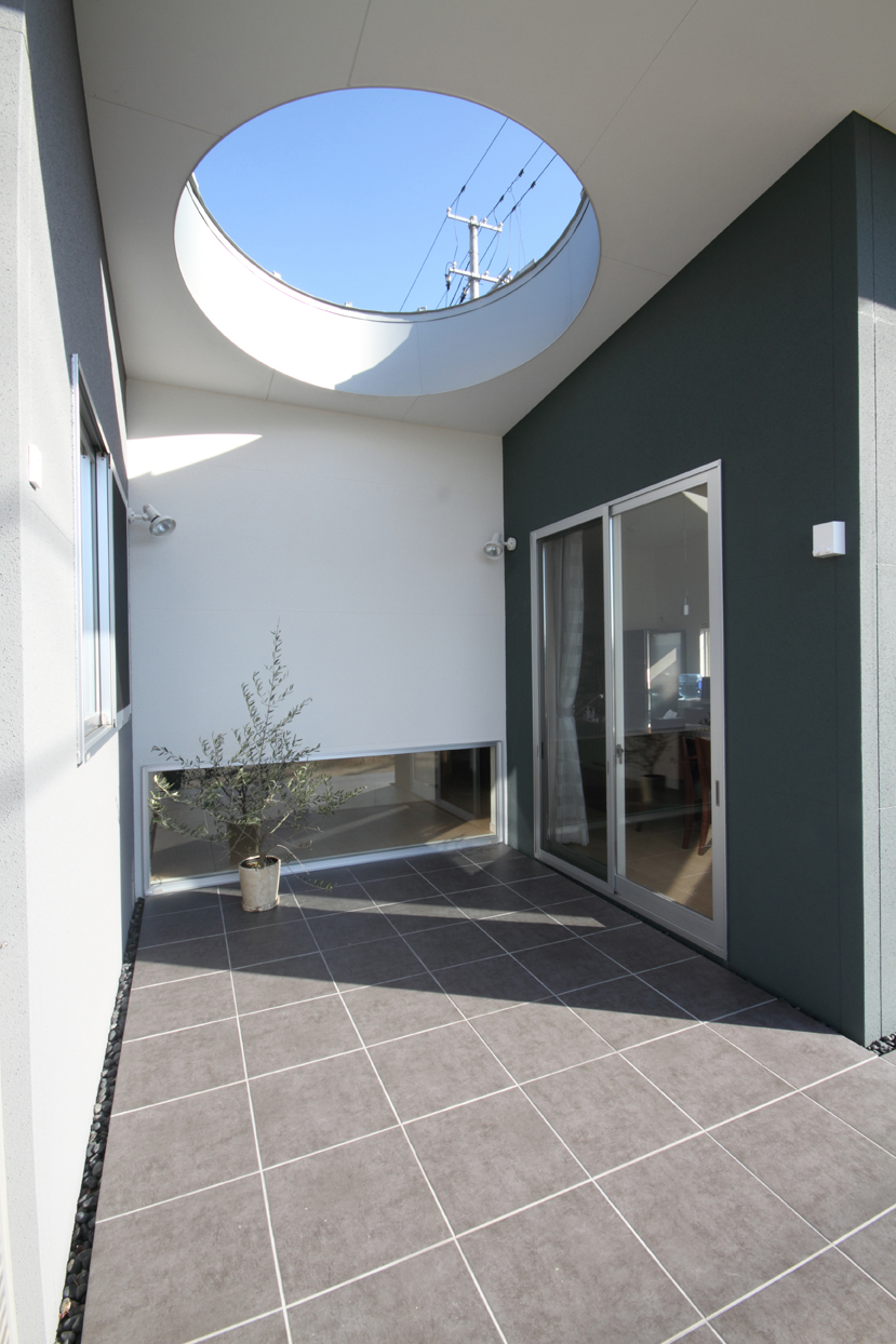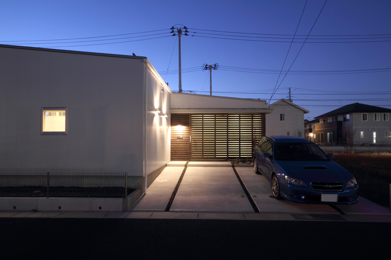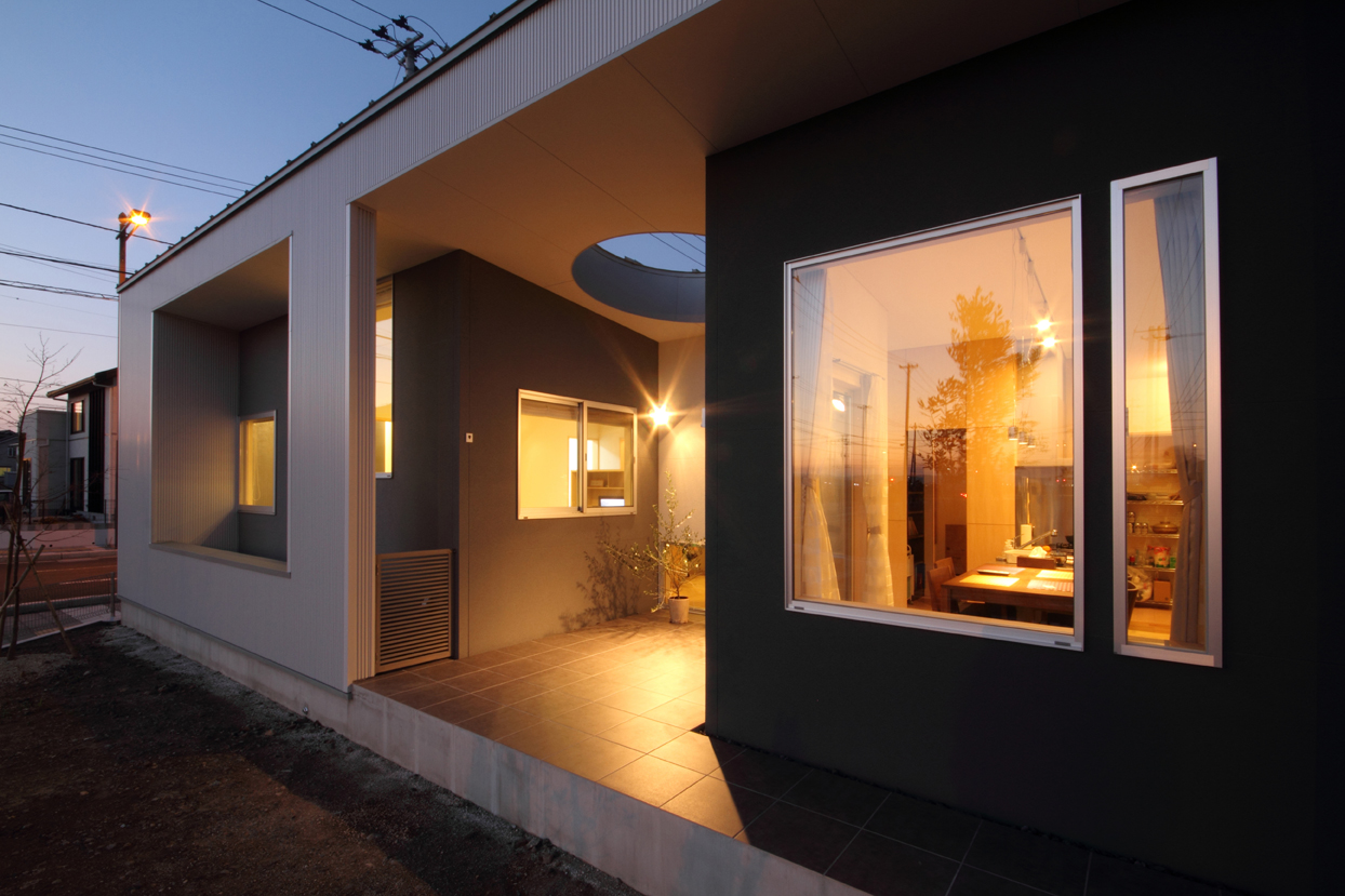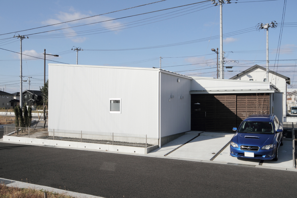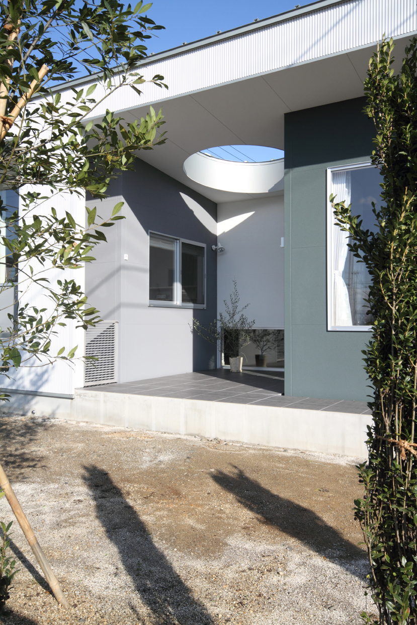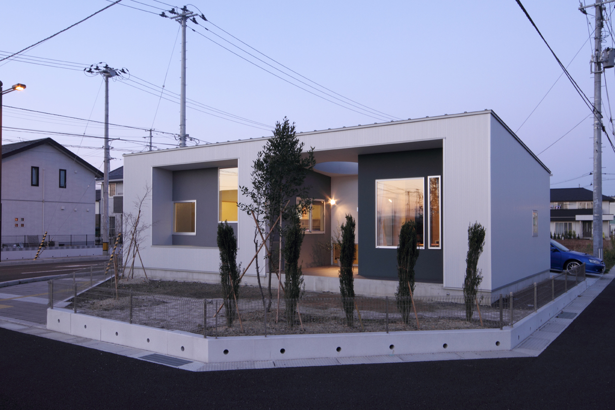 3方を道路で囲まれた敷地に配置した平屋には外壁で作られるフレームの中にドッグヤードやアルコーブテラスとなる奥行きの違う外部空間を設け、家の表情に奥行きと落ち着きを与えています。南側のテラスを中心とした明るいLDKと家の真ん中にある坪庭によって明るく風通しの良い玄関や浴室など外と中との繋がりを大切にしました。また、廊下の無い構成によって無駄な空間を排除し、コンパクトで使いやすい間取りとなるよう配慮しました。
