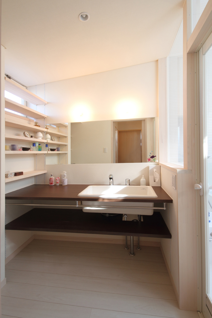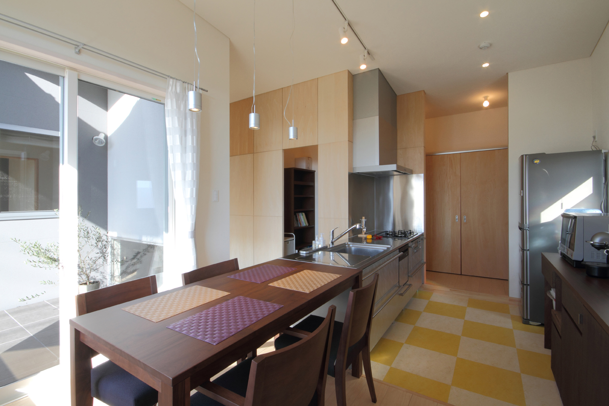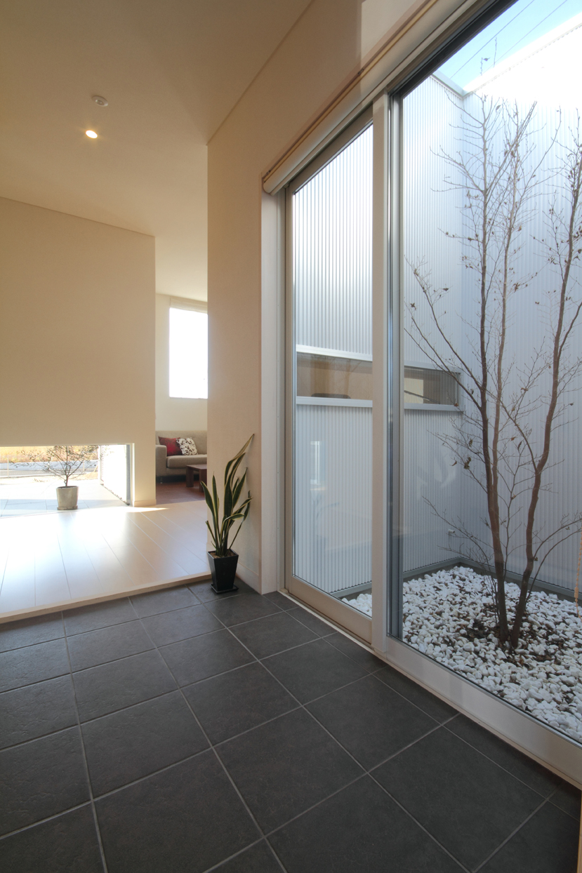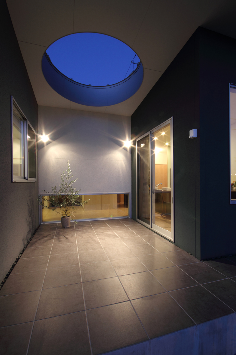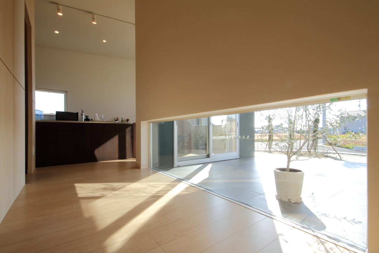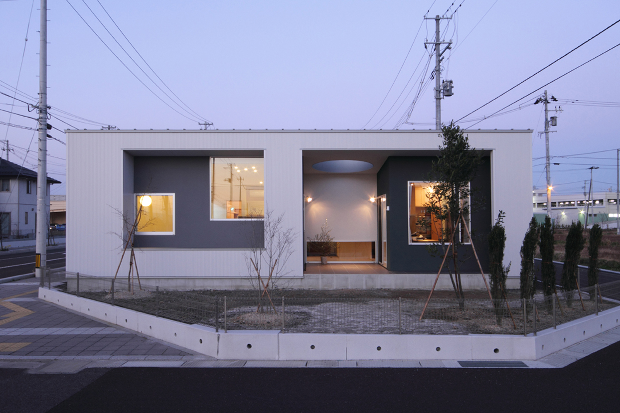 3方を道路で囲まれた敷地に配置した平屋には外壁で作られるフレームの中にドッグヤードやアルコーブテラスとなる奥行きの違う外部空間を設け、家の表情に奥行きと落ち着きを与えています。南側のテラスを中心とした明るいLDKと家の真ん中にある坪庭によって明るく風通しの良い玄関や浴室など外と中との繋がりを大切にしました。また、廊下の無い構成によって無駄な空間を排除し、コンパクトで使いやすい間取りとなるよう配慮しました。