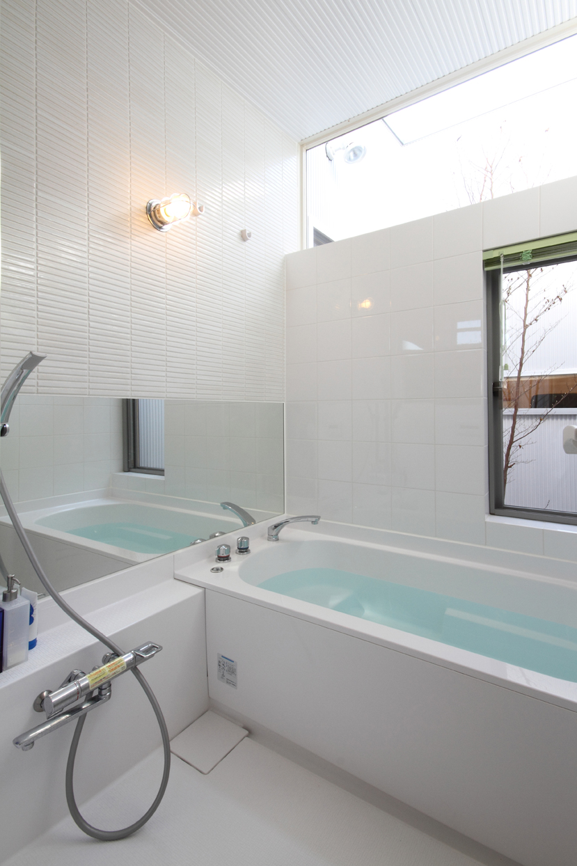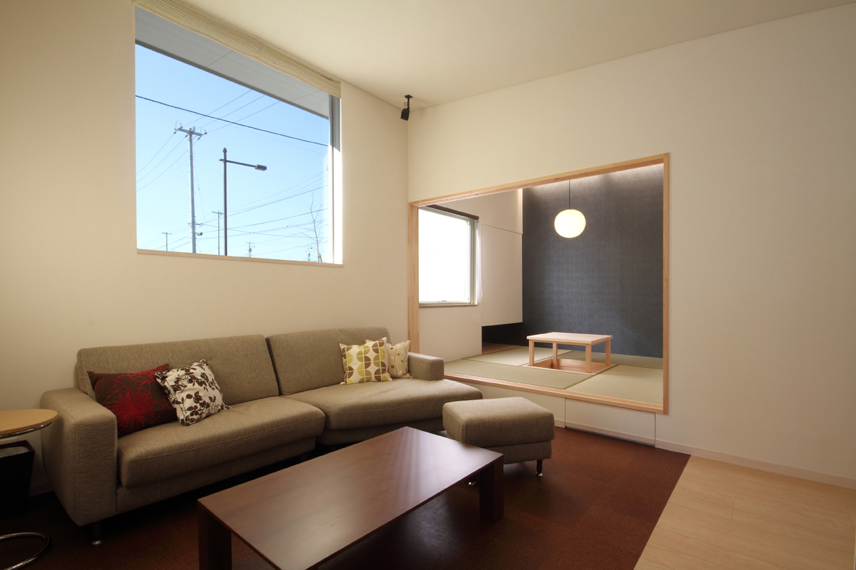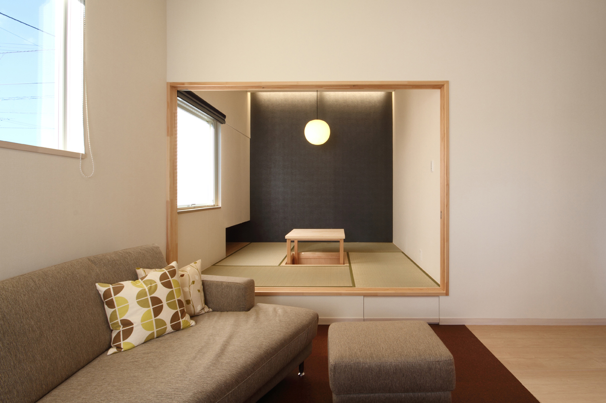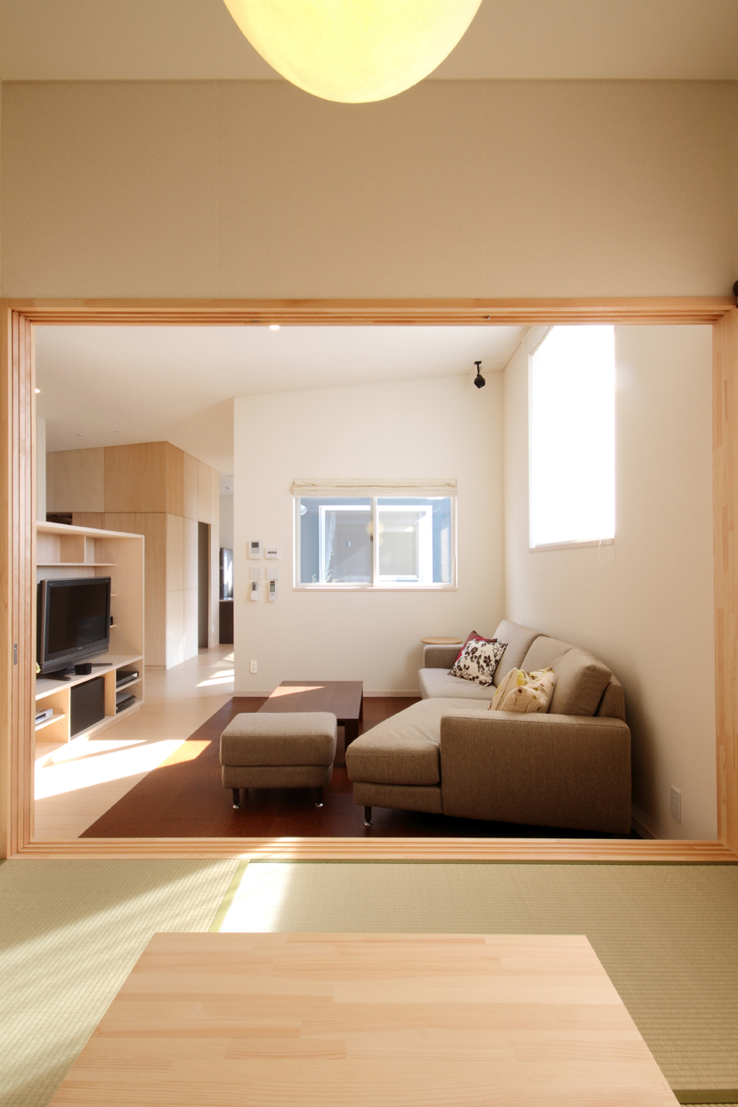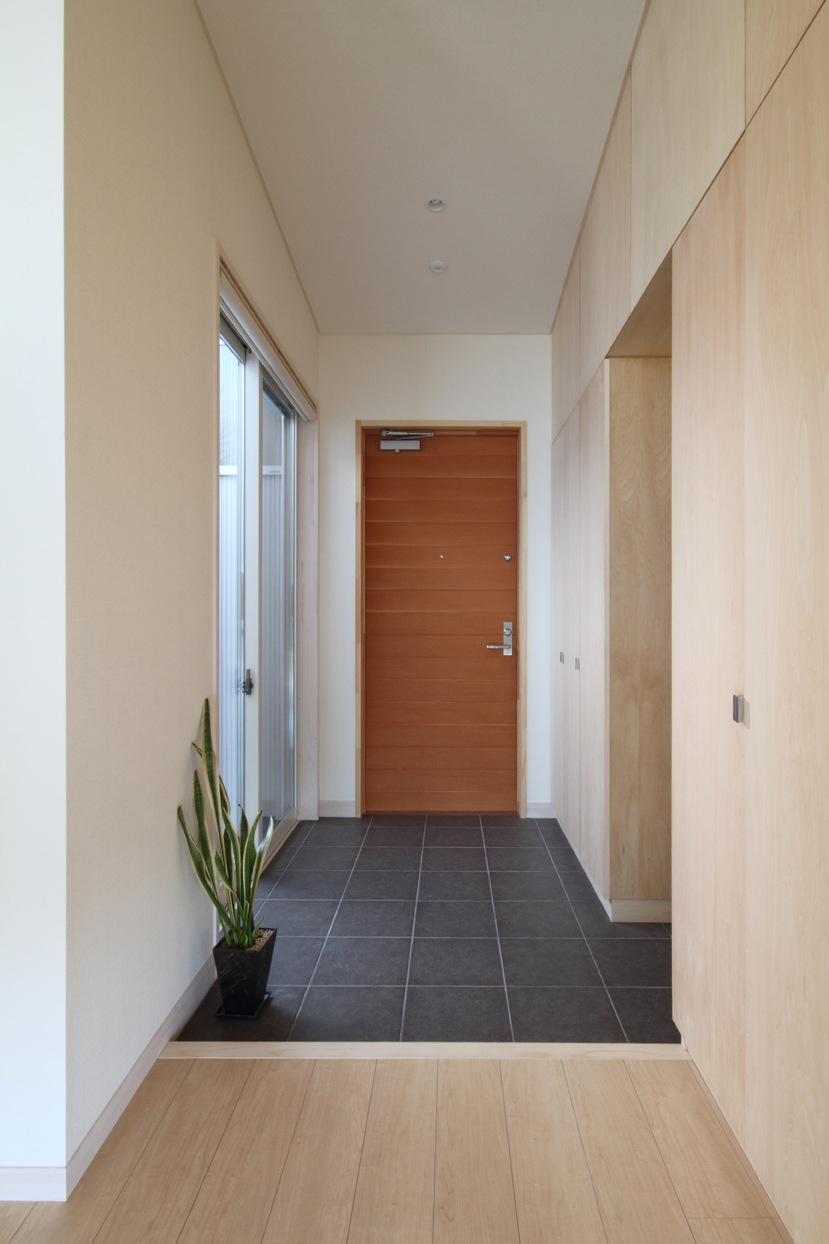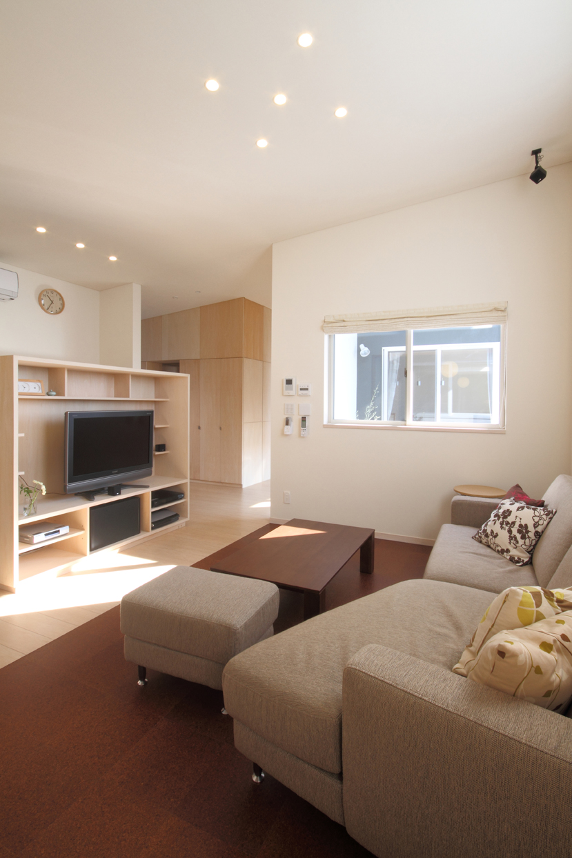3方を道路で囲まれた敷地に配置した平屋には外壁で作られるフレームの中にドッグヤードやアルコーブテラスとなる奥行きの違う外部空間を設け、家の表情に奥行きと落ち着きを与えています。南側のテラスを中心とした明るいLDKと家の真ん中にある坪庭によって明るく風通しの良い玄関や浴室など外と中との繋がりを大切にしました。また、廊下の無い構成によって無駄な空間を排除し、コンパクトで使いやすい間取りとなるよう配慮しました。
