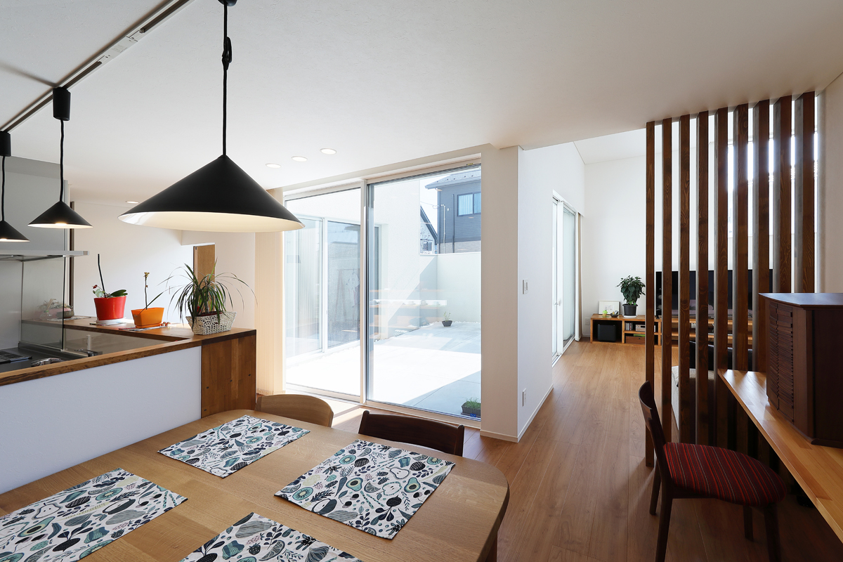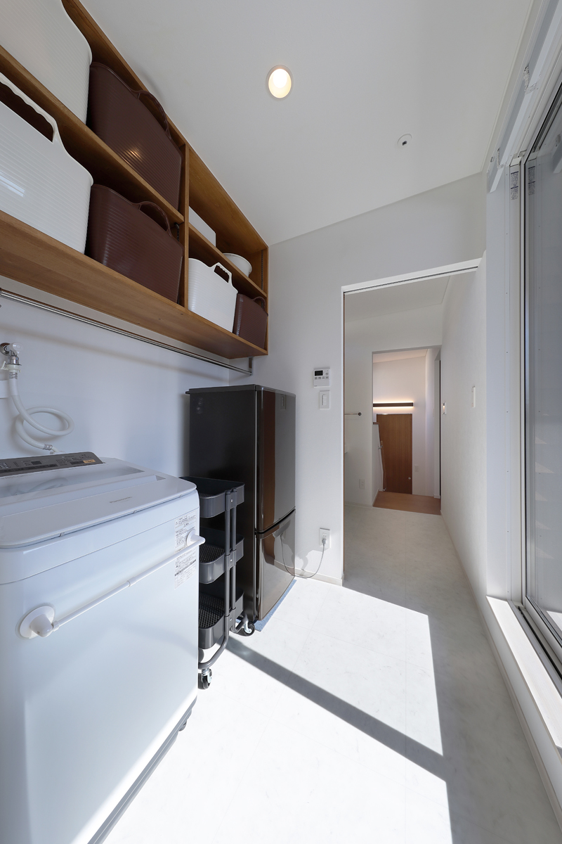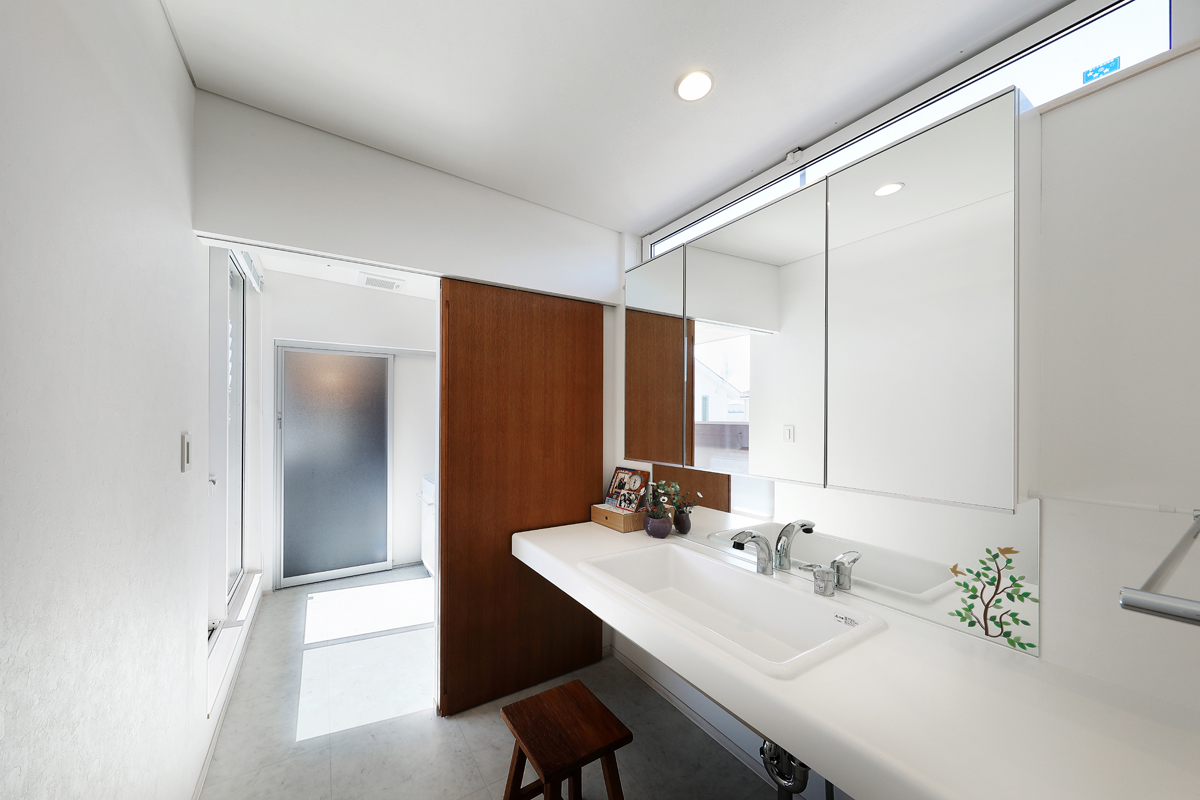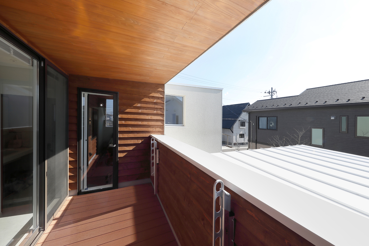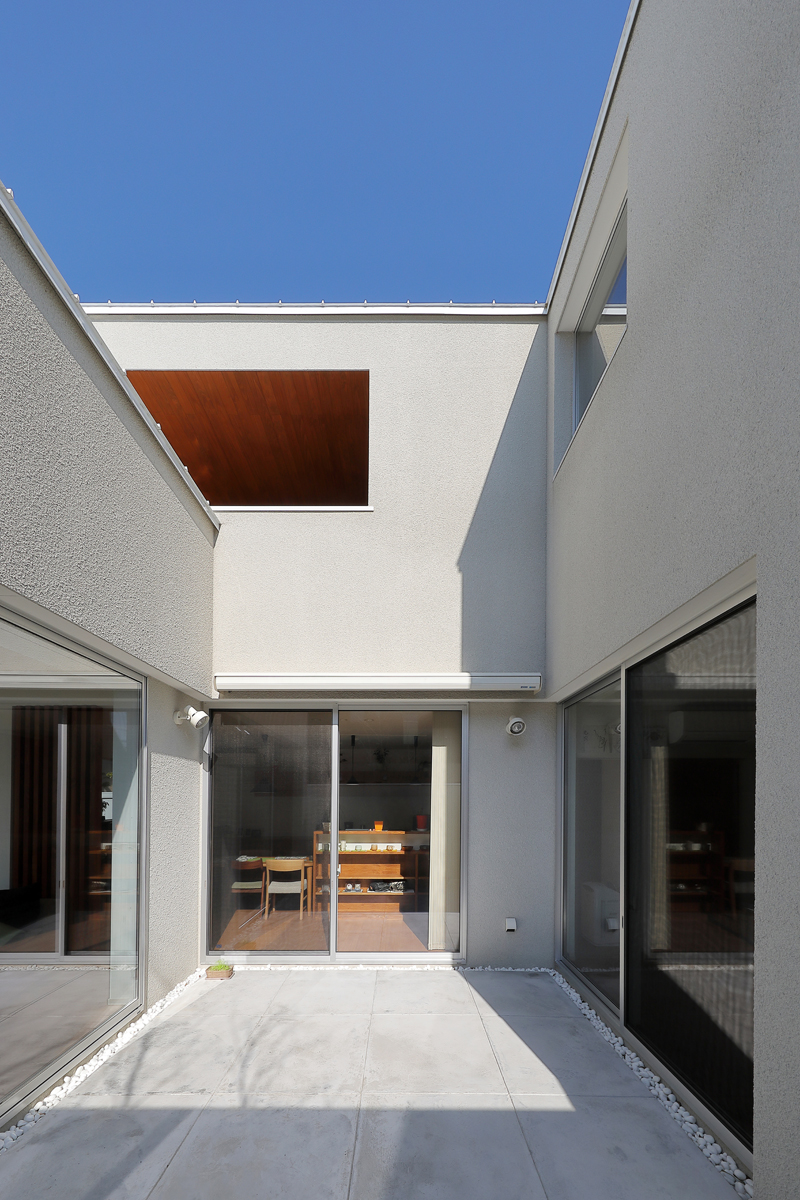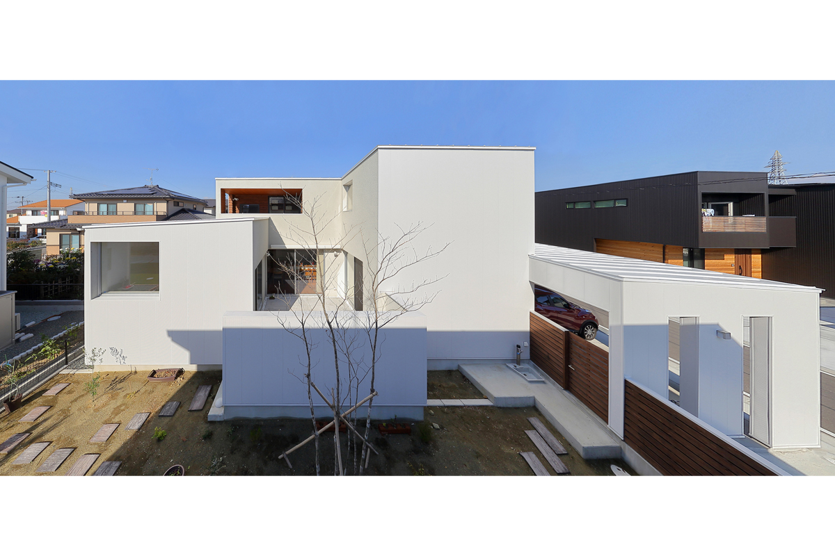 計画当時は造成中で、たくさんの建物が同時に建つことが予想されたため、周辺にどのような建物が建つか想定しながら配置を決めていきました。半中庭を設けることで、周辺からの視線を遮りつつ開放的な空間を実現させています。また、共働きであることから家事にかける負担を減らすため、水回りを2階にまとめて洗濯・物干し・収納の家事動線をシンプルにしました。