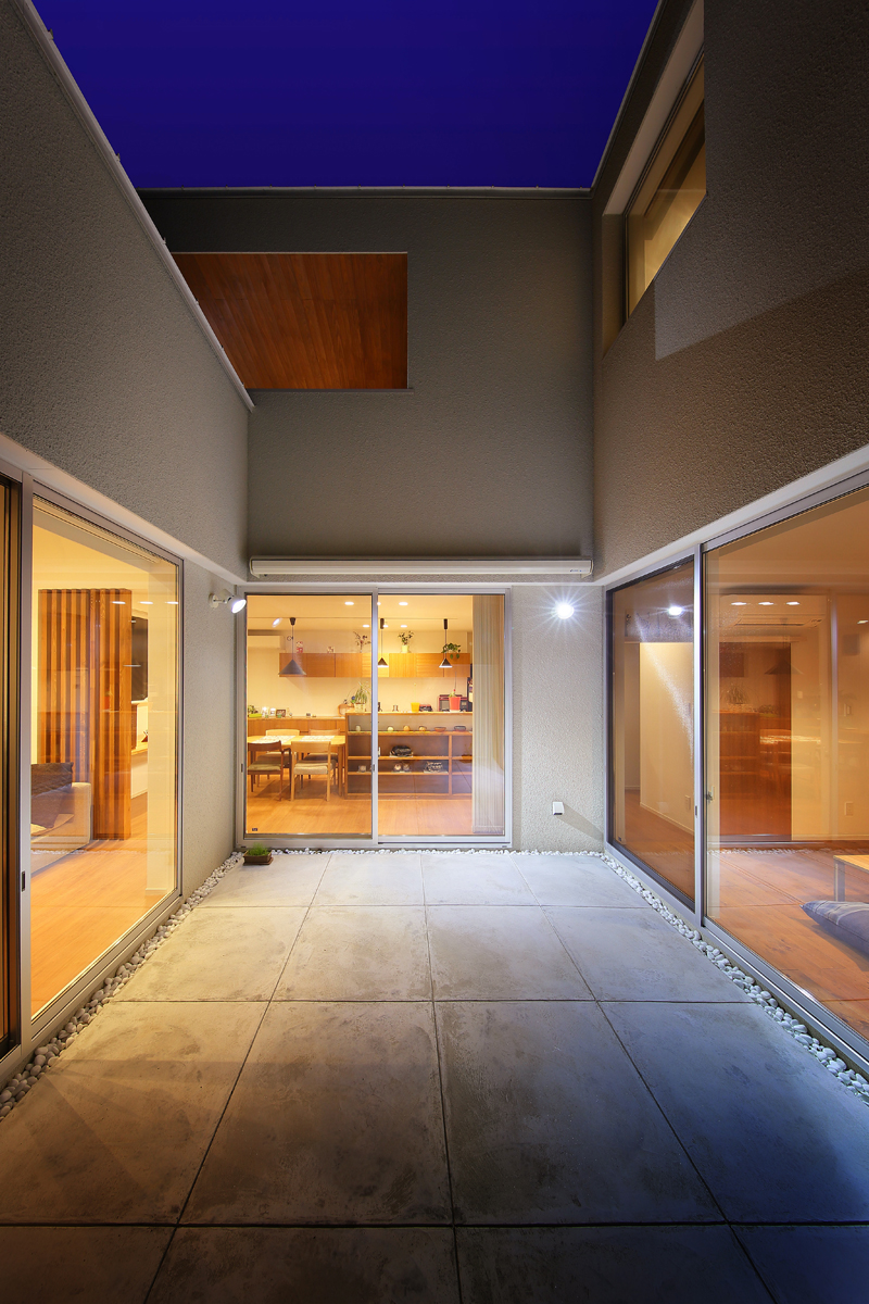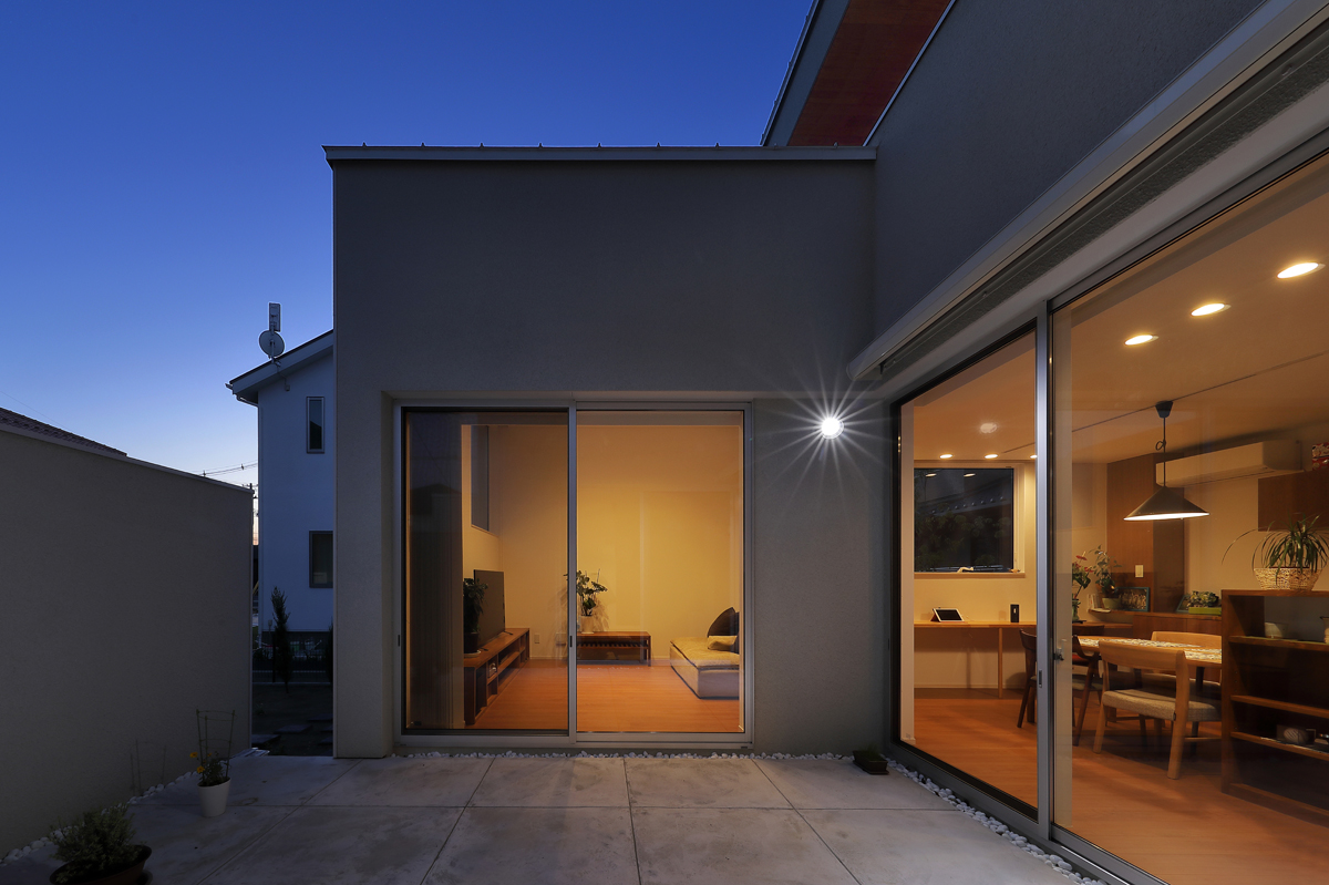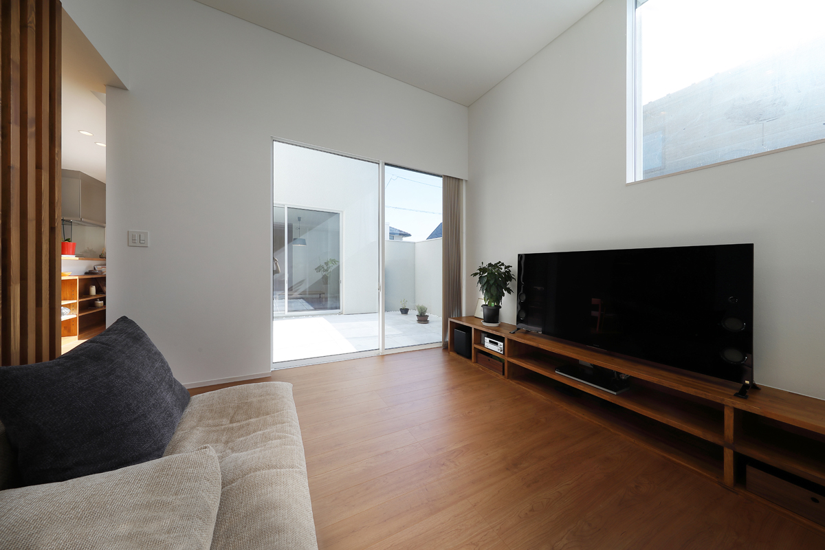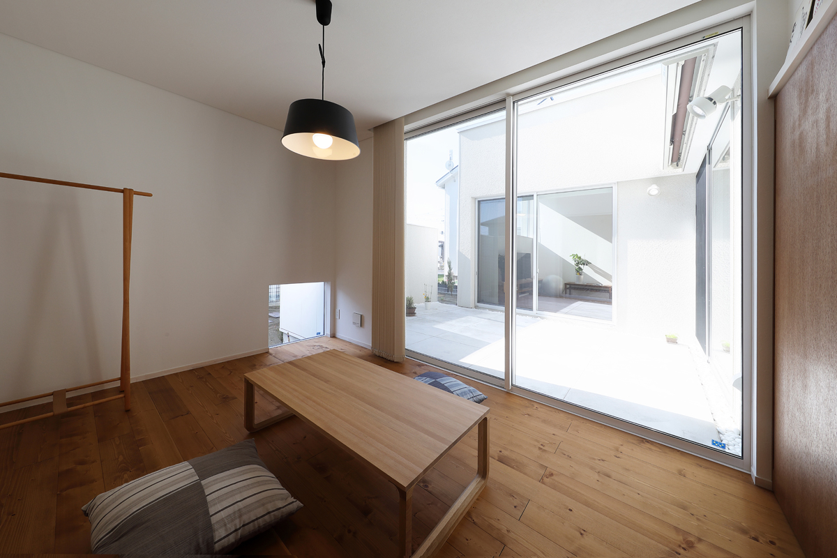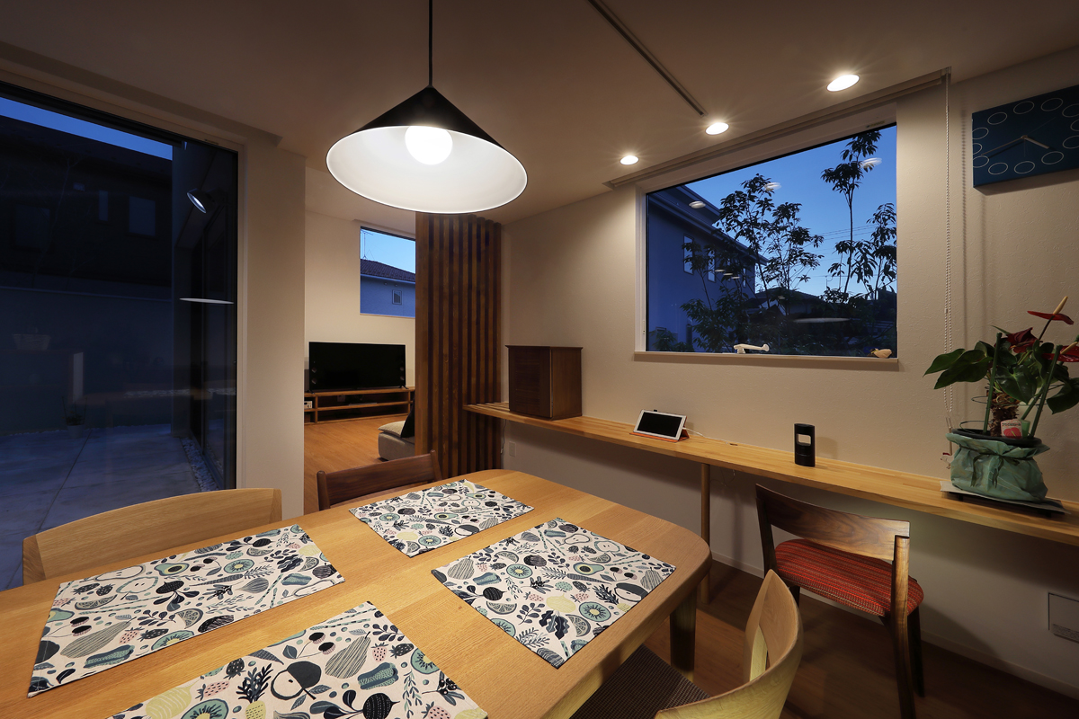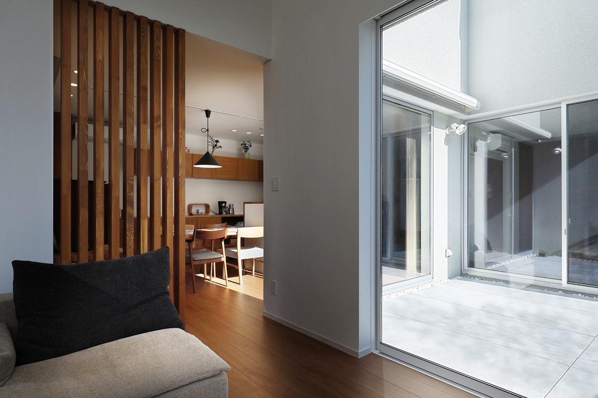 計画当時は造成中で、たくさんの建物が同時に建つことが予想されたため、周辺にどのような建物が建つか想定しながら配置を決めていきました。半中庭を設けることで、周辺からの視線を遮りつつ開放的な空間を実現させています。また、共働きであることから家事にかける負担を減らすため、水回りを2階にまとめて洗濯・物干し・収納の家事動線をシンプルにしました。