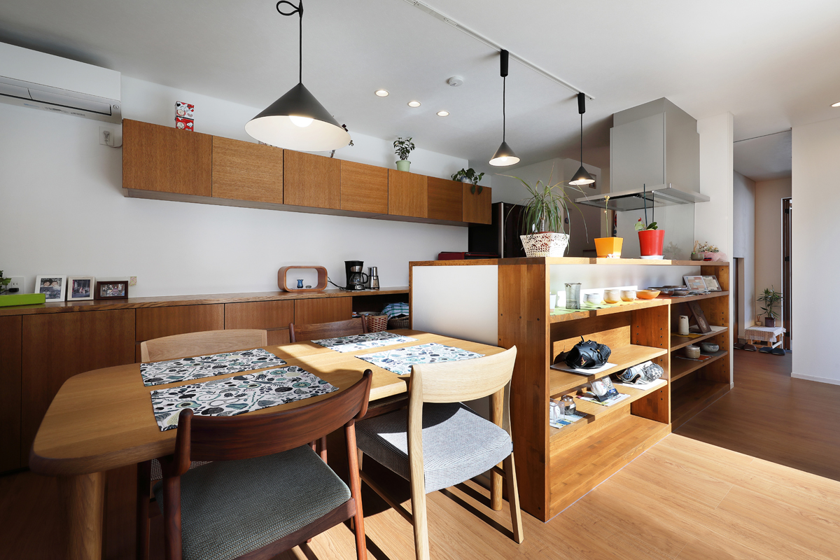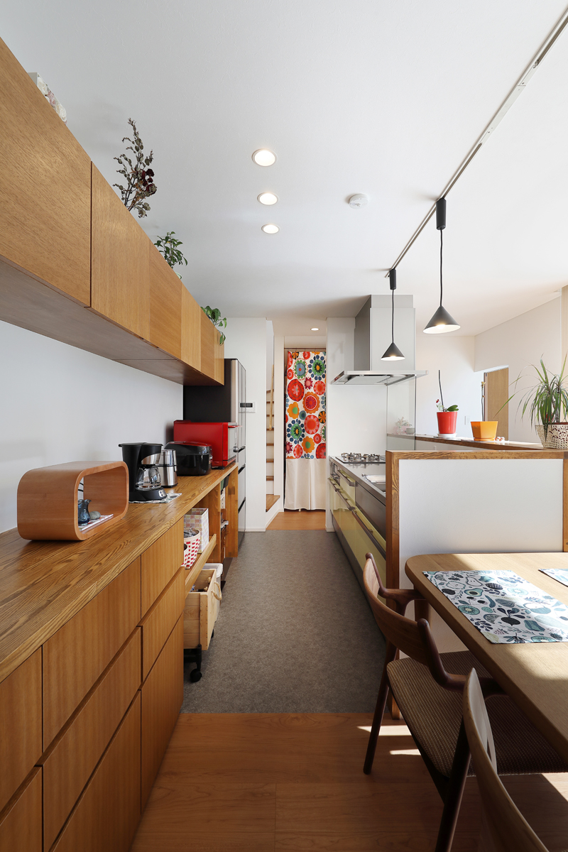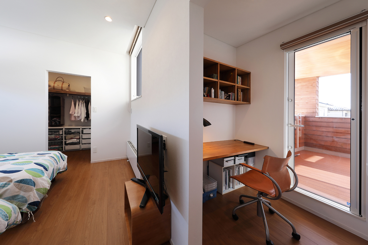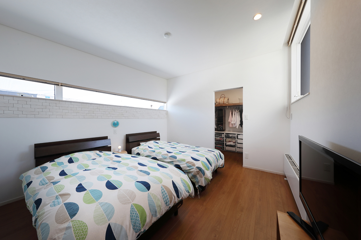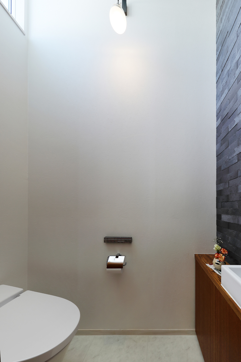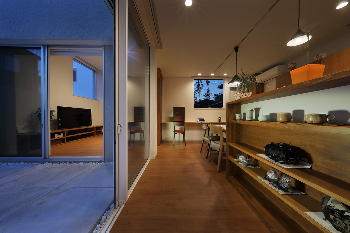 計画当時は造成中で、たくさんの建物が同時に建つことが予想されたため、周辺にどのような建物が建つか想定しながら配置を決めていきました。半中庭を設けることで、周辺からの視線を遮りつつ開放的な空間を実現させています。また、共働きであることから家事にかける負担を減らすため、水回りを2階にまとめて洗濯・物干し・収納の家事動線をシンプルにしました。