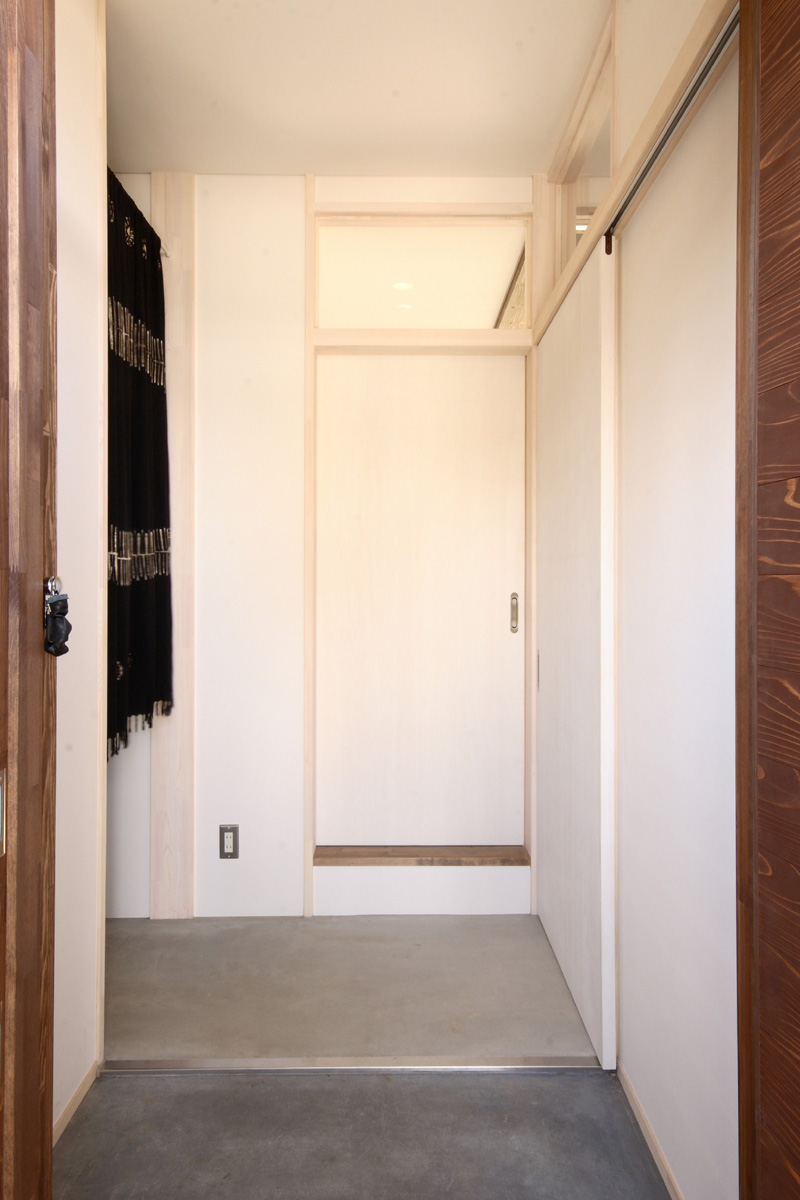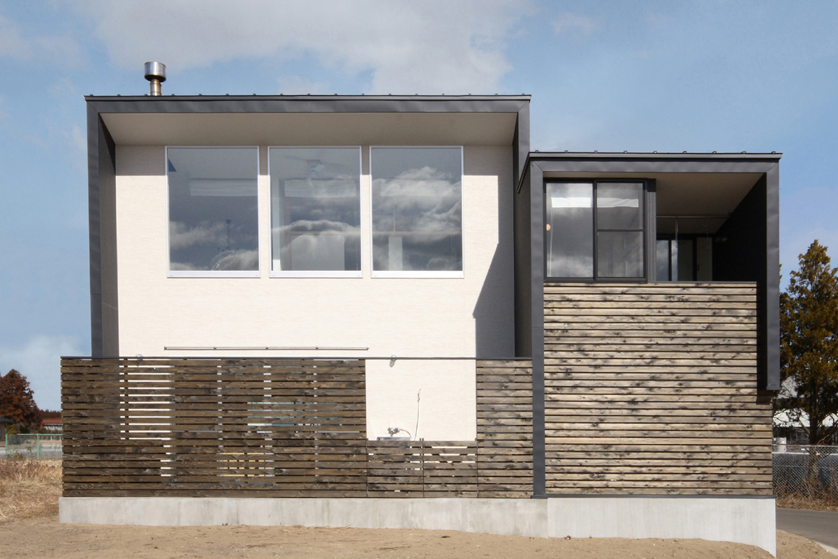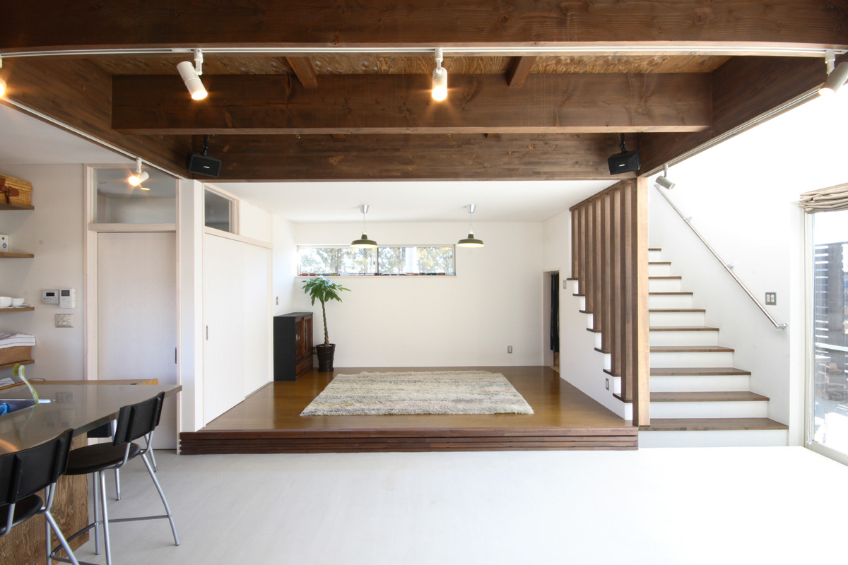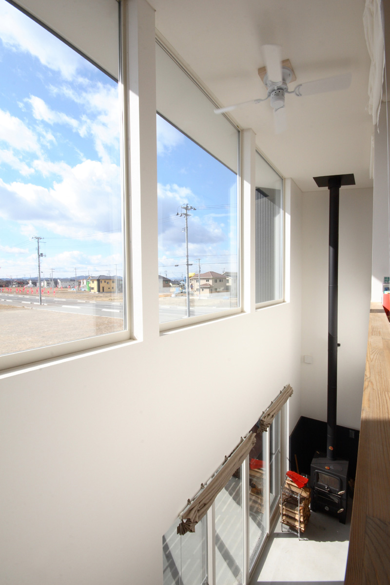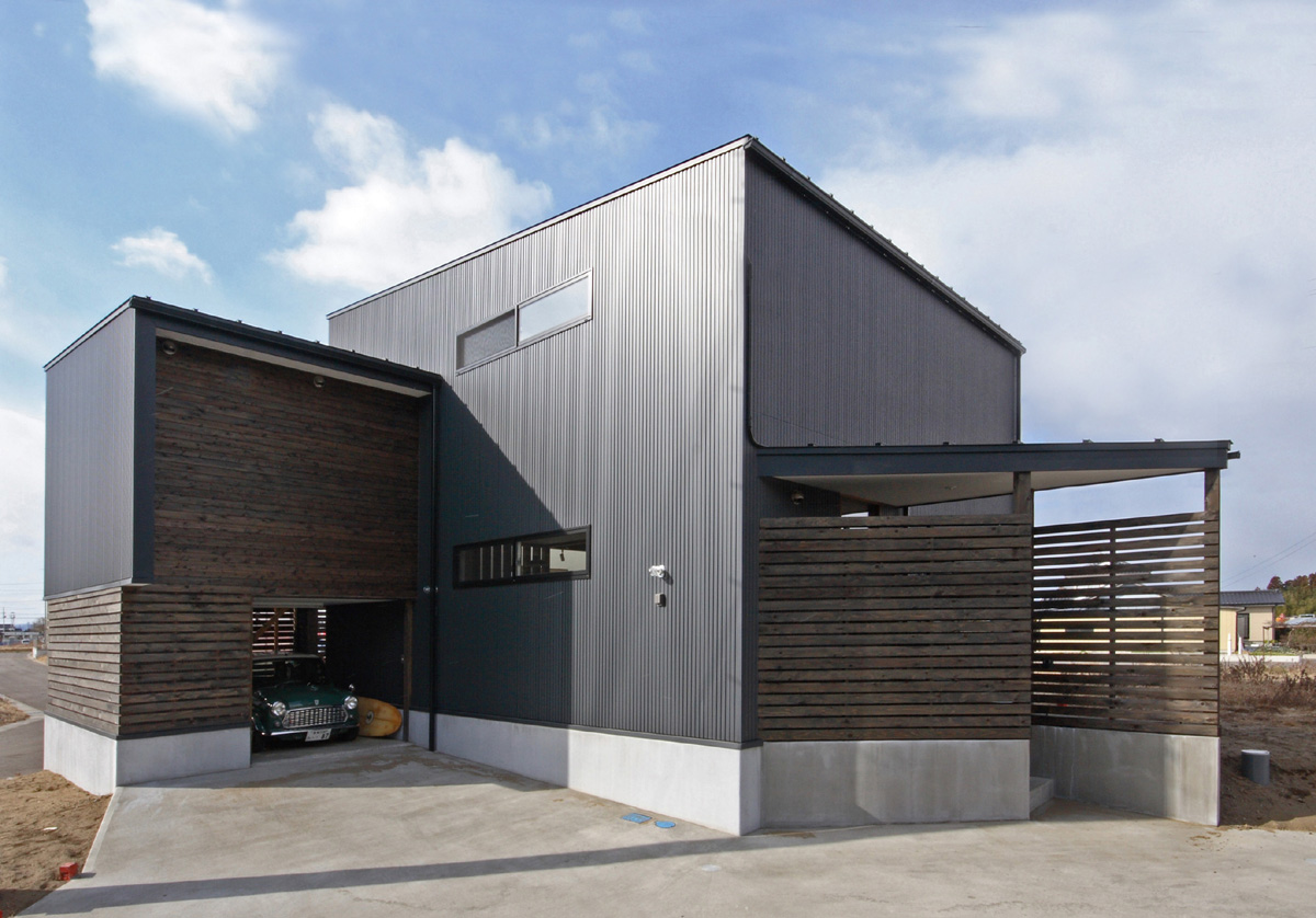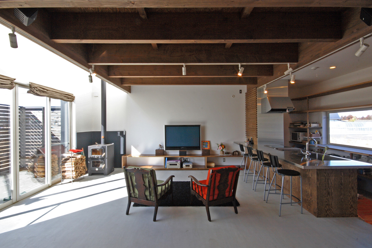 建物の形態はスキップフロアで繋がる二つのヴォリュームから形成されています。一つはリビングや個室をまとめた大きなヴォリューム。もう一つはミニ専用のガレージと水廻りをまとめた小さなヴォリュームです。ガレージはミニの特徴である小ささを生かし、天井高を抑えています。そのため上部の水廻りの床レベルが下がり、建物全体をレベル差のある変化にとんだ空間として構成しています。要望であったラフな住空間を演出するため、1階の床は土間仕上げとし、コストダウンも同時に図りました。コンクリートの蓄熱性を活かす基礎断熱とし、南面の開口を大きく取り太陽の光を最大限に取込んでいます。さらに吹抜けを設けることで1,2階を一体の空間とし、暖炉だけで建物全体が暖まるように考慮することでランニングコストを下げています。