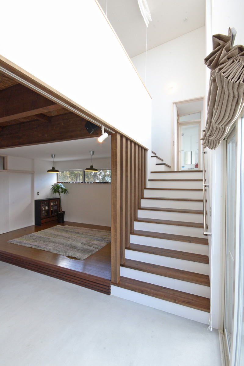 要望として求められたのは、ローバー・ミニやサーフボードを収納できるガレージがあることと、暖炉を生かした住空間をローコストに創ることでした。