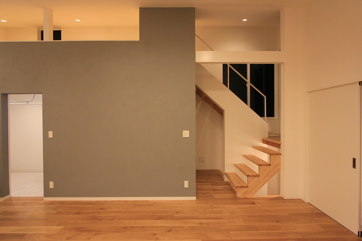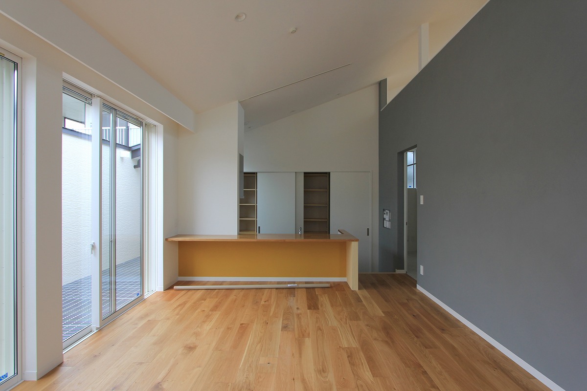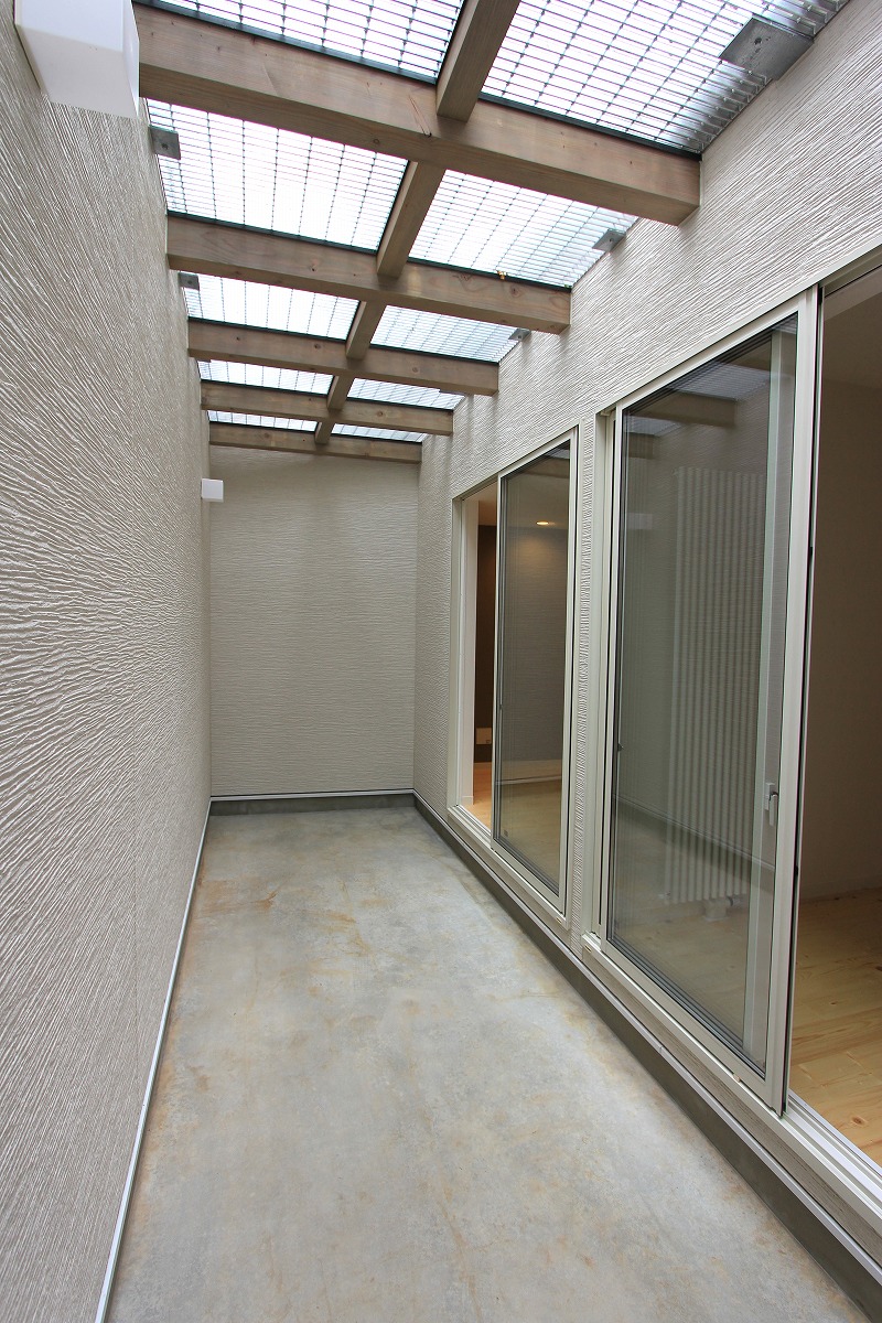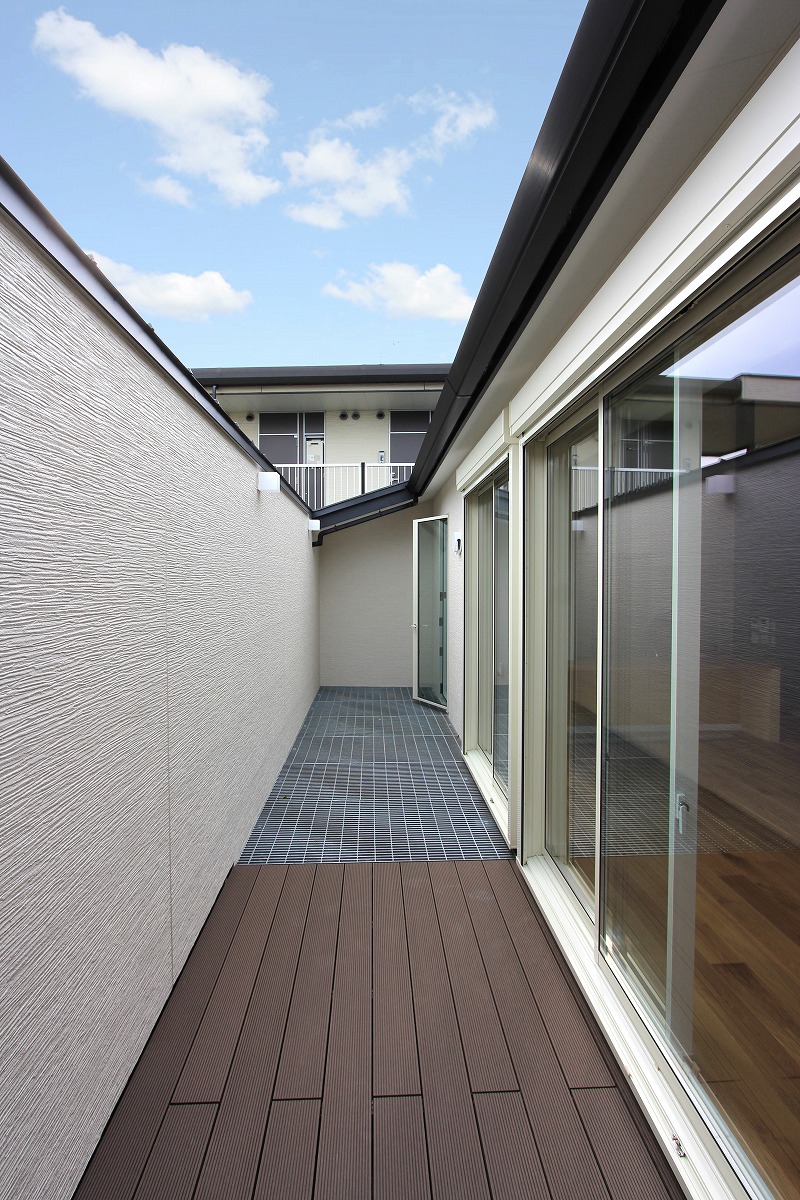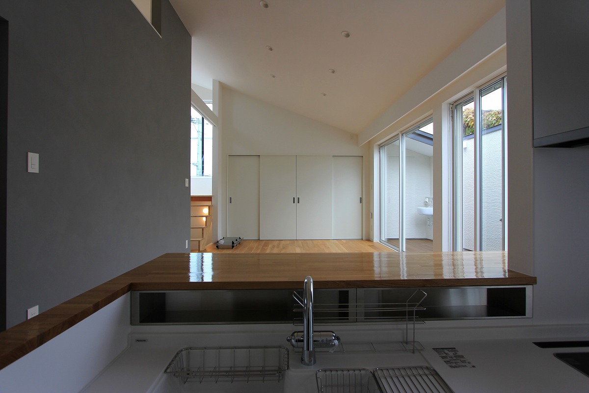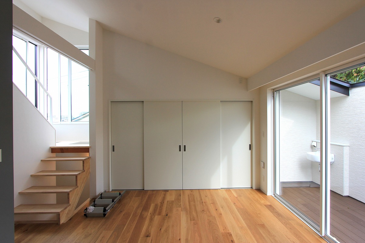 外に庭を設けても利用価値が望めないことから、建物の内部に庭(ライトコート)を設け、周囲からの視線を気にせず過ごせるスペースに。囲まれた壁に光が拡散し、室内に明るさを届けます。また、環境が良い2階部分はメインの生活空間を配置し、1階は寝室・収納としています。ライトコートが風や光を通し、コンパクトな室内で自分たちだけの外部空間として感じられる場所となりました。