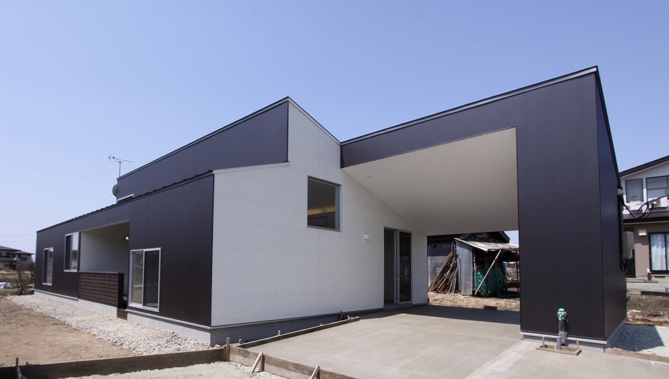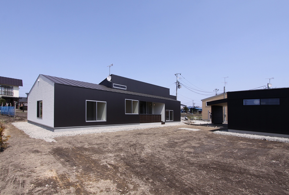 計画地は大館市の郊外で住宅地と耕作地や雑木林が点在するのどかな場所にあり、南側に開いた視界には借景の林が美しい、1000㎡(300坪)を超える、ゆとりのある敷地です。この場所に親世帯「定年後の第2の人生を夫婦2人でガーデニングや木工などの創作活動を楽しみながら暮らすことを目的につくられるセカンドハウス的な住宅」と、子供世帯「夫婦と子供2人の4人家族が暮らす住宅」がそれぞれ独立した戸建て住宅として計画されました。