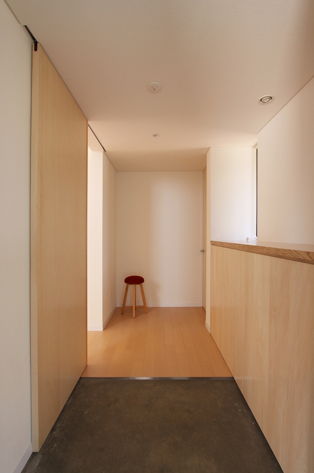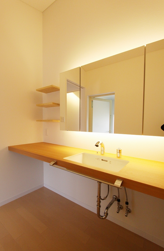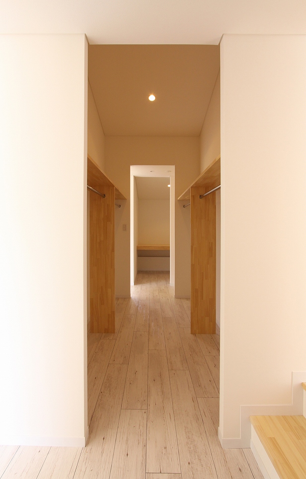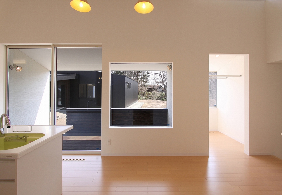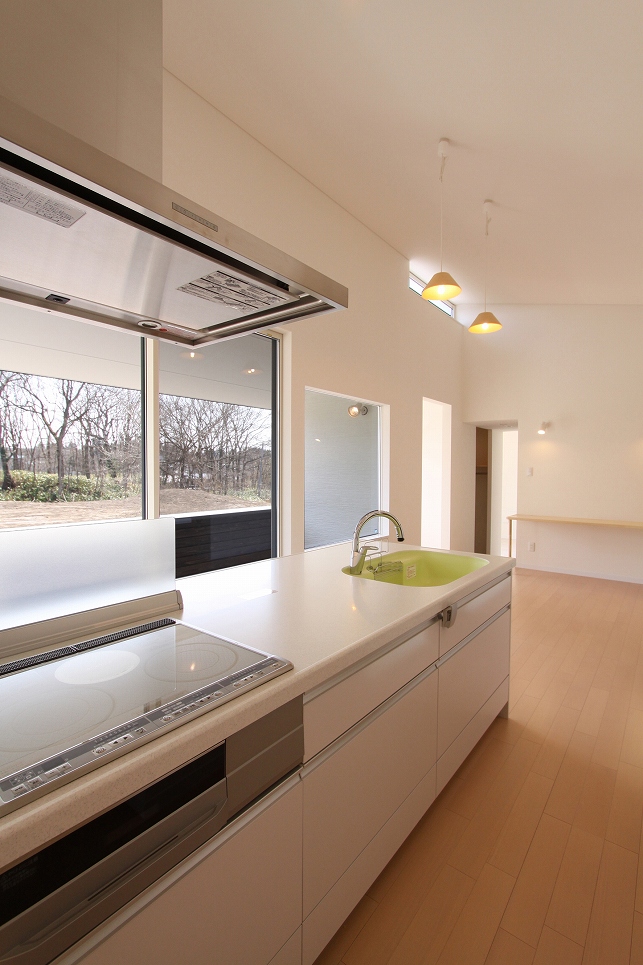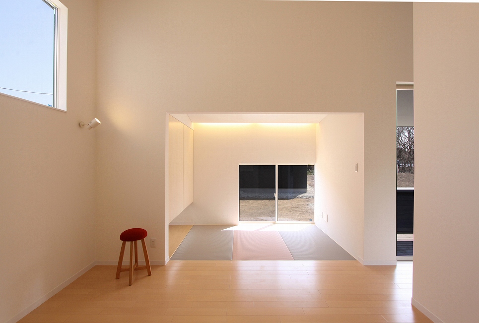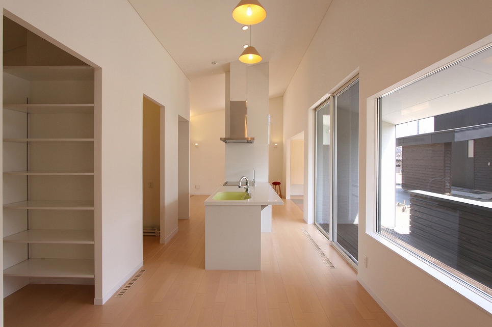 ワンストーリーハウスは広い敷地と北と南に落雪スペースを確保できることから、変形切妻屋根とし、家族4人が伸び伸びと暮らす平屋を計画しました。東西に伸びるボリュームの中には扉の無い緩やかな間仕切りで天井高や床レベルの異なる大小の空間が連なるように広がります。リビングやダイニングを中心とした表の動線と水回りや収納を中心とした裏の動線が回遊でき、日常的な使い勝手はもちろん、空間の広がりを、より体感できる配置となっています。