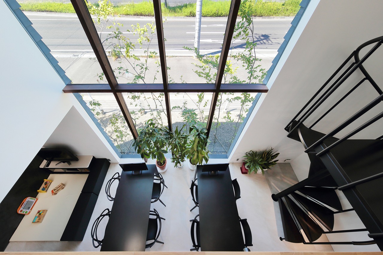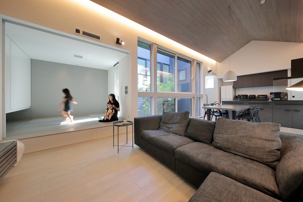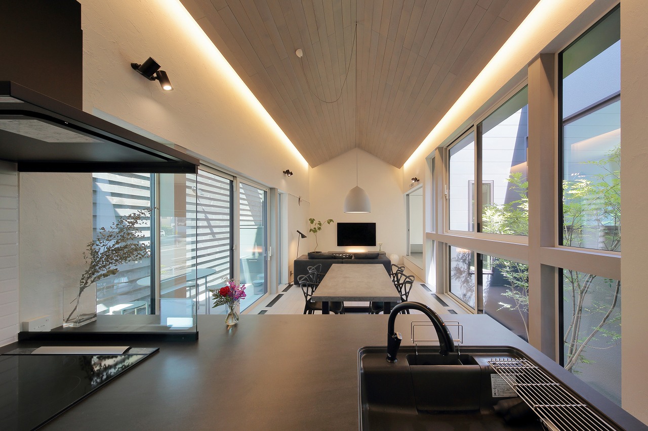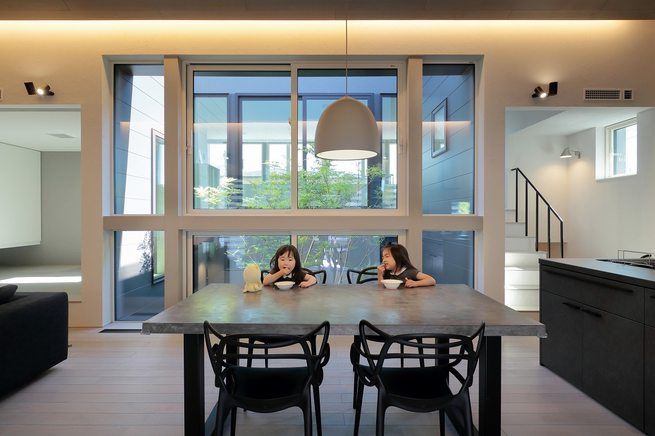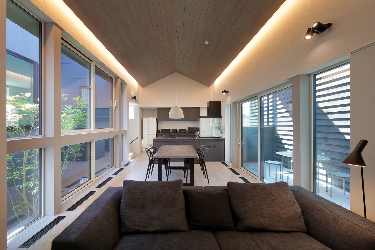 幹線道路から事務所棟を挟むことによって防音効果も期待できるモデルルームは都市型の敷地に対してプライバシーを確保できるように中庭型をご提案。スキップフロアによってゆるやかに空間がつながります。準防火地域に対して中庭型を提案することによって防火設備を使用しなくて済む場所も増え、コストダウンにつながっています。