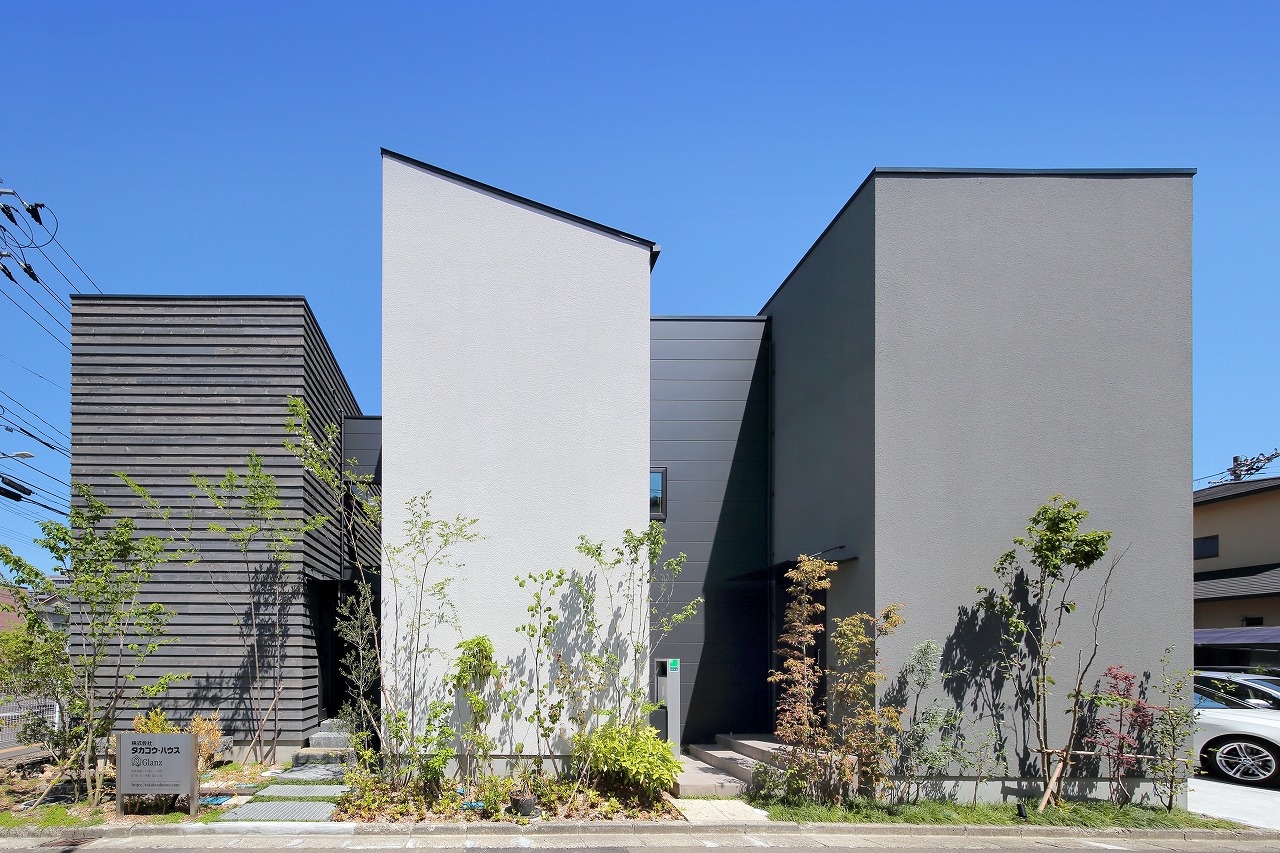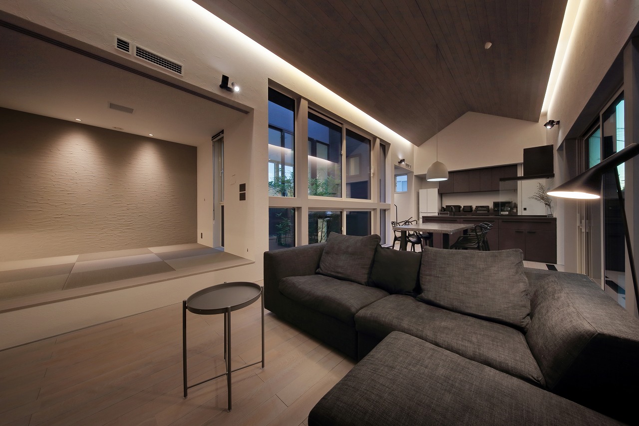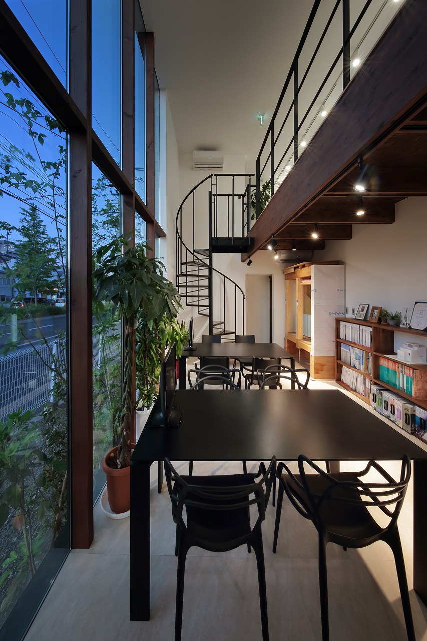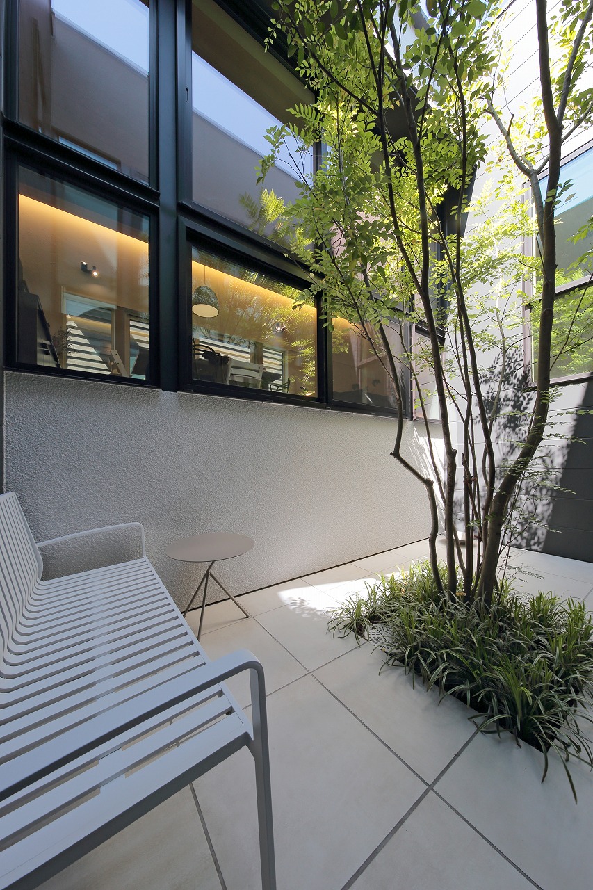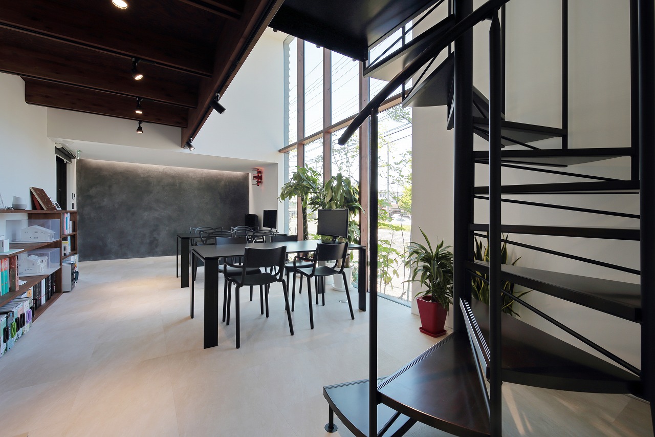 幹線道路から事務所棟を挟むことによって防音効果も期待できるモデルルームは都市型の敷地に対してプライバシーを確保できるように中庭型をご提案。スキップフロアによってゆるやかに空間がつながります。準防火地域に対して中庭型を提案することによって防火設備を使用しなくて済む場所も増え、コストダウンにつながっています。