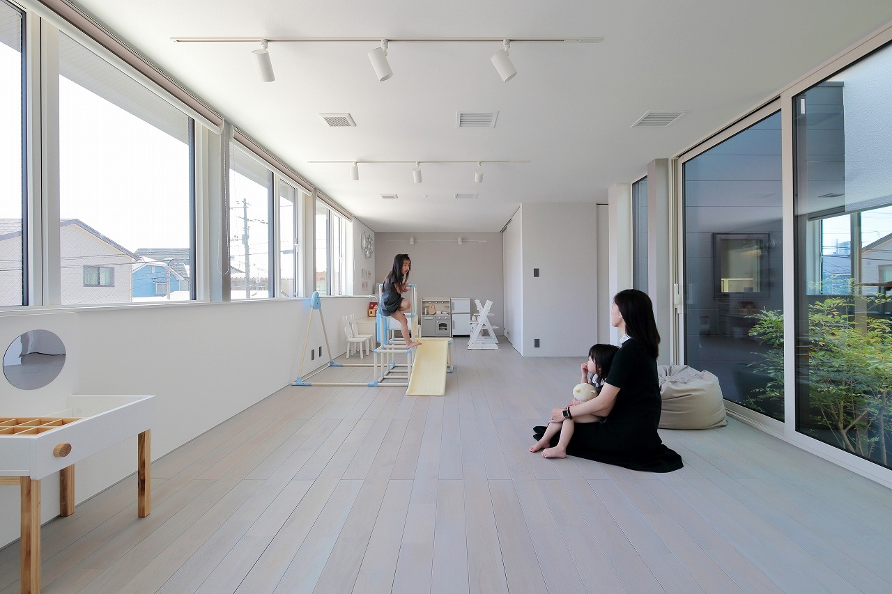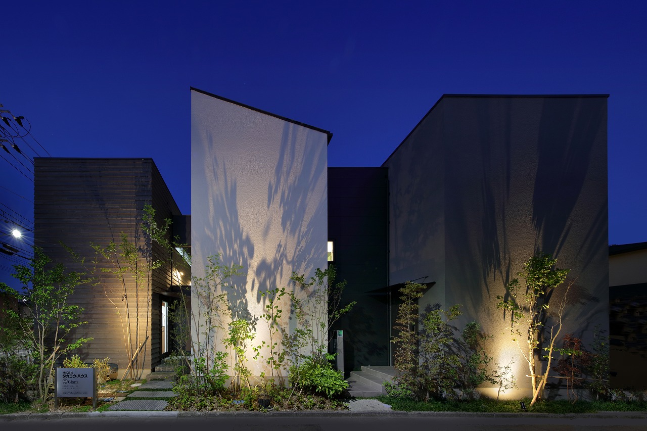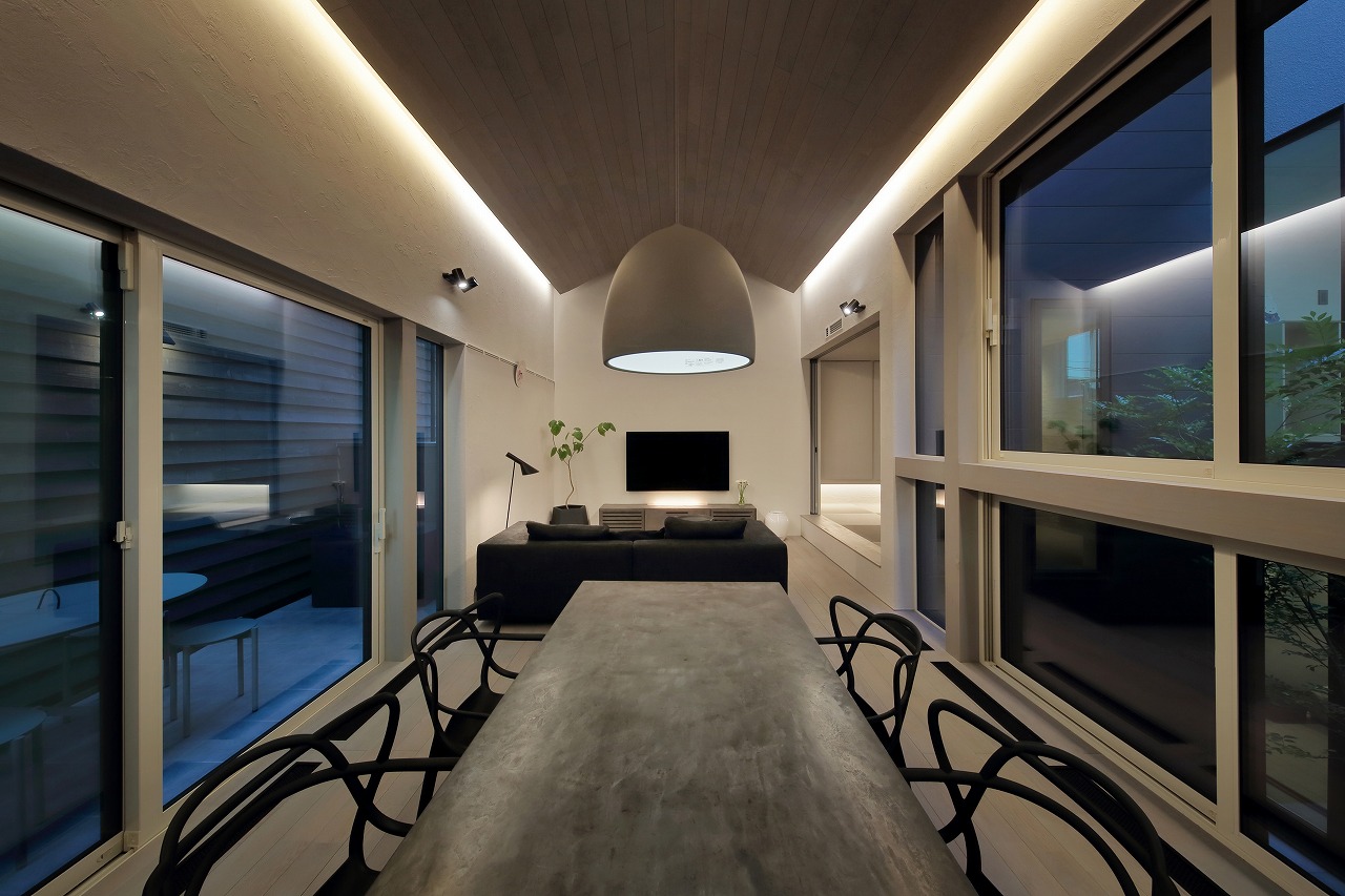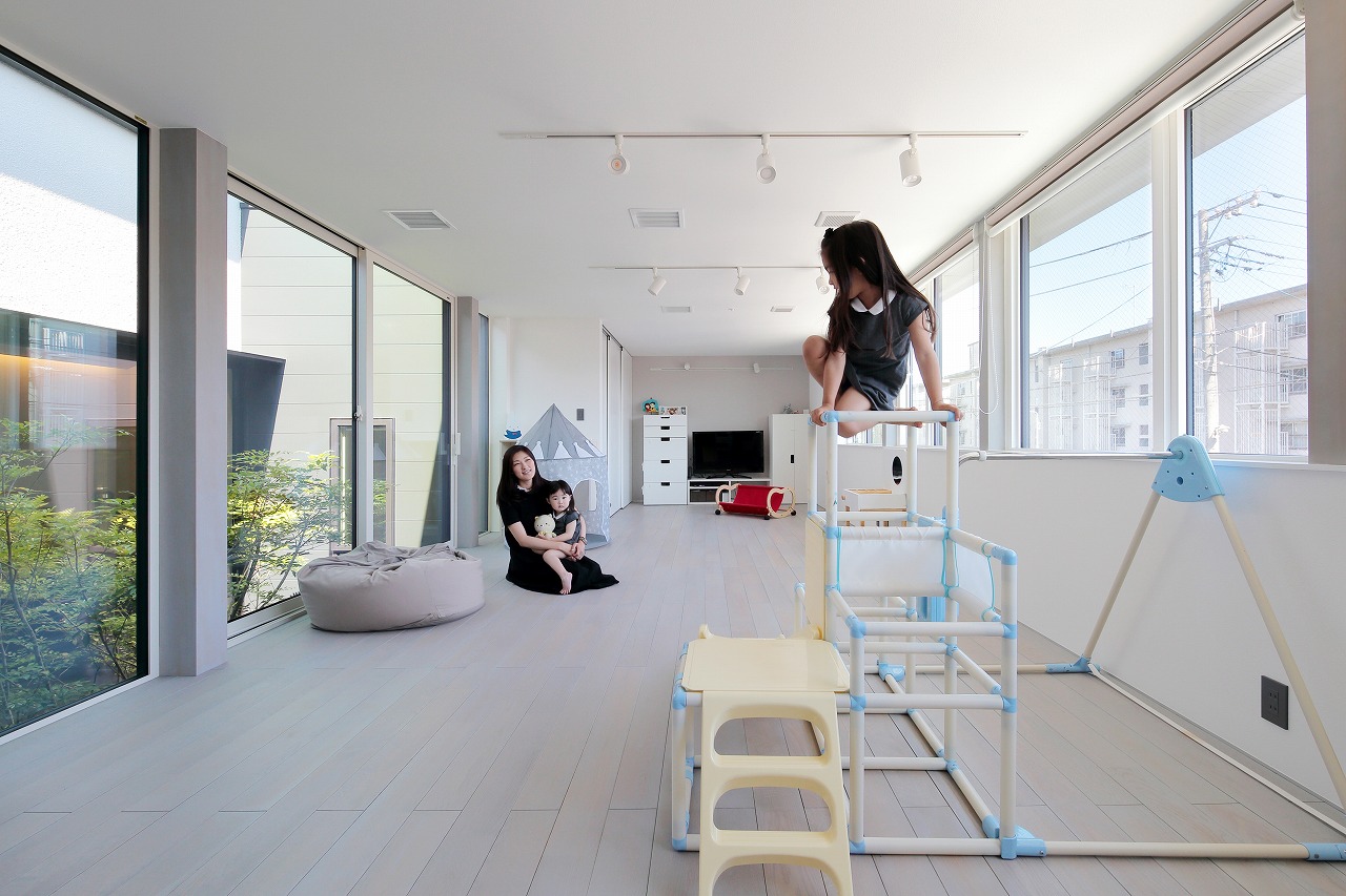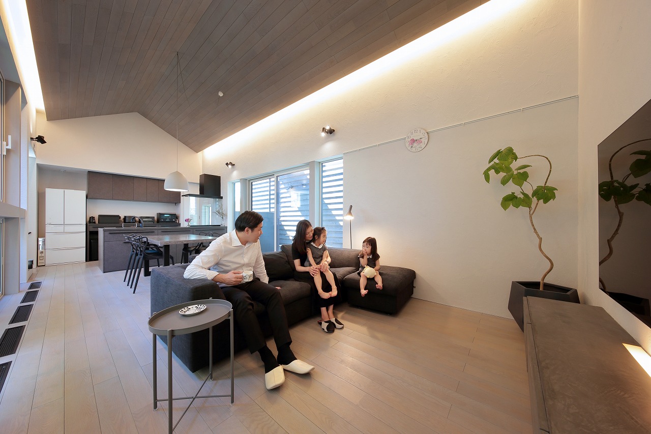 幹線道路から事務所棟を挟むことによって防音効果も期待できるモデルルームは都市型の敷地に対してプライバシーを確保できるように中庭型をご提案。スキップフロアによってゆるやかに空間がつながります。準防火地域に対して中庭型を提案することによって防火設備を使用しなくて済む場所も増え、コストダウンにつながっています。