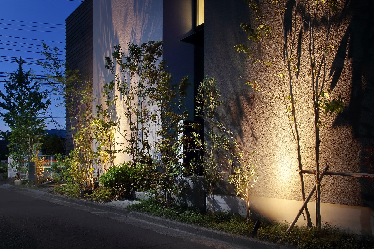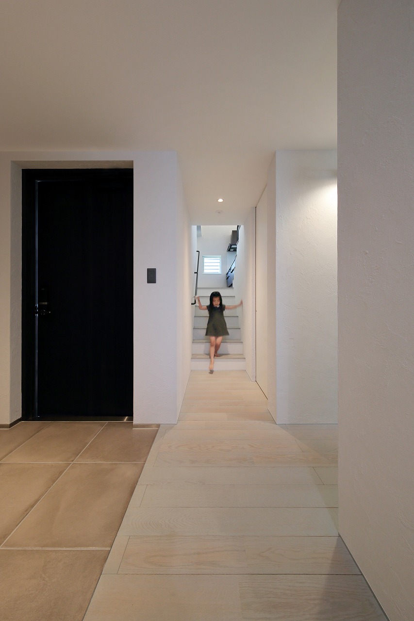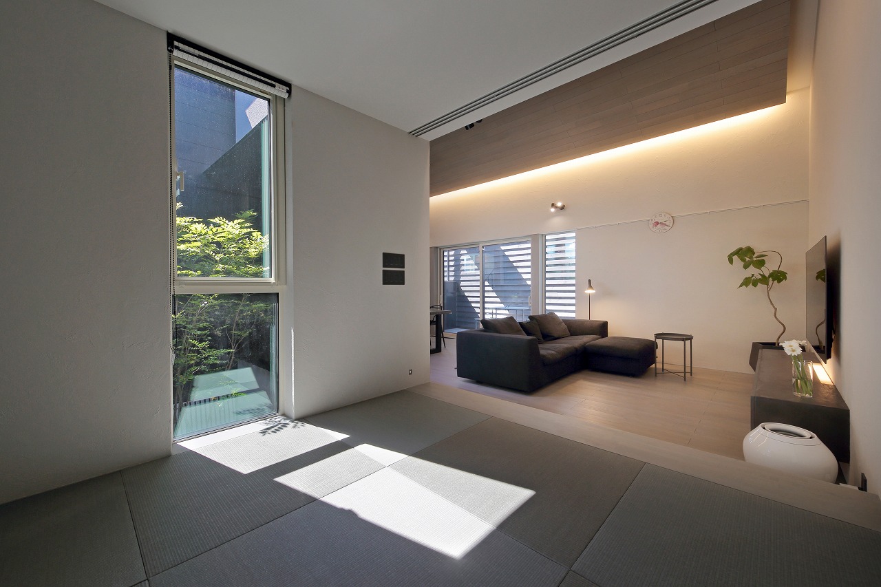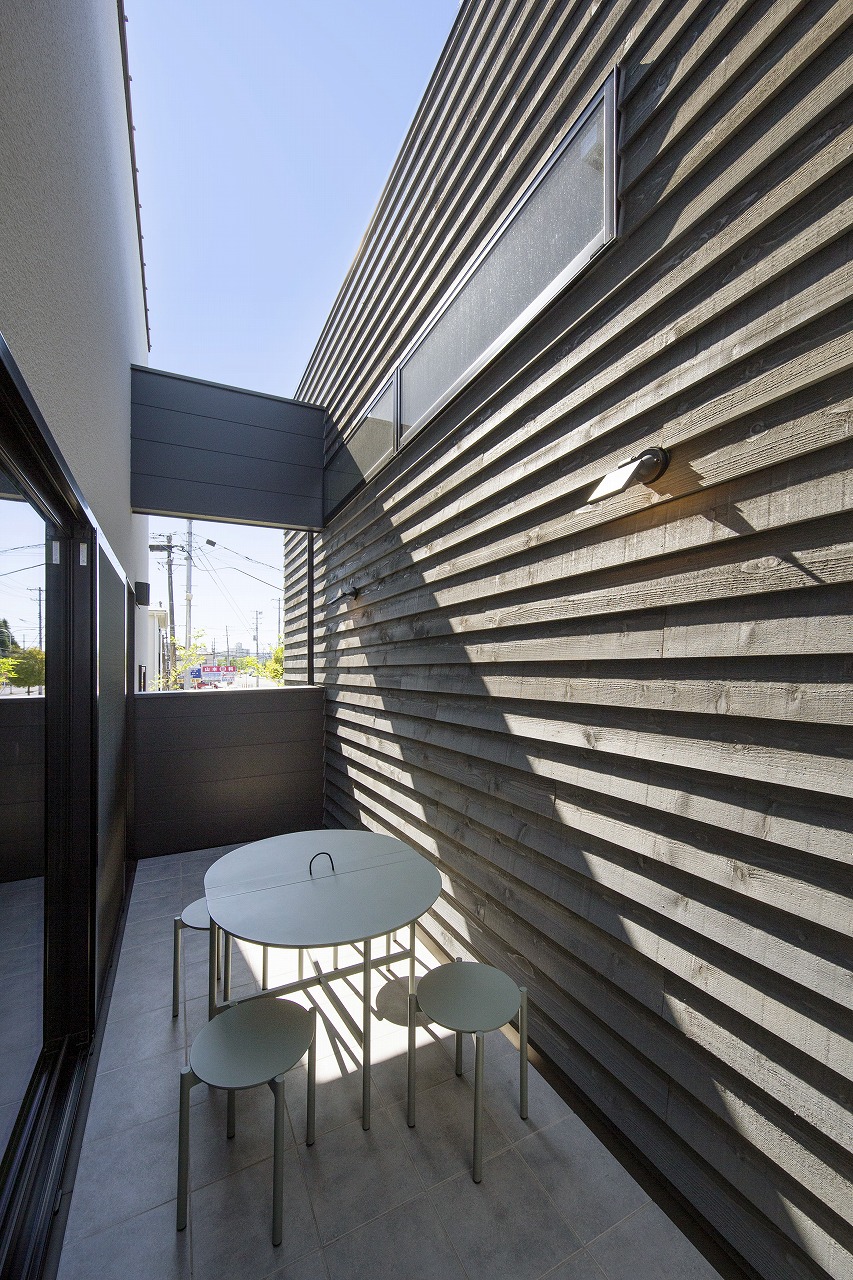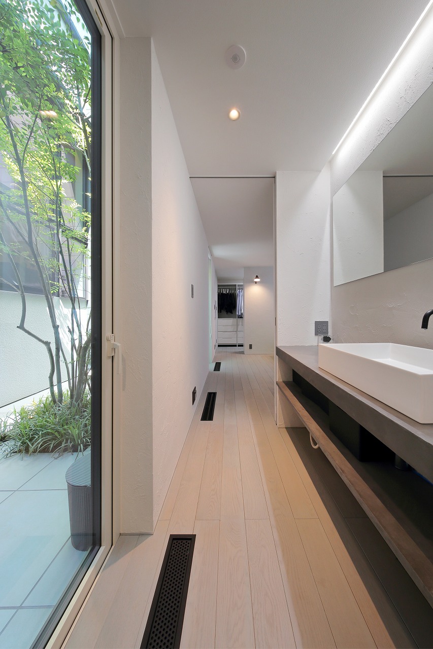 幹線道路から事務所棟を挟むことによって防音効果も期待できるモデルルームは都市型の敷地に対してプライバシーを確保できるように中庭型をご提案。スキップフロアによってゆるやかに空間がつながります。準防火地域に対して中庭型を提案することによって防火設備を使用しなくて済む場所も増え、コストダウンにつながっています。