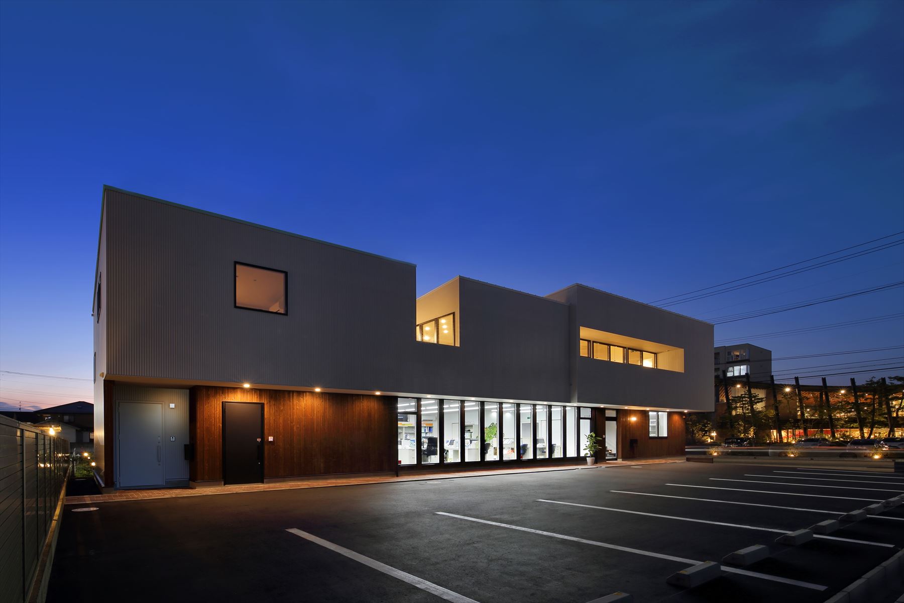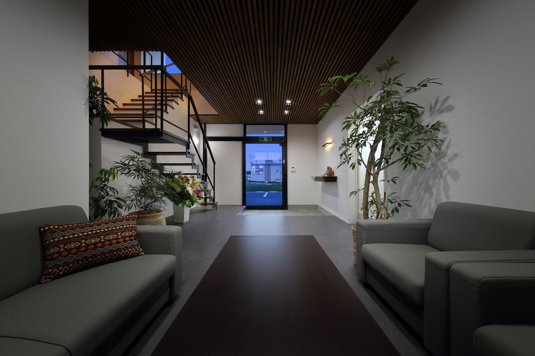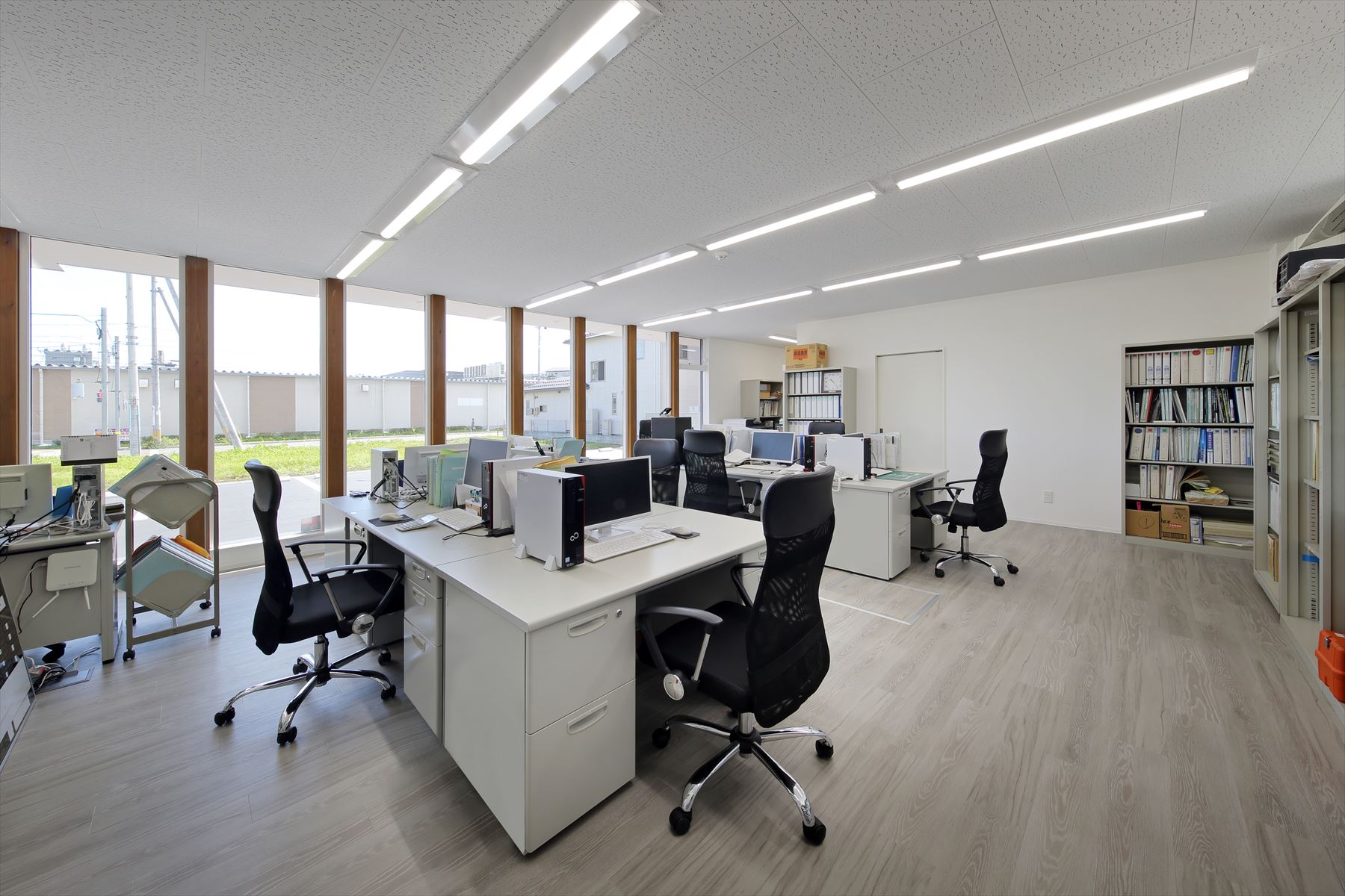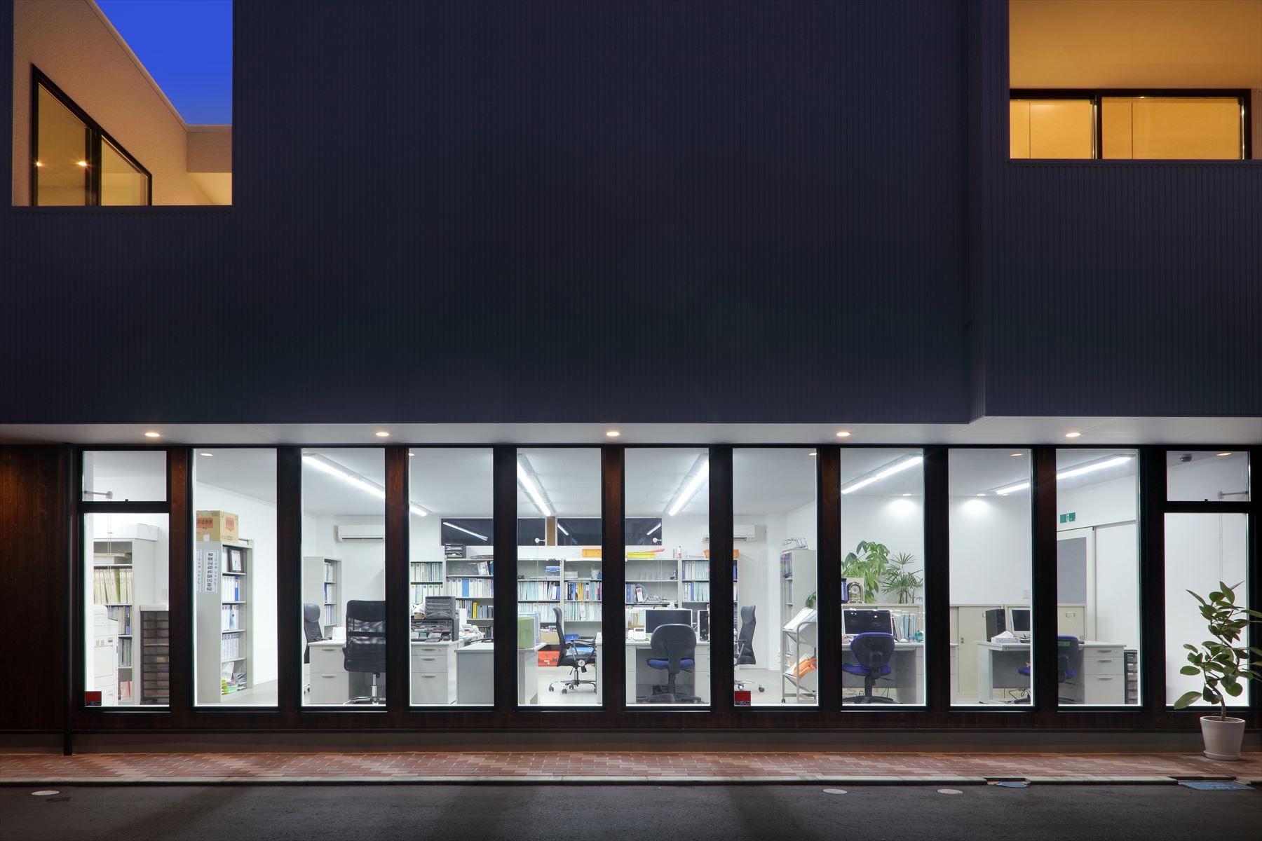 敷地は北側道路に面し、間口17m、奥行き25mの奥にながい形状で、西側と南側は建物が近接していたため、東面に大きく開くプランとしました。駐車場が多く必要だったこともあり、建物を西側に片寄に配置し、東側に十分な駐車台数の確保できるような配置計画となりました。道路側に事務所、奥に住宅を配置し、事務所の公共性と住宅のプライバシー確保を奥に長いプランで解消しています。
