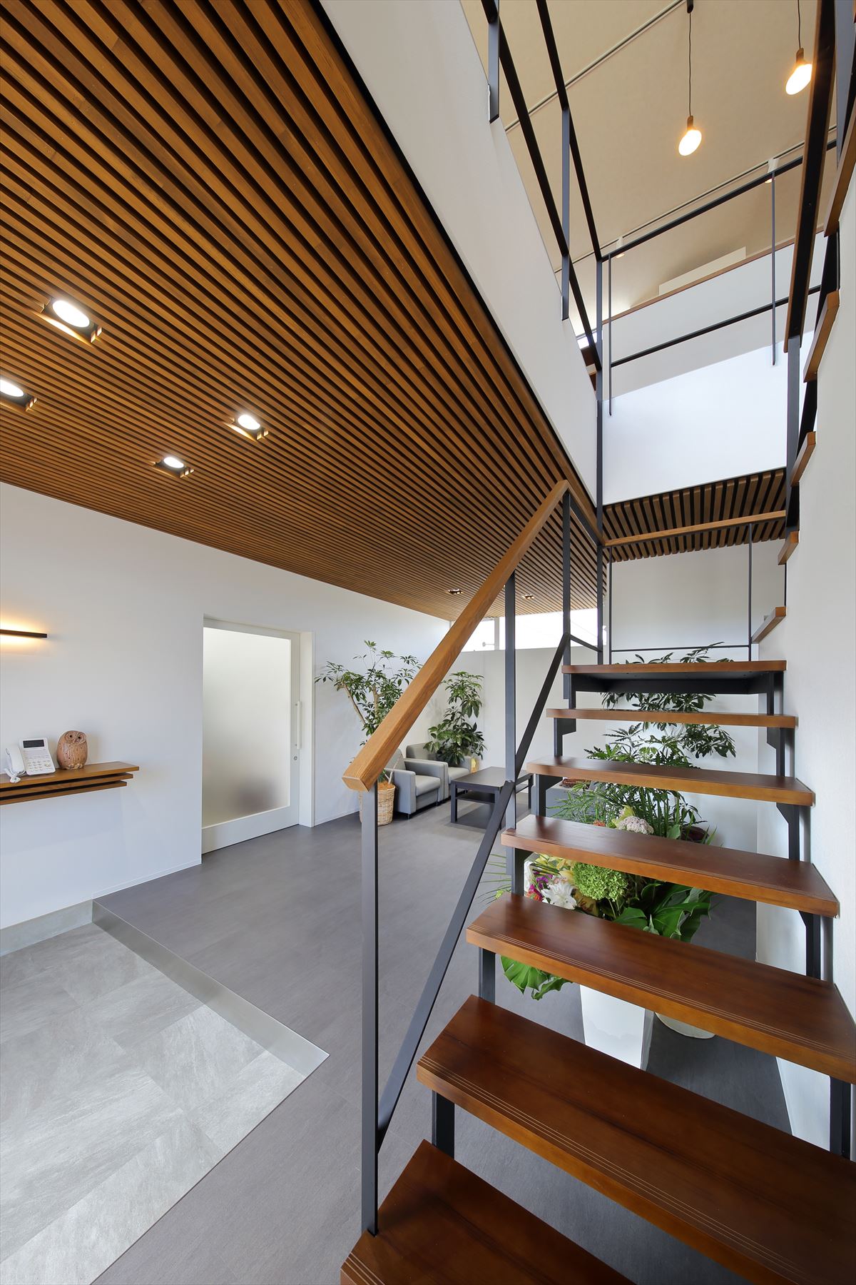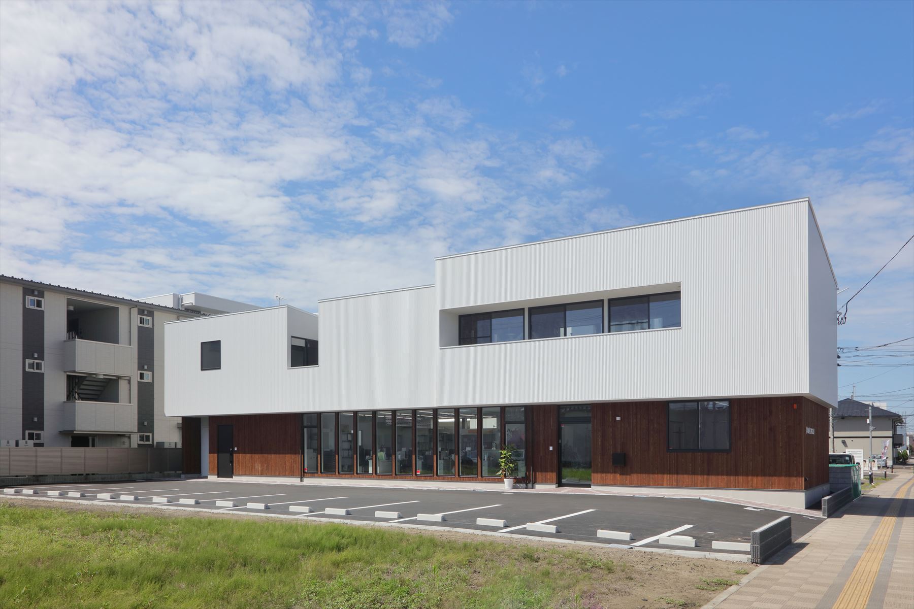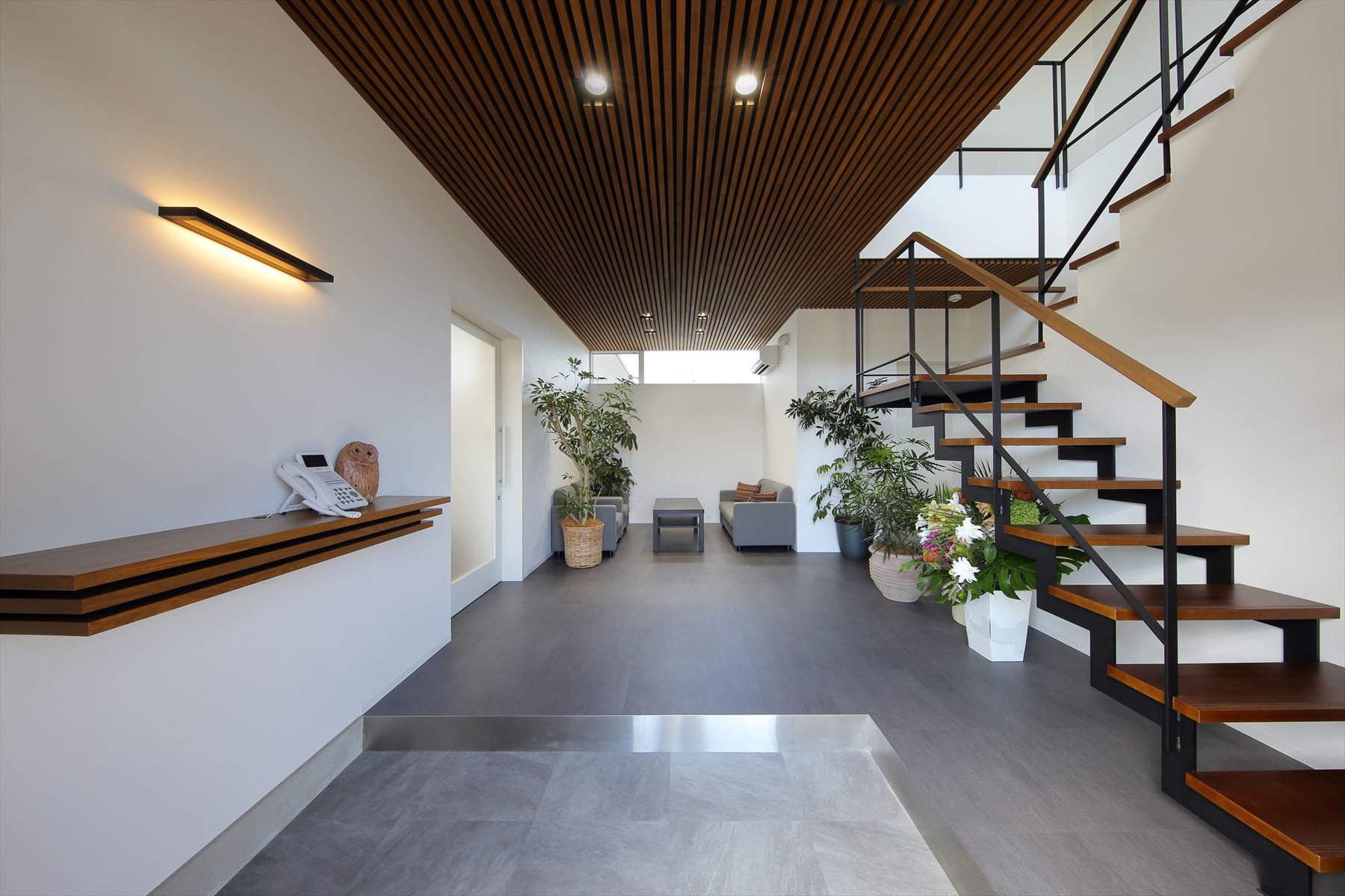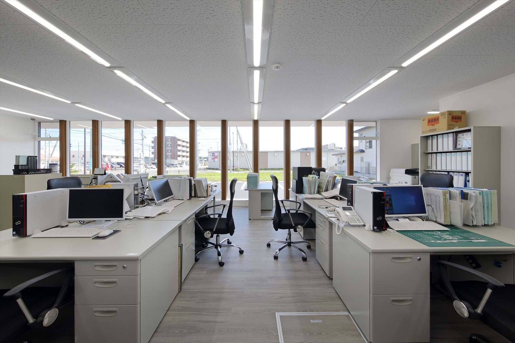 敷地は北側道路に面し、間口17m、奥行き25mの奥にながい形状で、西側と南側は建物が近接していたため、東面に大きく開くプランとしました。駐車場が多く必要だったこともあり、建物を西側に片寄に配置し、東側に十分な駐車台数の確保できるような配置計画となりました。道路側に事務所、奥に住宅を配置し、事務所の公共性と住宅のプライバシー確保を奥に長いプランで解消しています。