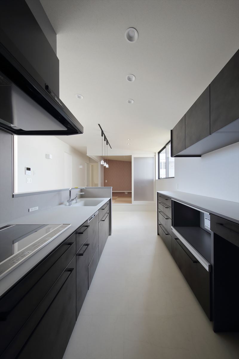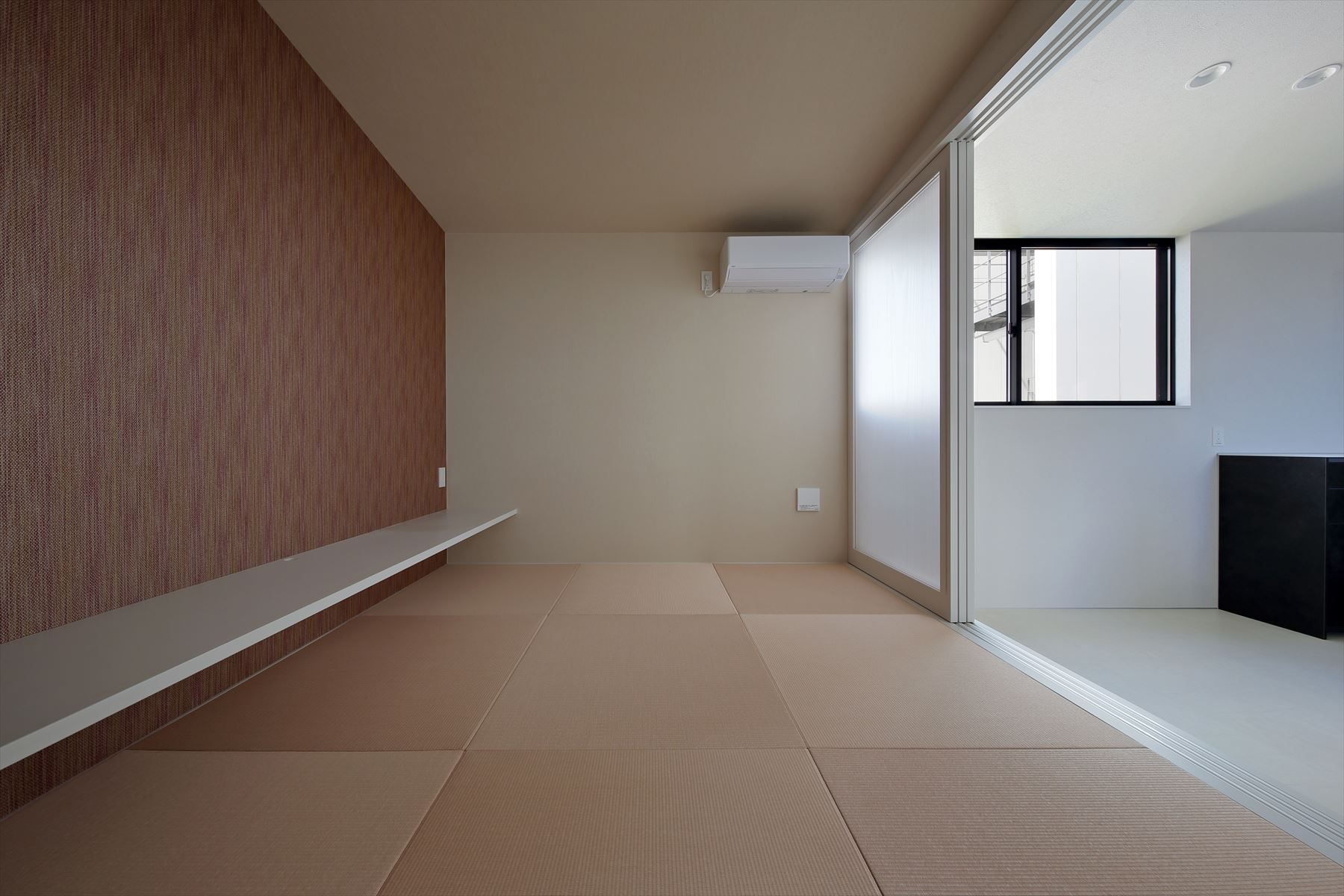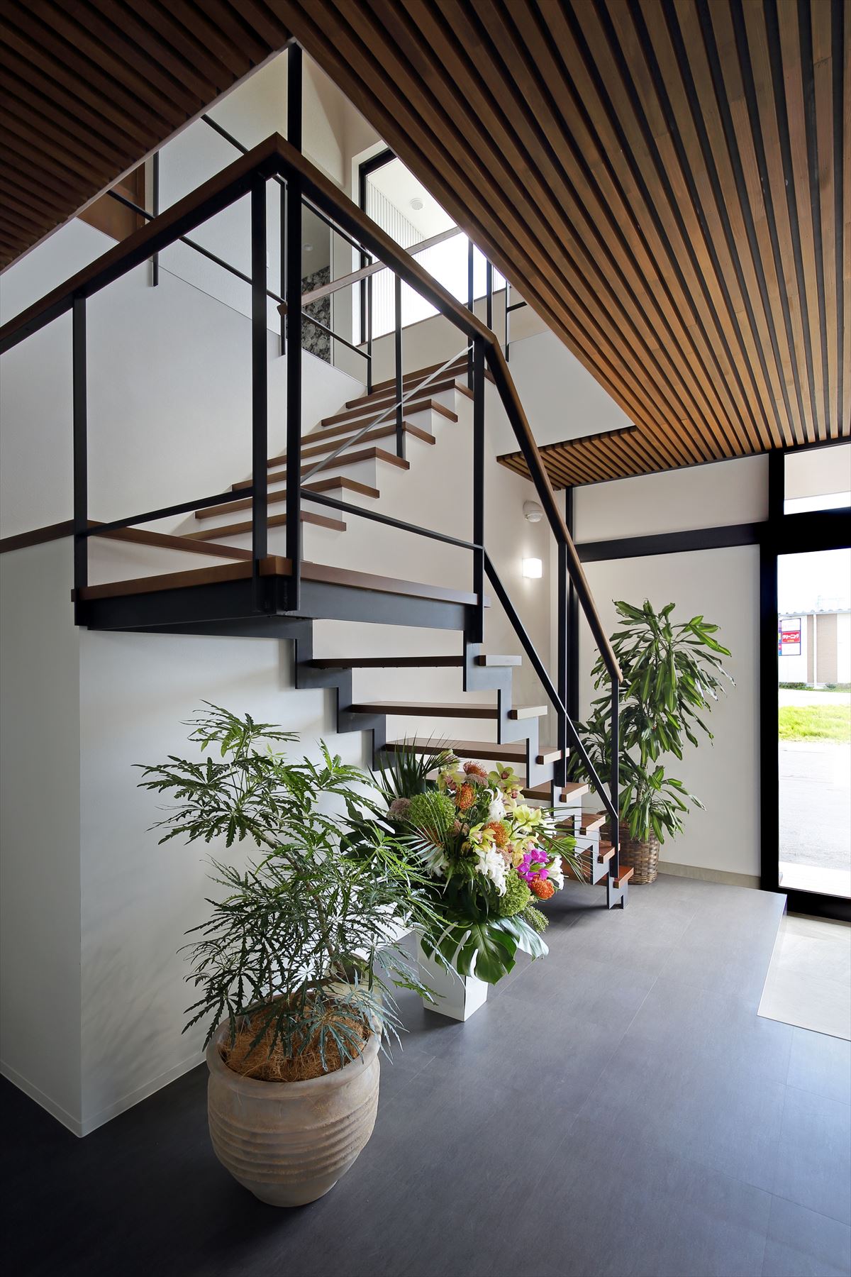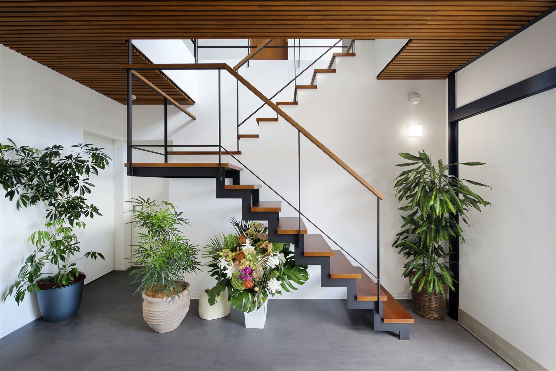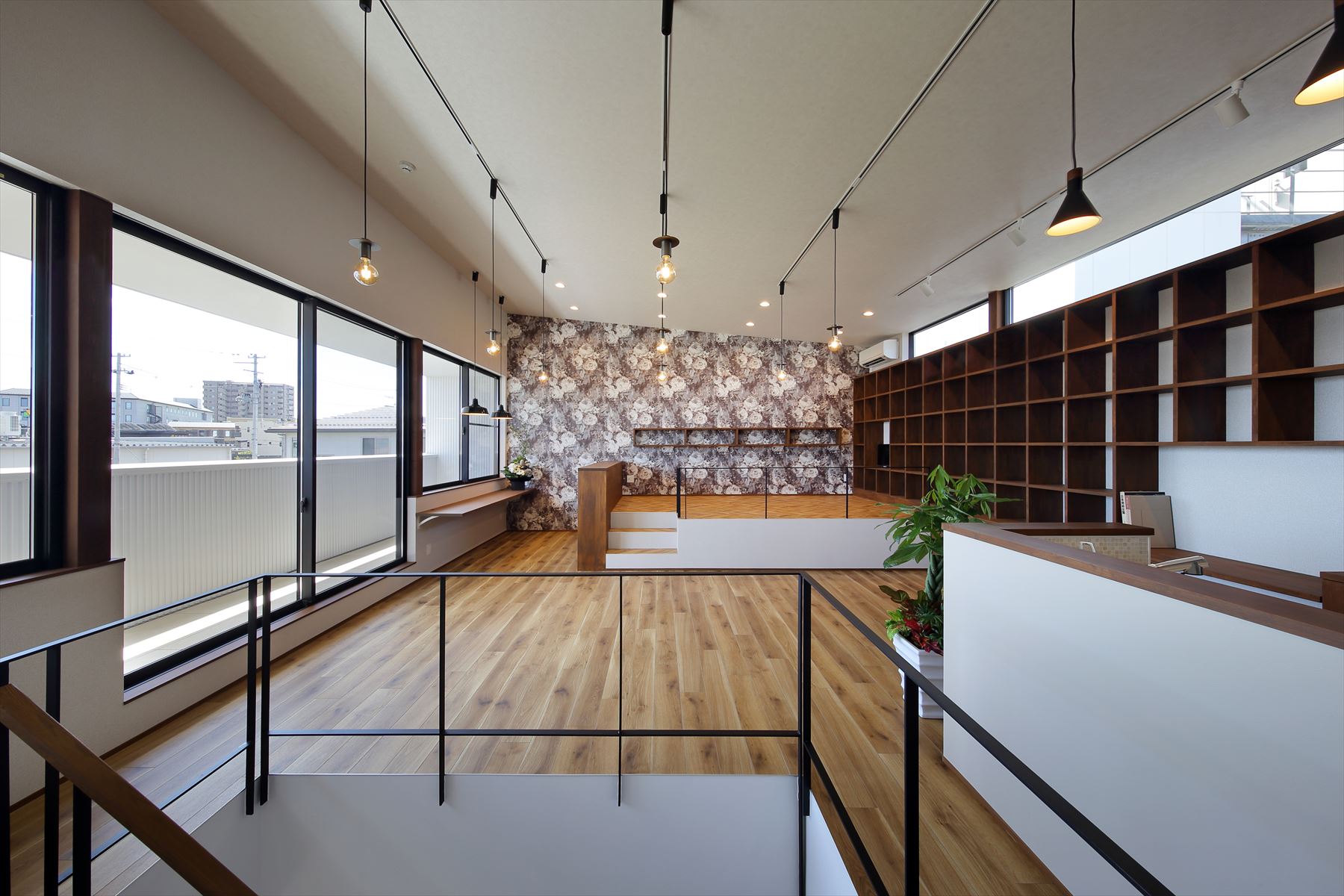 敷地は北側道路に面し、間口17m、奥行き25mの奥にながい形状で、西側と南側は建物が近接していたため、東面に大きく開くプランとしました。駐車場が多く必要だったこともあり、建物を西側に片寄に配置し、東側に十分な駐車台数の確保できるような配置計画となりました。道路側に事務所、奥に住宅を配置し、事務所の公共性と住宅のプライバシー確保を奥に長いプランで解消しています。