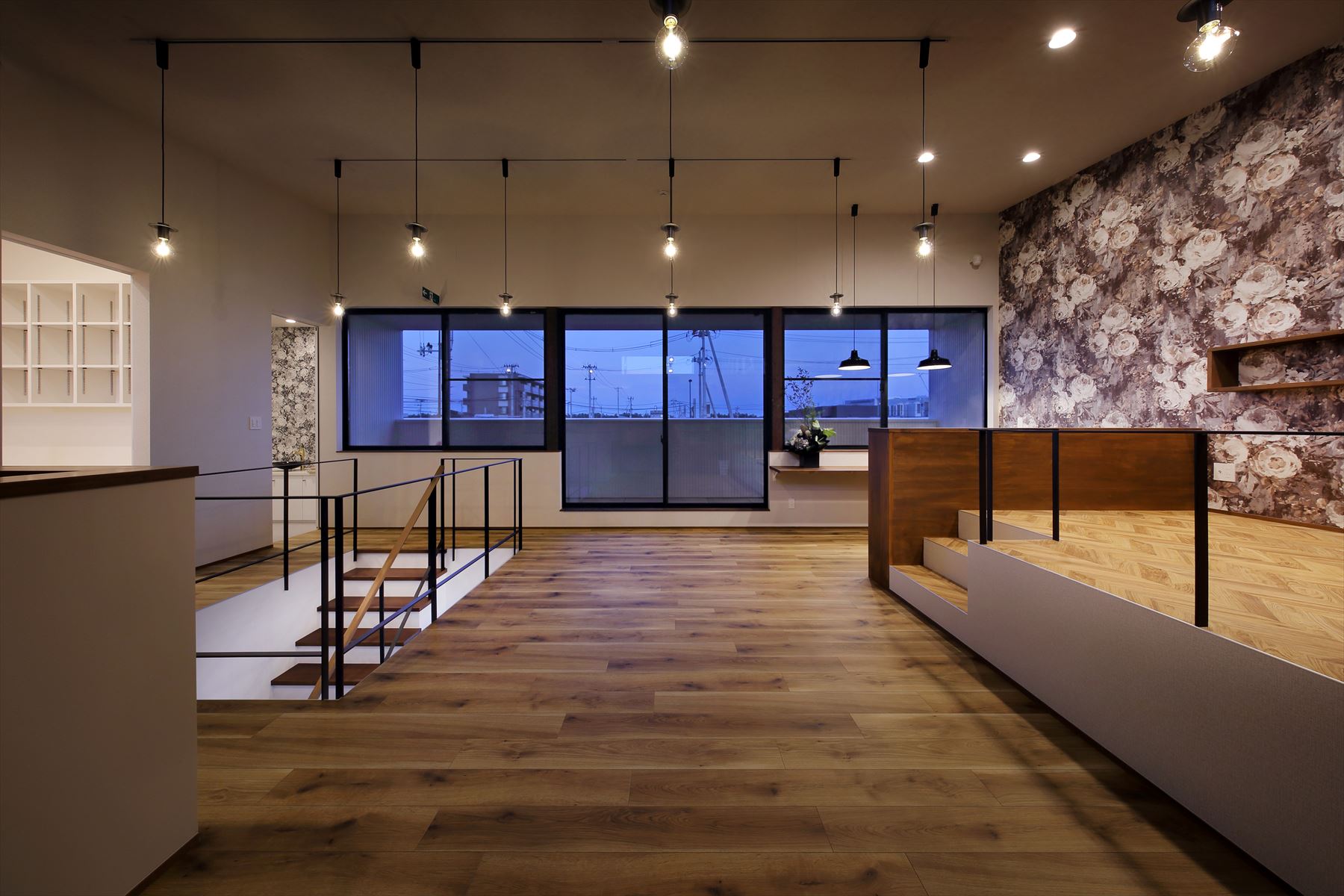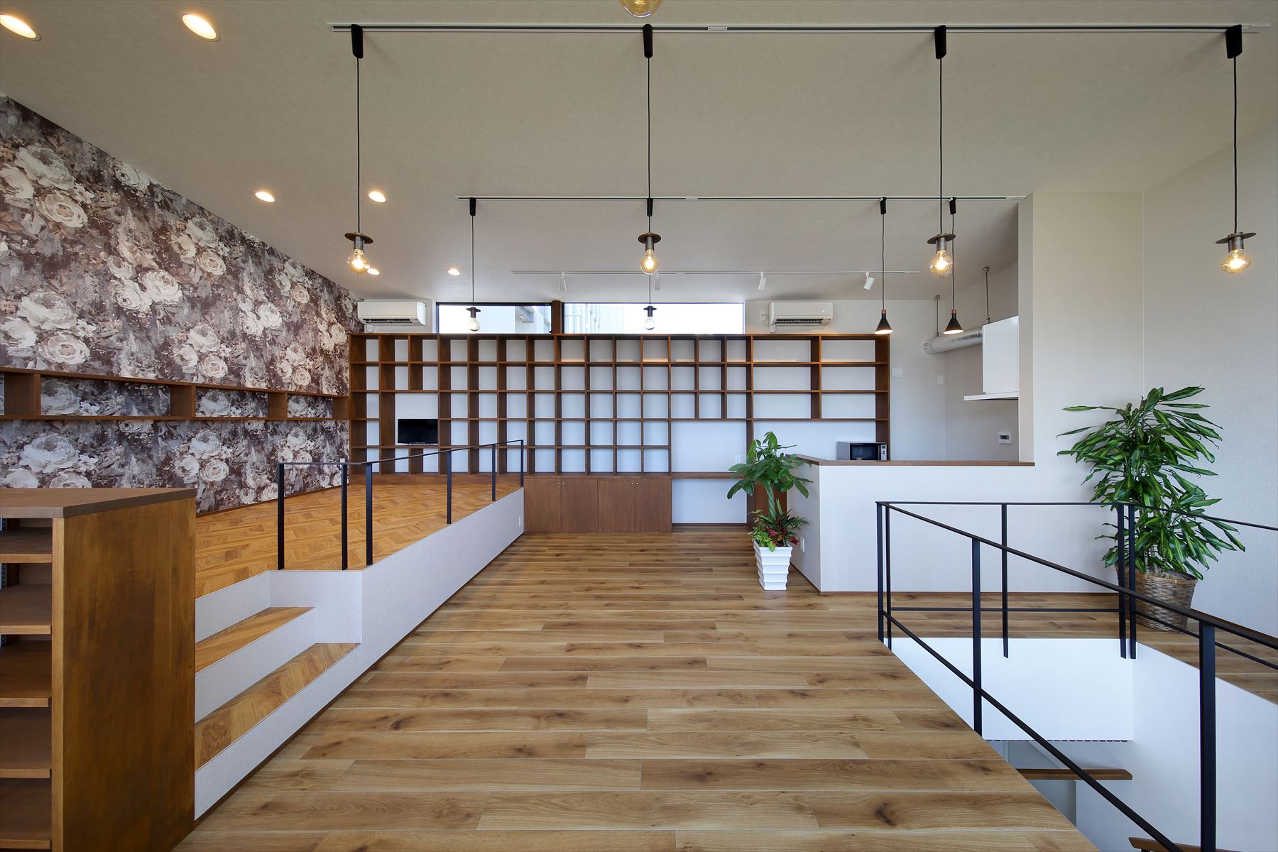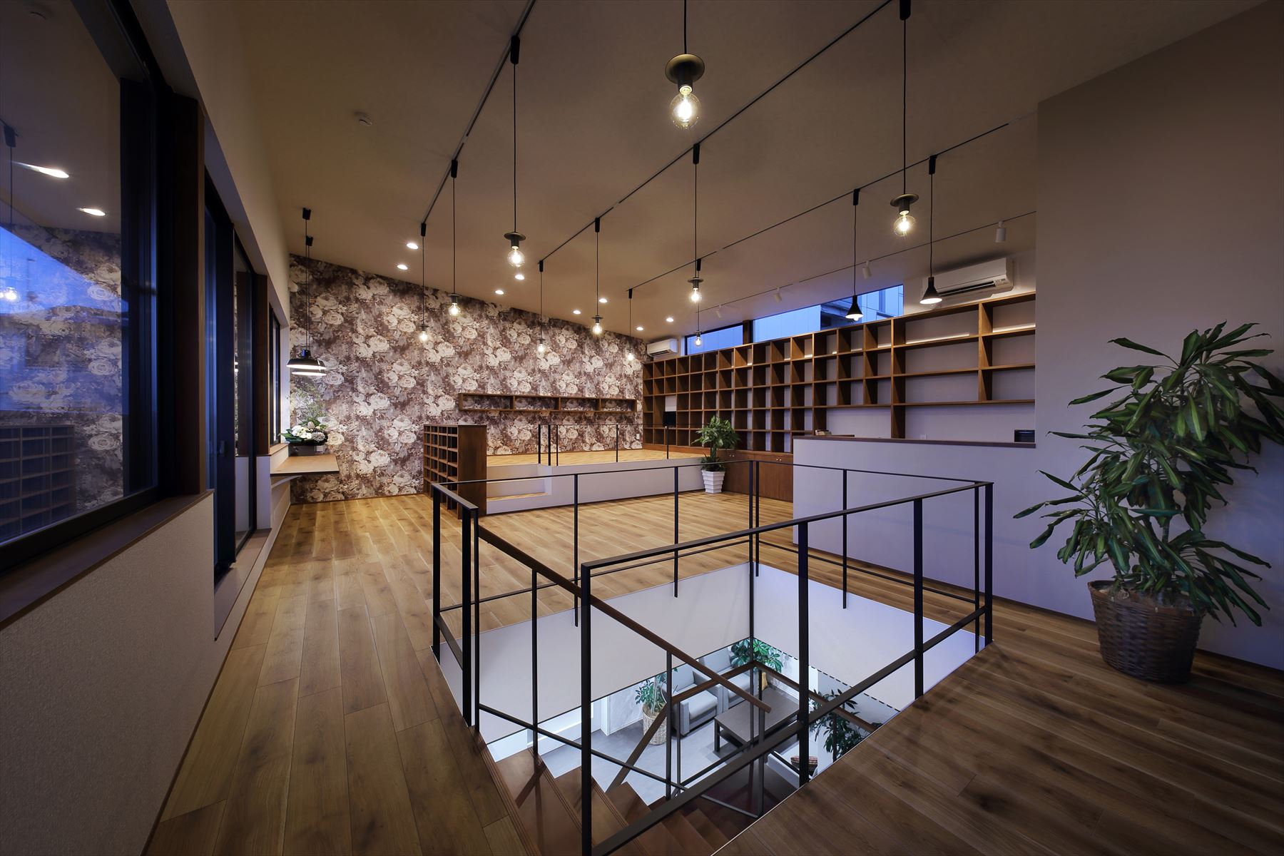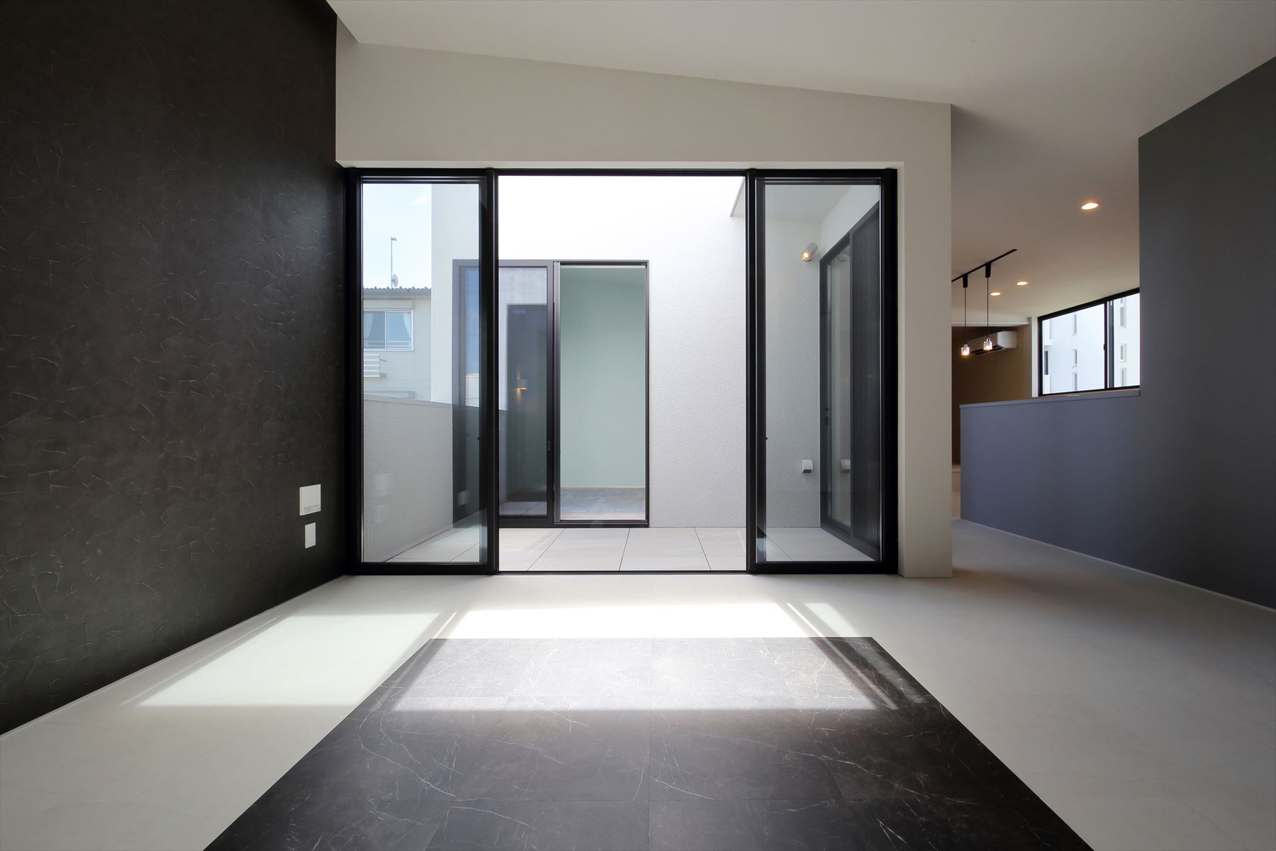 敷地は北側道路に面し、間口17m、奥行き25mの奥にながい形状で、西側と南側は建物が近接していたため、東面に大きく開くプランとしました。駐車場が多く必要だったこともあり、建物を西側に片寄に配置し、東側に十分な駐車台数の確保できるような配置計画となりました。道路側に事務所、奥に住宅を配置し、事務所の公共性と住宅のプライバシー確保を奥に長いプランで解消しています。