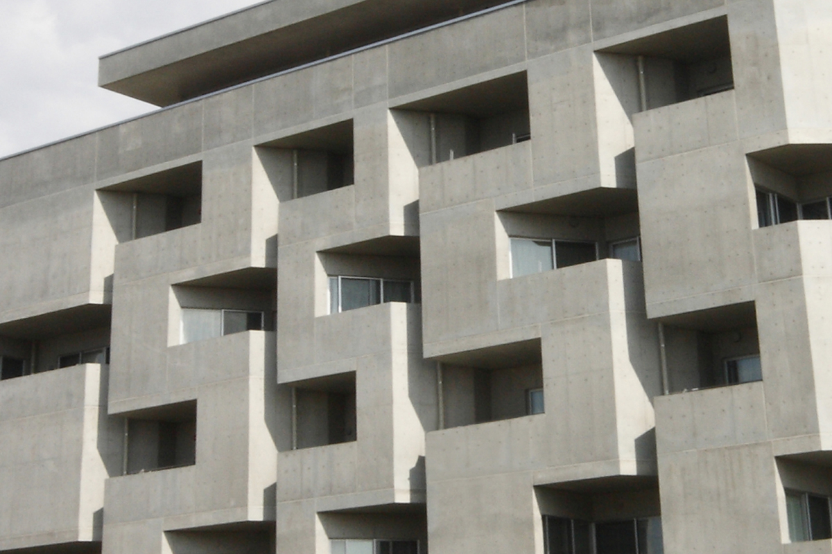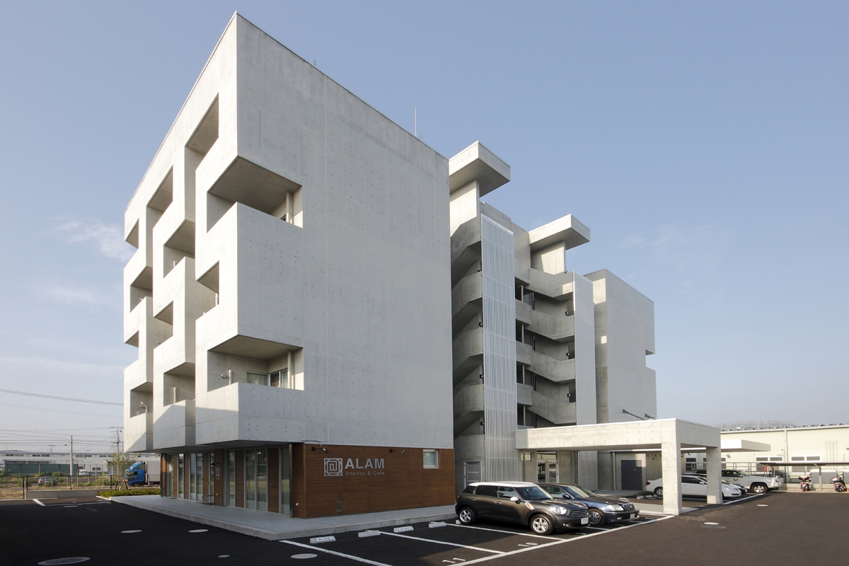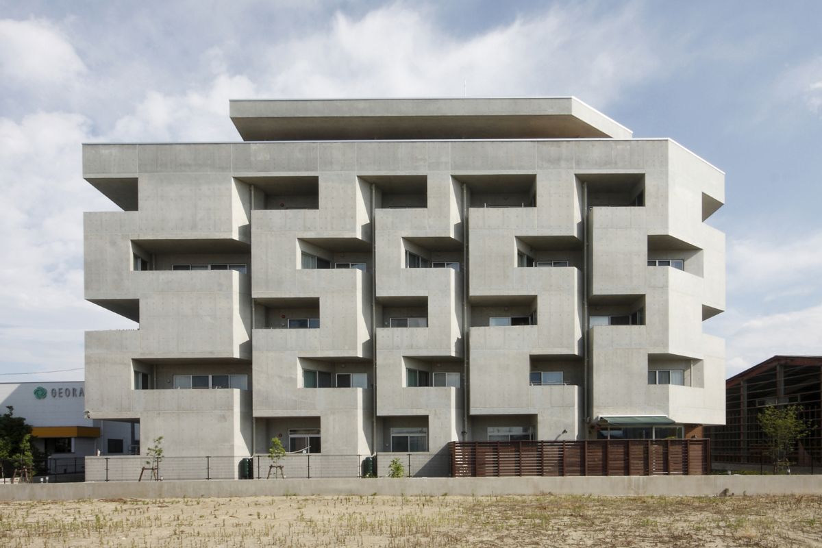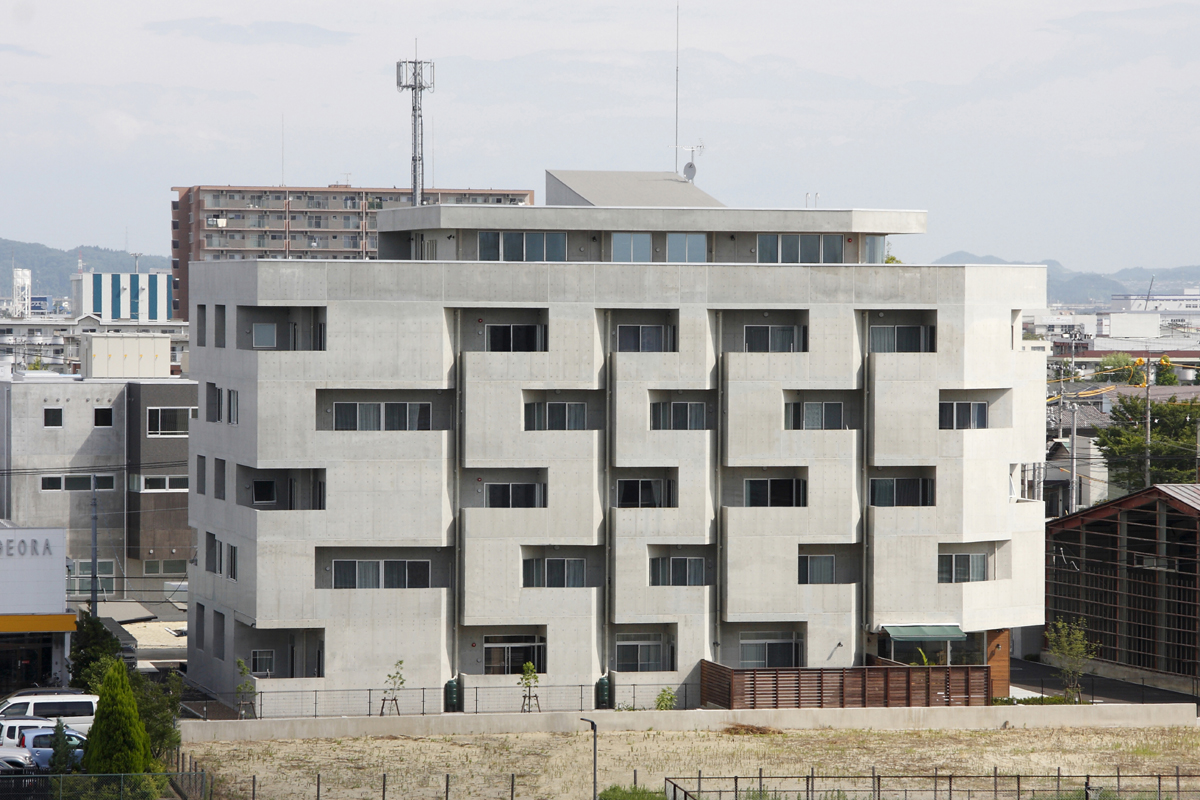 6階に屋上庭園とオーナー住宅、1階の一部にメゾネット型の息子世帯住宅とカフェを配置し、1階~5階の賃貸部分は多様な形状の住戸を配置することで、様々な入居者のニーズに応えるようにしています。外観は従来の連続バルコニーが並ぶデザインから、バルコニーを互い違いにすることで住戸のプライバシーを確保しつつ、動きのある魅力的な外観となっています。