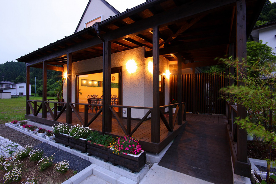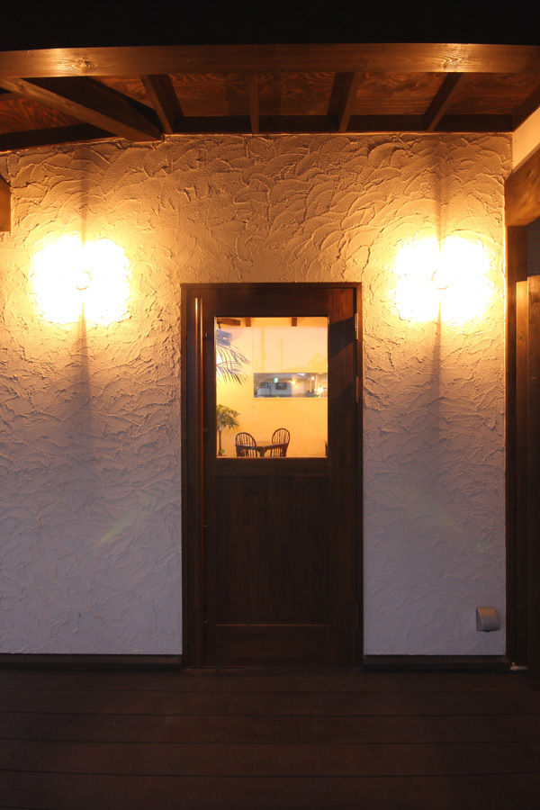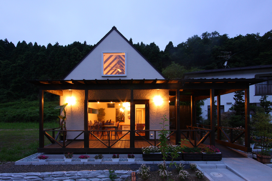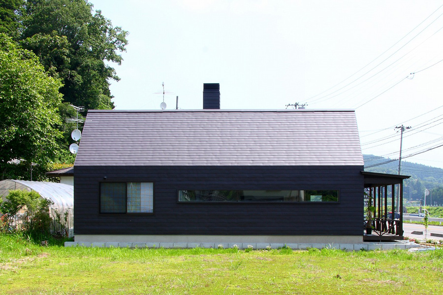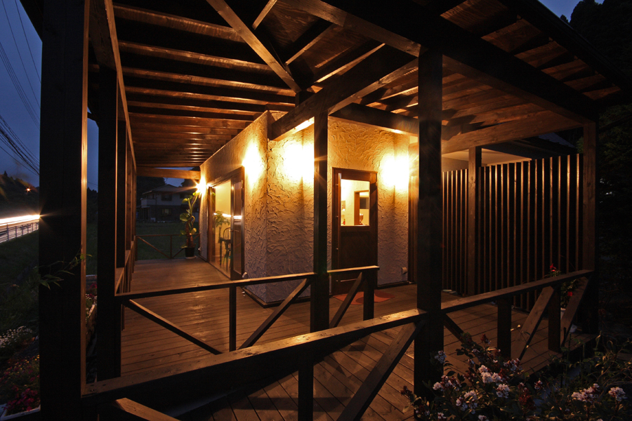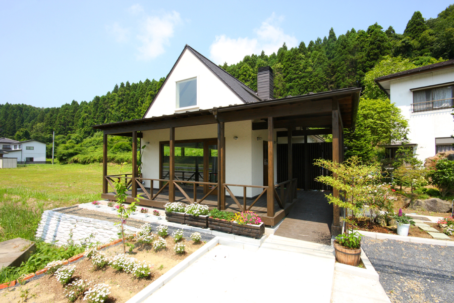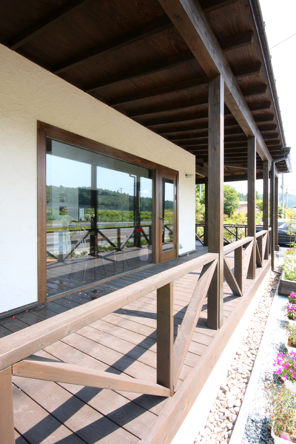 外観は、シンプルな切妻屋根を持つ方形のボリュームにエントランスポーチを兼ねた差掛テラスとすることで、周辺環境になじませながらも、店舗としての存在を出しています。