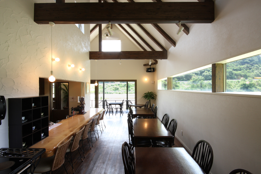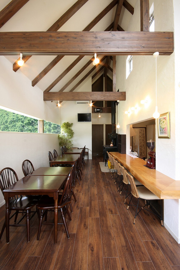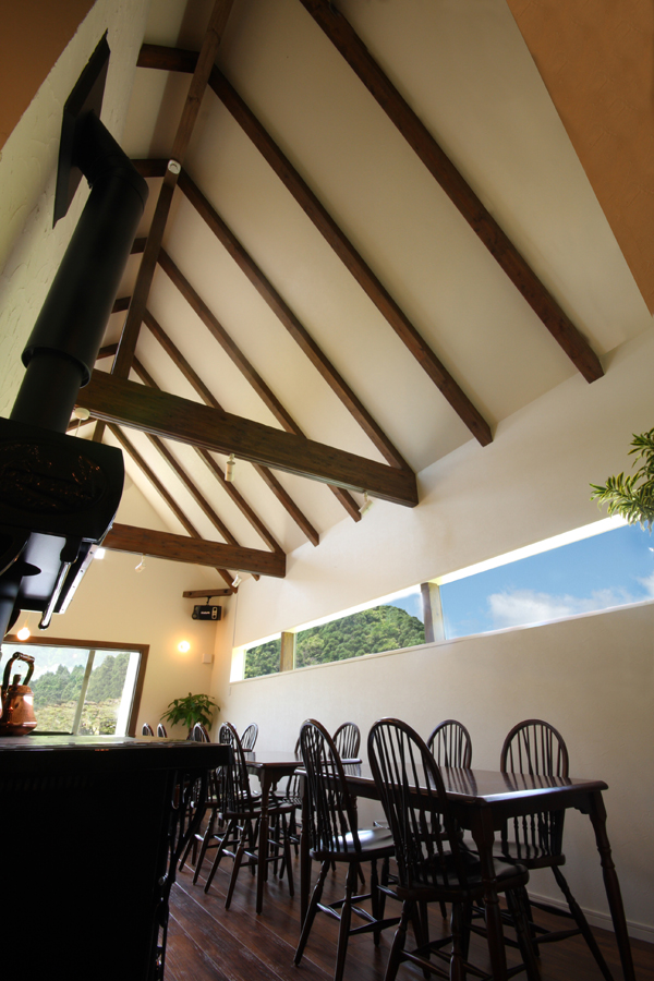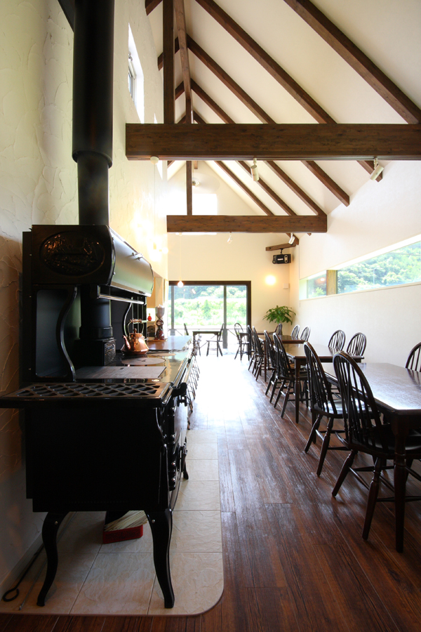 内部は、木造の小屋架構を表し、厨房との間仕切り壁は目立した塗壁とし、空間に奥行きと広がりを与えており、中央部に据えられたクッキングストーブとカウンタースペースが暖かみと親しみのある空間を創出しています。