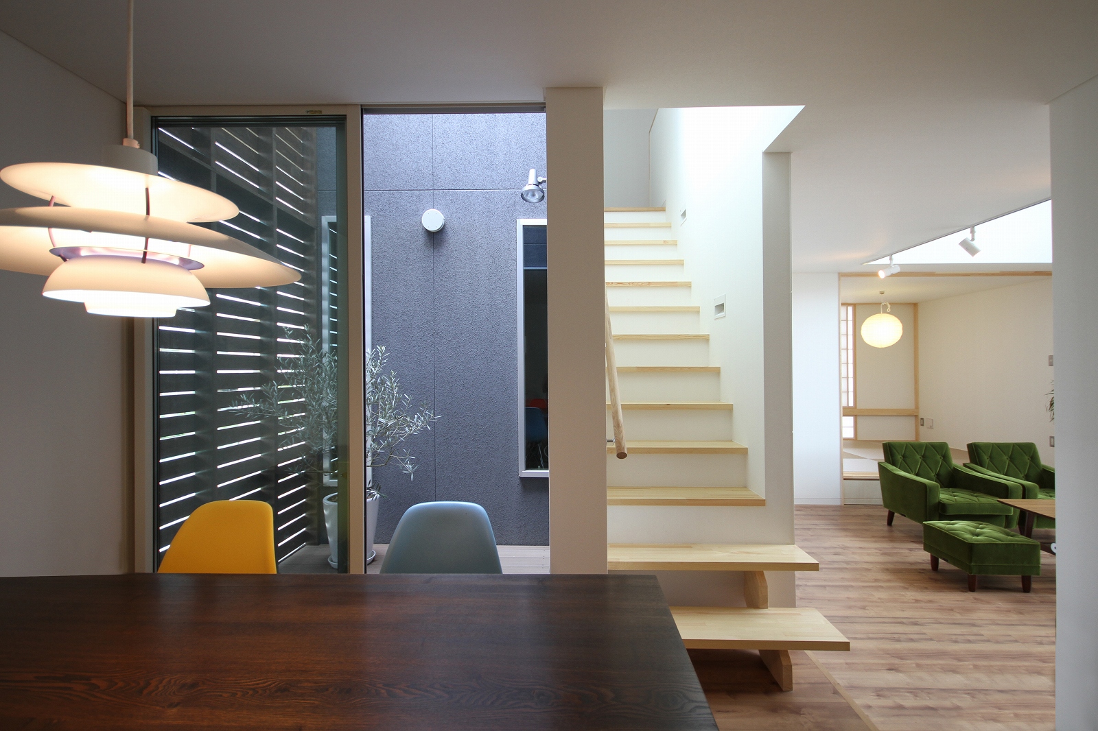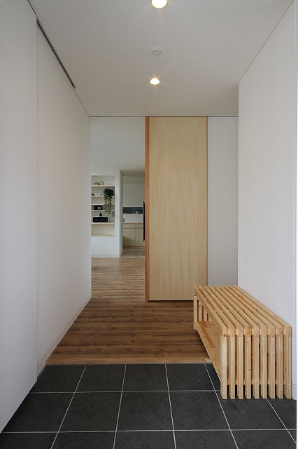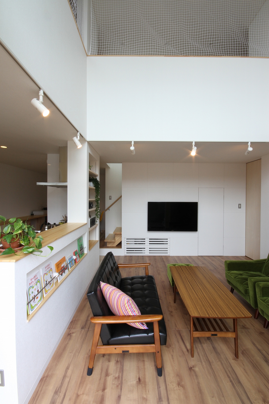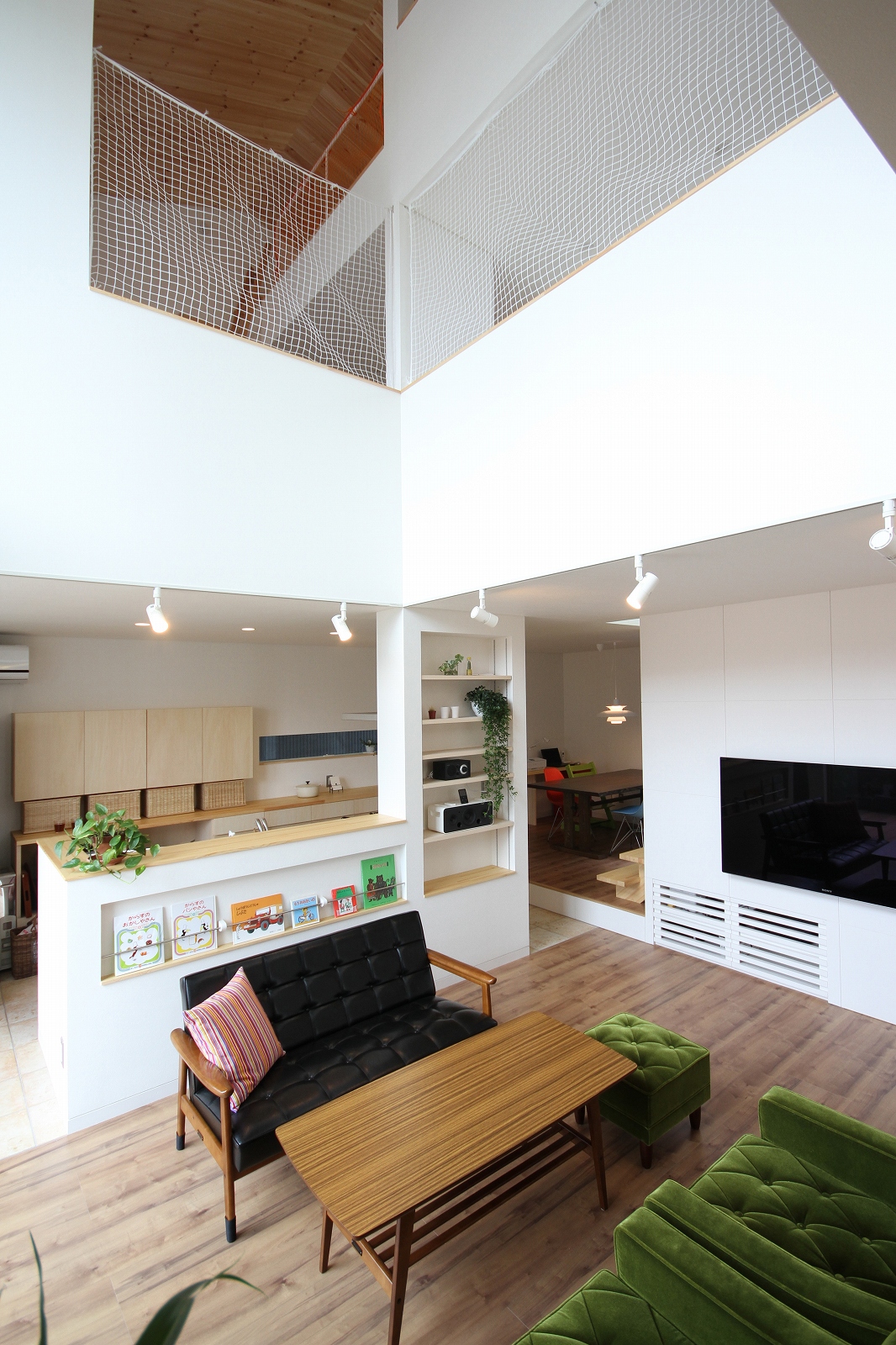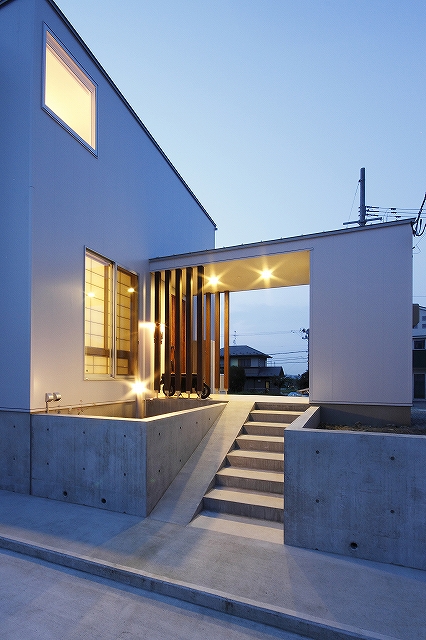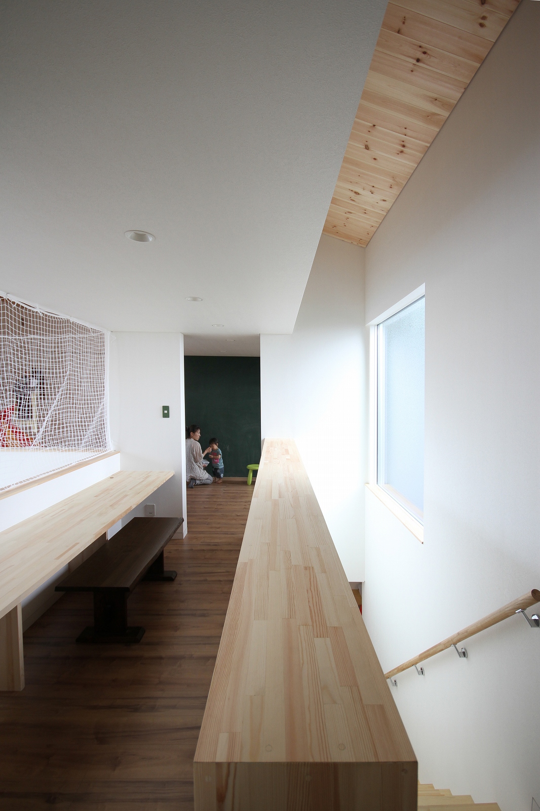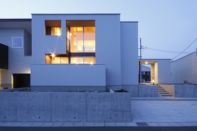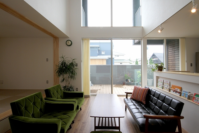計画地は既成市街地の中に新たに開発された宅地郡の中にあり、造成の際に道路より1m以上宅盤が高くなっています。家族構成は施主夫婦と子供2人の4人住まい。家族それぞれの楽しみのある開放的な造りの住まいが望まれました。家の中心を貫く大きな吹き抜けはロフトを含めた3層のフロアそれぞれの居場所と繋がっています。1階は広々とした家族の居場所。LDKはそれぞれの場所が領域や収納壁などで緩やか区切られ、落ち着きのあるスペースに。小上がりの和室も扉開け放てば1室として利用できる便利な場所です。2階はそれぞれの寝室と水回り。吹き抜けに面したスタディーコーナーは大きな本棚と家族が並んでも十分なスペースを確保しました。ダイニングに隣接したパソコンスペース、階段下の秘密の書斎、子供たちの自由なお絵かきが出来る大きな黒板、暮らしに彩を与えるモザイクタイルの洗面スペース。おおらかな間取りの中に家族の楽しみをちりばめた住まいとなりました。