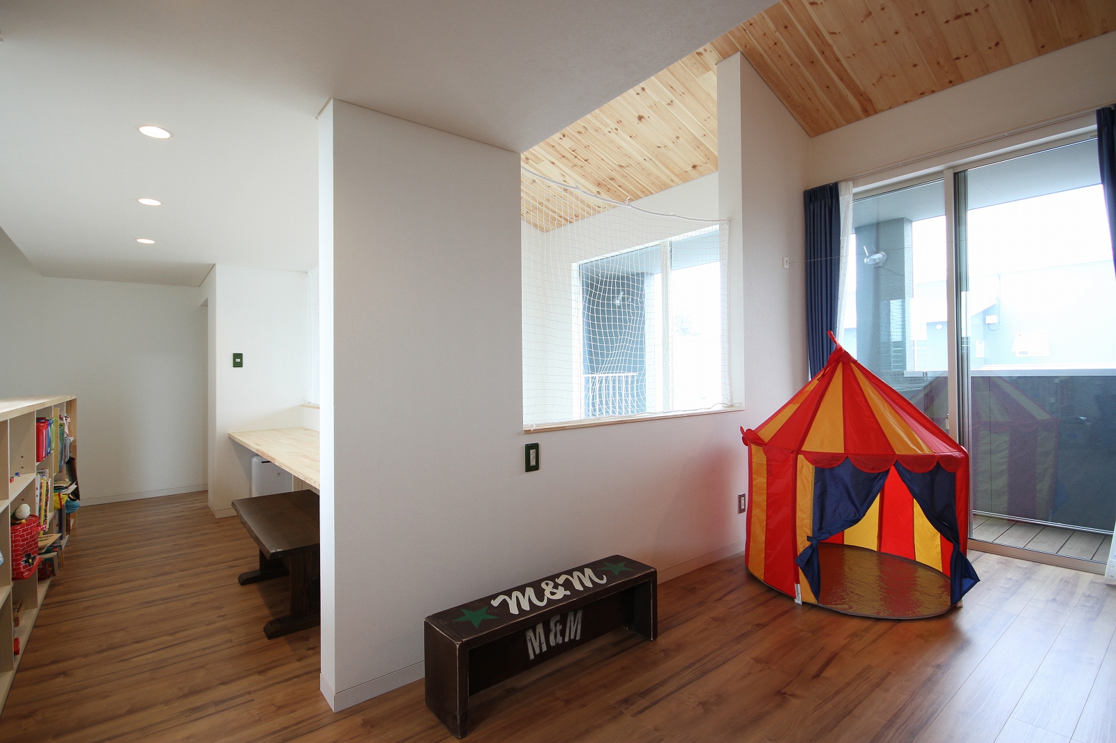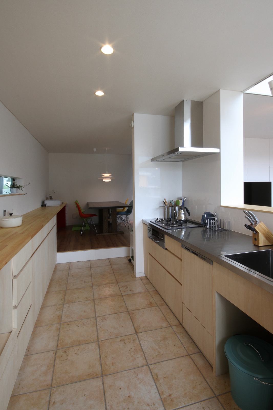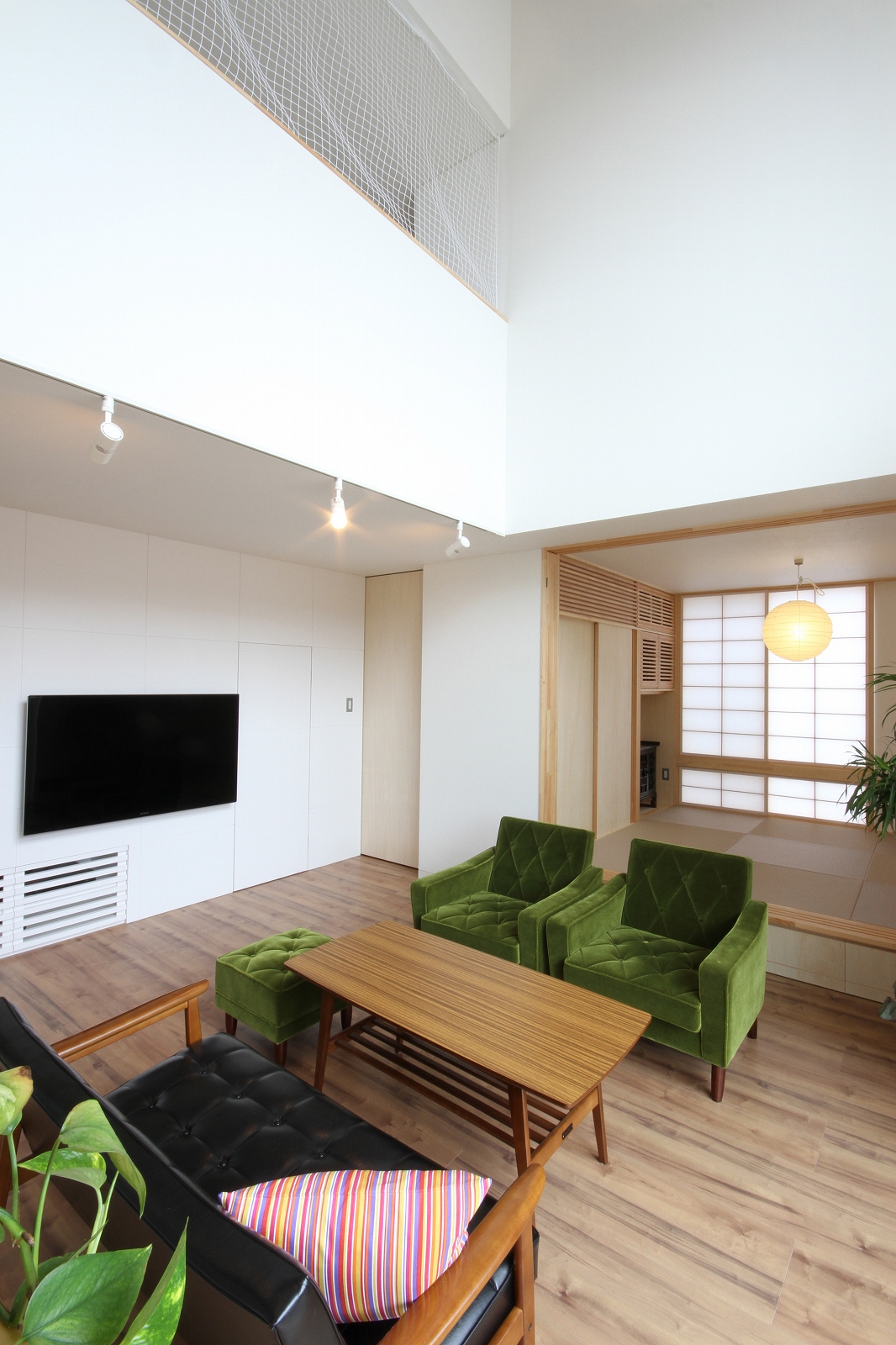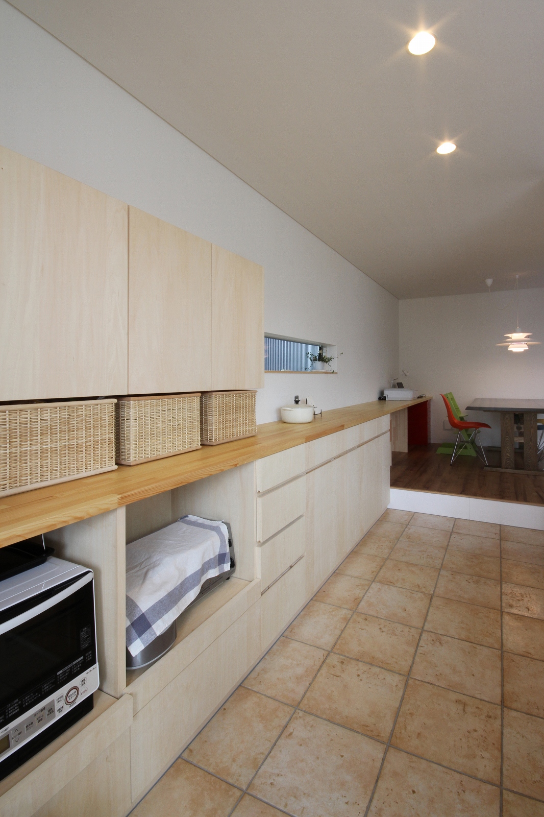 計画地は既成市街地の中に新たに開発された宅地郡の中にあり、造成の際に道路より1m以上宅盤が高くなっています。家族構成は施主夫婦と子供2人の4人住まい。家族それぞれの楽しみのある開放的な造りの住まいが望まれました。家の中心を貫く大きな吹き抜けはロフトを含めた3層のフロアそれぞれの居場所と繋がっています。1階は広々とした家族の居場所。LDKはそれぞれの場所が領域や収納壁などで緩やか区切られ、落ち着きのあるスペースに。小上がりの和室も扉開け放てば1室として利用できる便利な場所です。2階はそれぞれの寝室と水回り。吹き抜けに面したスタディーコーナーは大きな本棚と家族が並んでも十分なスペースを確保しました。ダイニングに隣接したパソコンスペース、階段下の秘密の書斎、子供たちの自由なお絵かきが出来る大きな黒板、暮らしに彩を与えるモザイクタイルの洗面スペース。おおらかな間取りの中に家族の楽しみをちりばめた住まいとなりました。