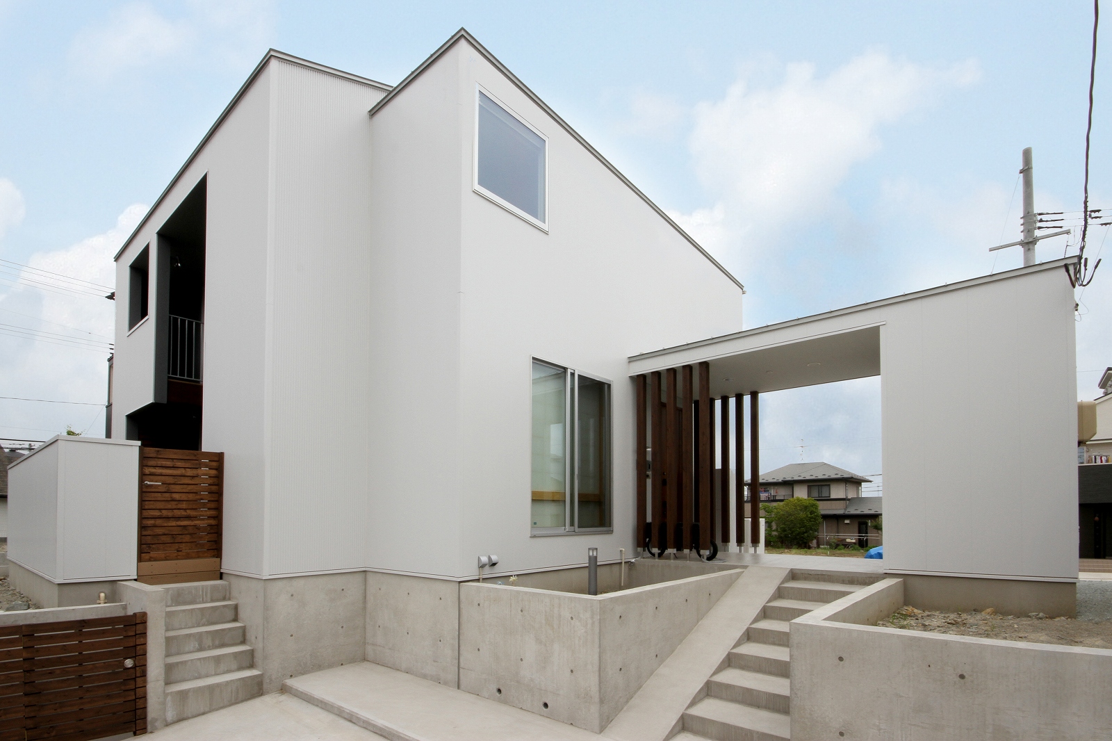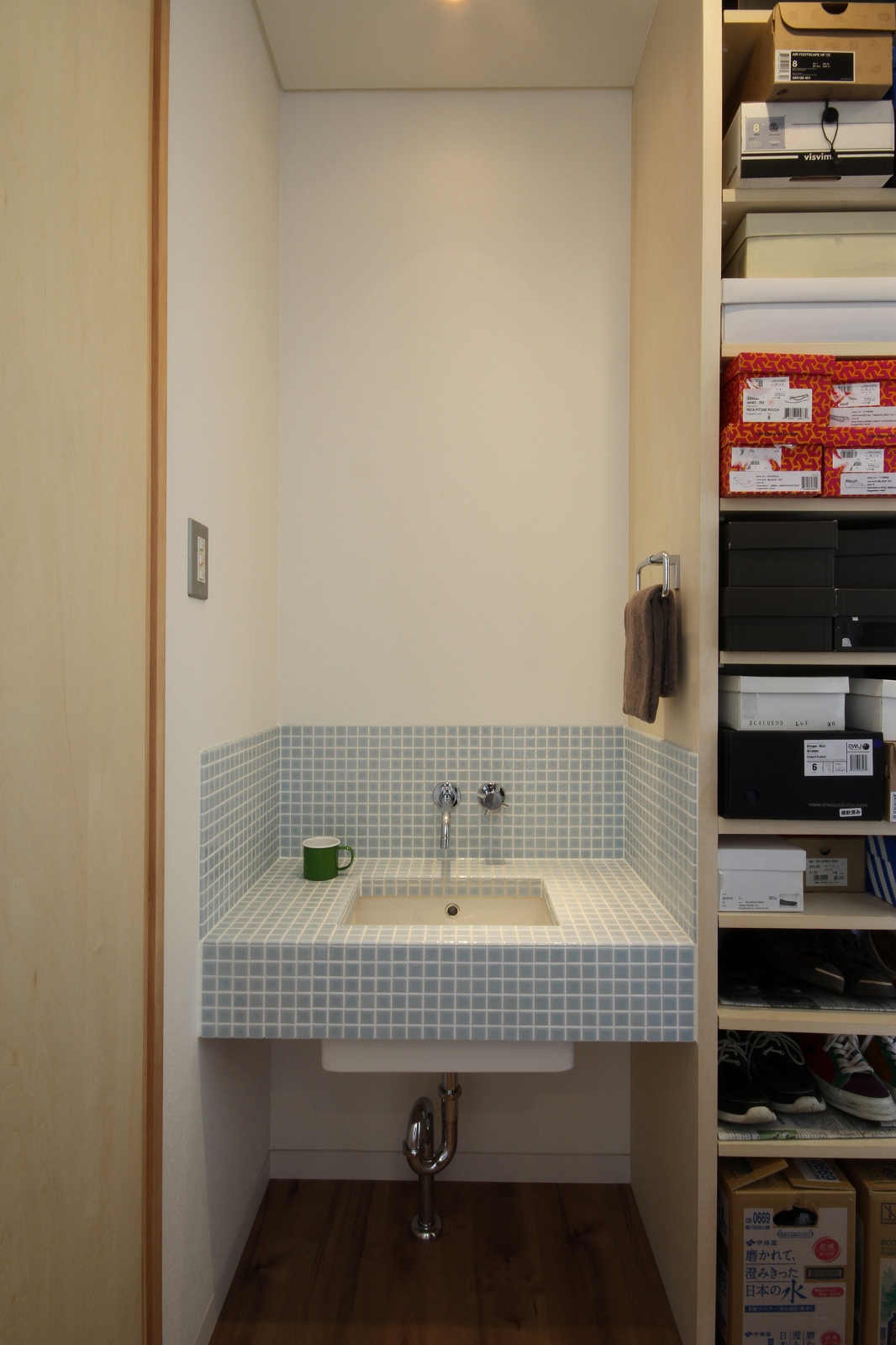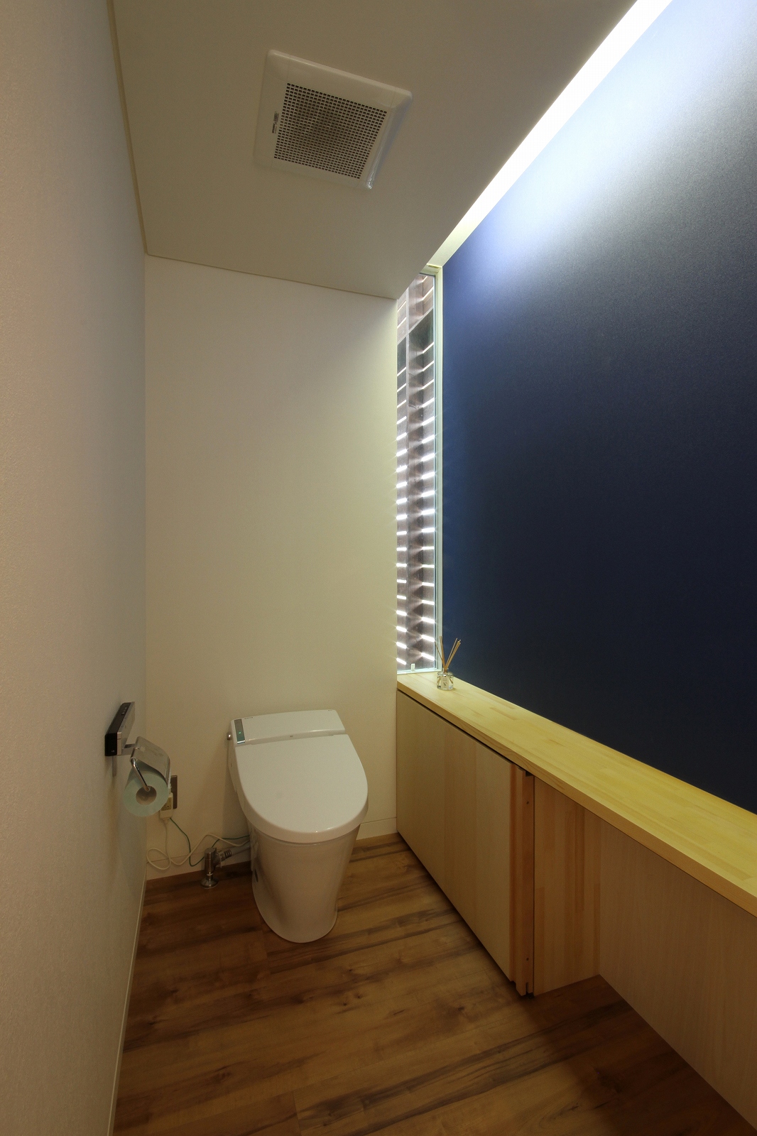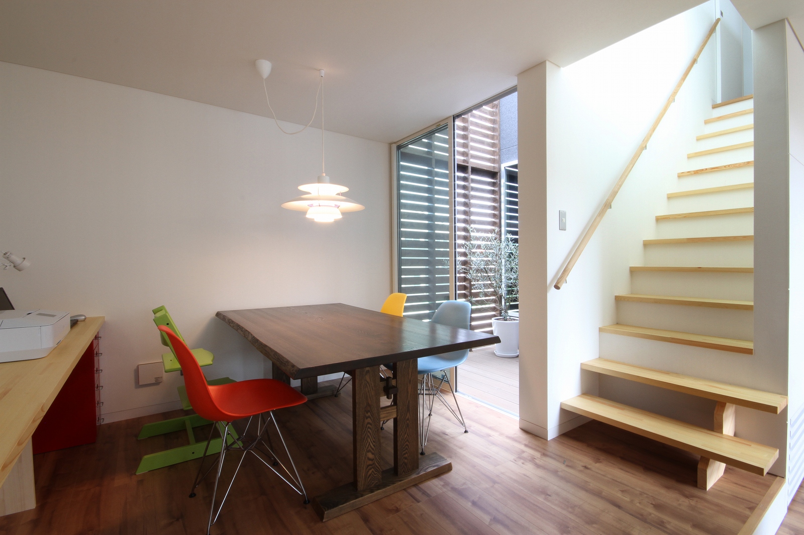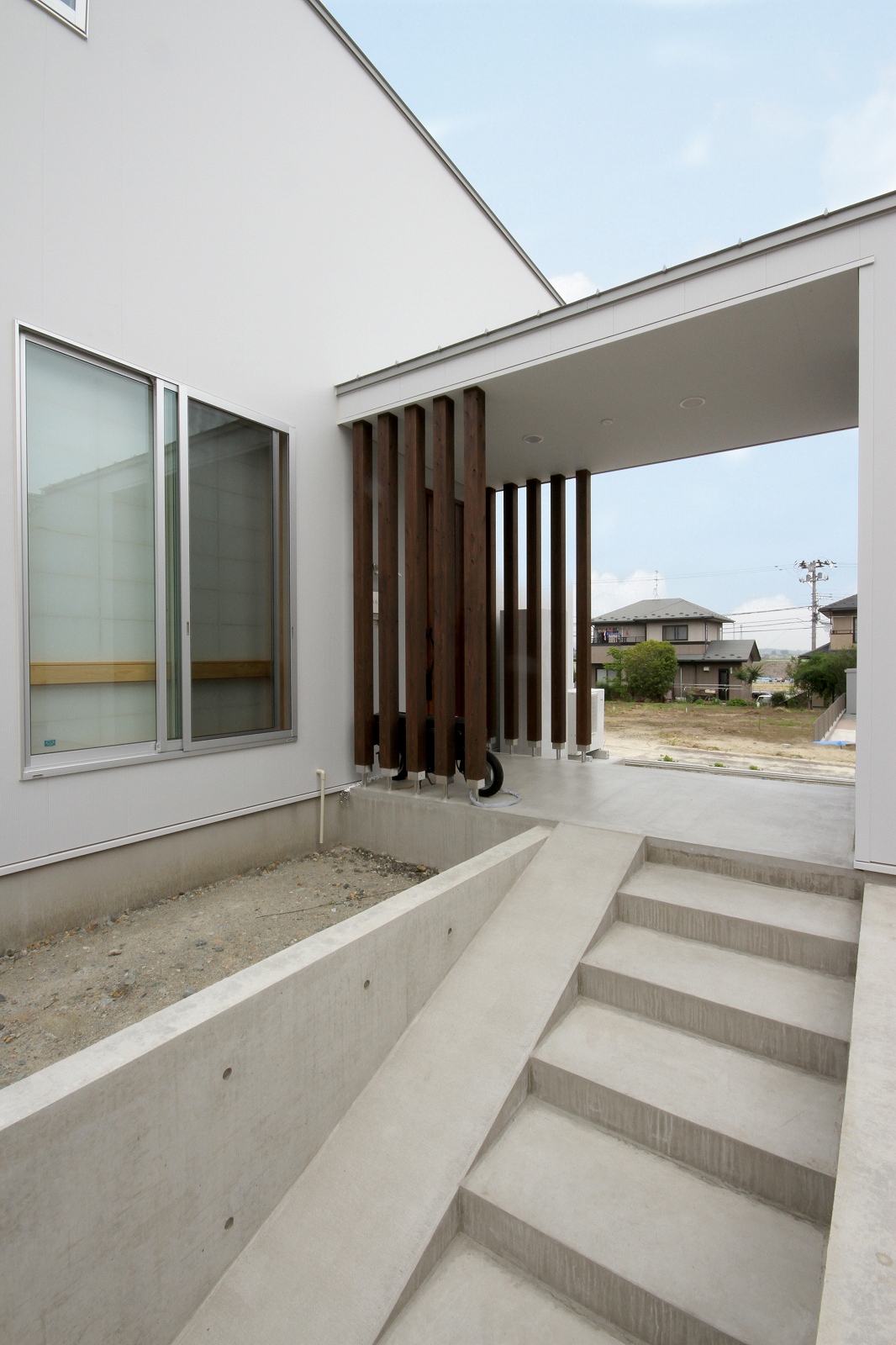 計画地は既成市街地の中に新たに開発された宅地郡の中にあり、造成の際に道路より1m以上宅盤が高くなっています。家族構成は施主夫婦と子供2人の4人住まい。家族それぞれの楽しみのある開放的な造りの住まいが望まれました。家の中心を貫く大きな吹き抜けはロフトを含めた3層のフロアそれぞれの居場所と繋がっています。1階は広々とした家族の居場所。LDKはそれぞれの場所が領域や収納壁などで緩やか区切られ、落ち着きのあるスペースに。小上がりの和室も扉開け放てば1室として利用できる便利な場所です。2階はそれぞれの寝室と水回り。吹き抜けに面したスタディーコーナーは大きな本棚と家族が並んでも十分なスペースを確保しました。ダイニングに隣接したパソコンスペース、階段下の秘密の書斎、子供たちの自由なお絵かきが出来る大きな黒板、暮らしに彩を与えるモザイクタイルの洗面スペース。おおらかな間取りの中に家族の楽しみをちりばめた住まいとなりました。