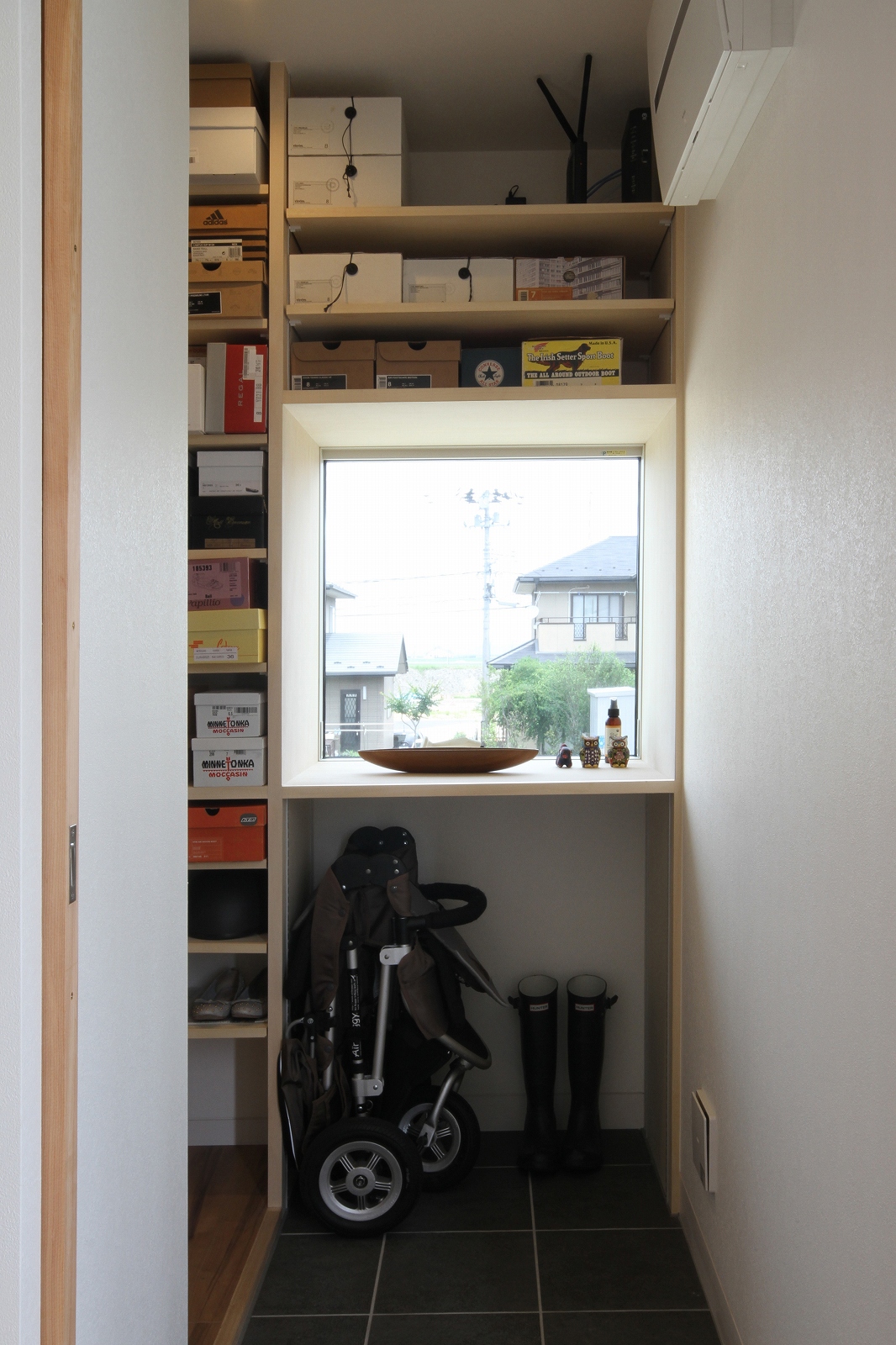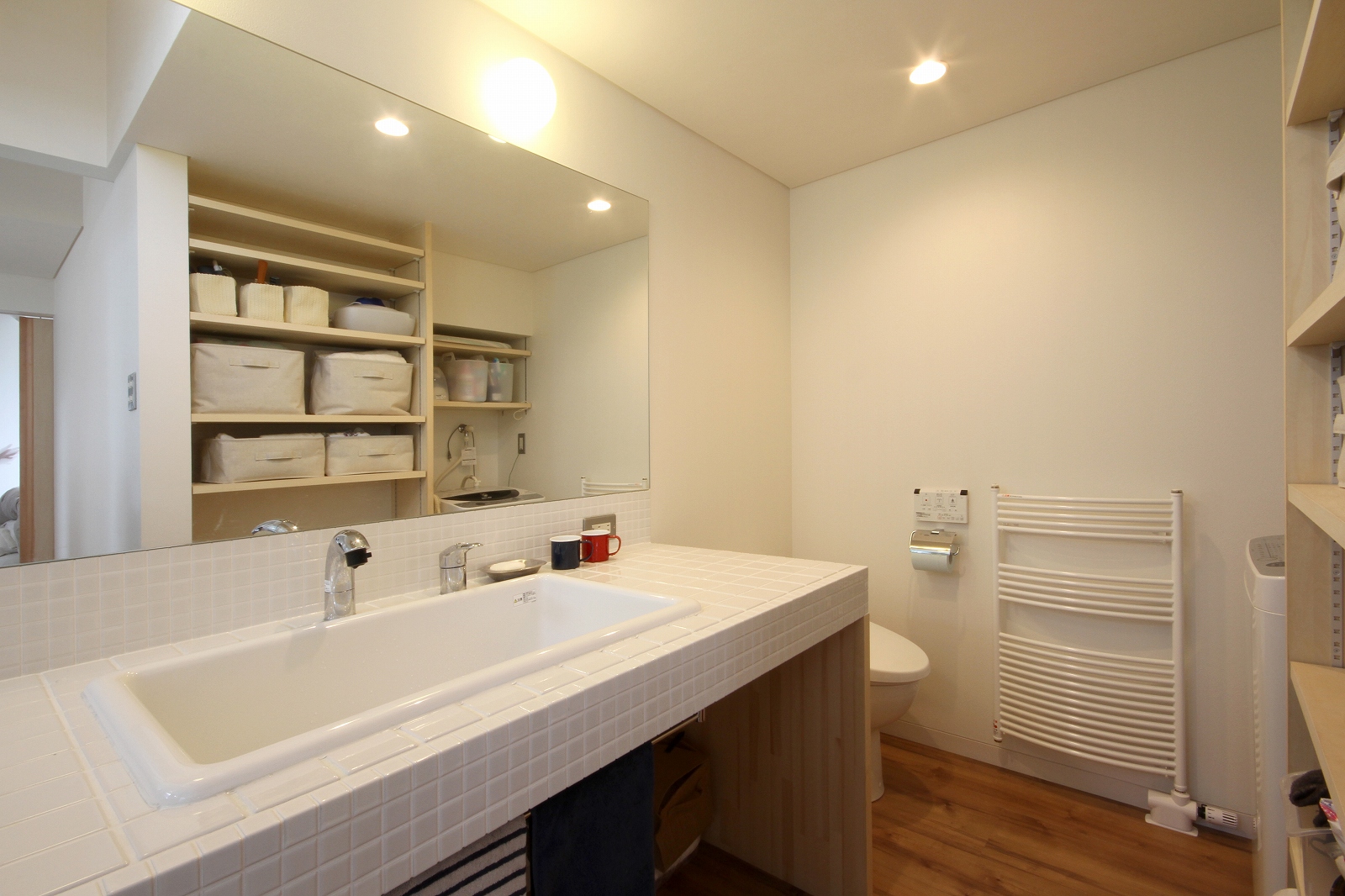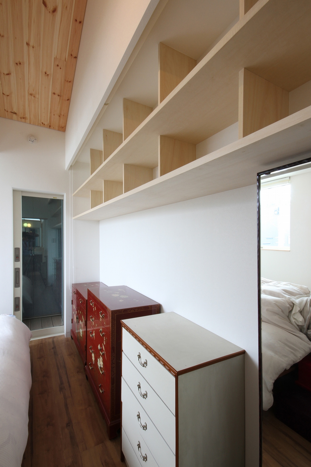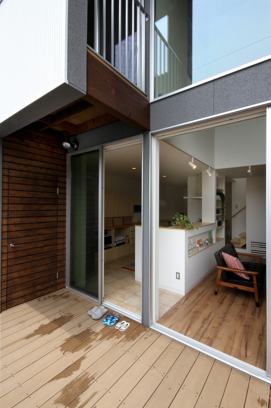 計画地は既成市街地の中に新たに開発された宅地郡の中にあり、造成の際に道路より1m以上宅盤が高くなっています。家族構成は施主夫婦と子供2人の4人住まい。家族それぞれの楽しみのある開放的な造りの住まいが望まれました。家の中心を貫く大きな吹き抜けはロフトを含めた3層のフロアそれぞれの居場所と繋がっています。1階は広々とした家族の居場所。LDKはそれぞれの場所が領域や収納壁などで緩やか区切られ、落ち着きのあるスペースに。小上がりの和室も扉開け放てば1室として利用できる便利な場所です。2階はそれぞれの寝室と水回り。吹き抜けに面したスタディーコーナーは大きな本棚と家族が並んでも十分なスペースを確保しました。ダイニングに隣接したパソコンスペース、階段下の秘密の書斎、子供たちの自由なお絵かきが出来る大きな黒板、暮らしに彩を与えるモザイクタイルの洗面スペース。おおらかな間取りの中に家族の楽しみをちりばめた住まいとなりました。