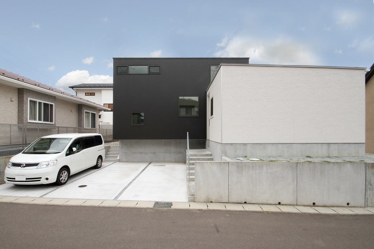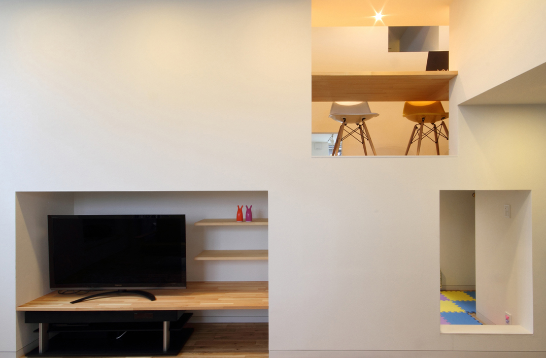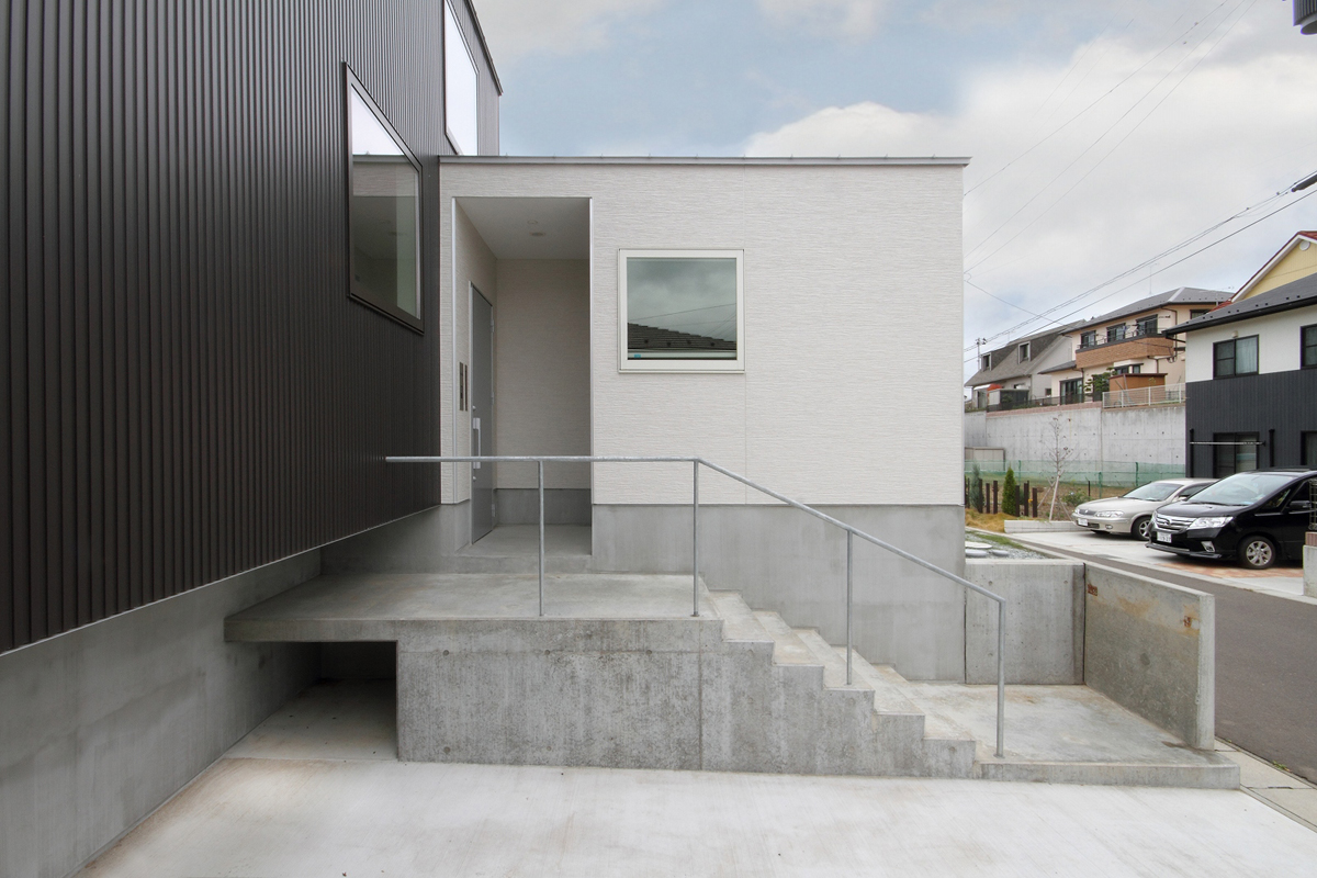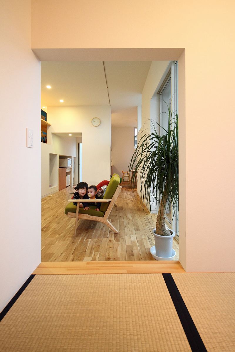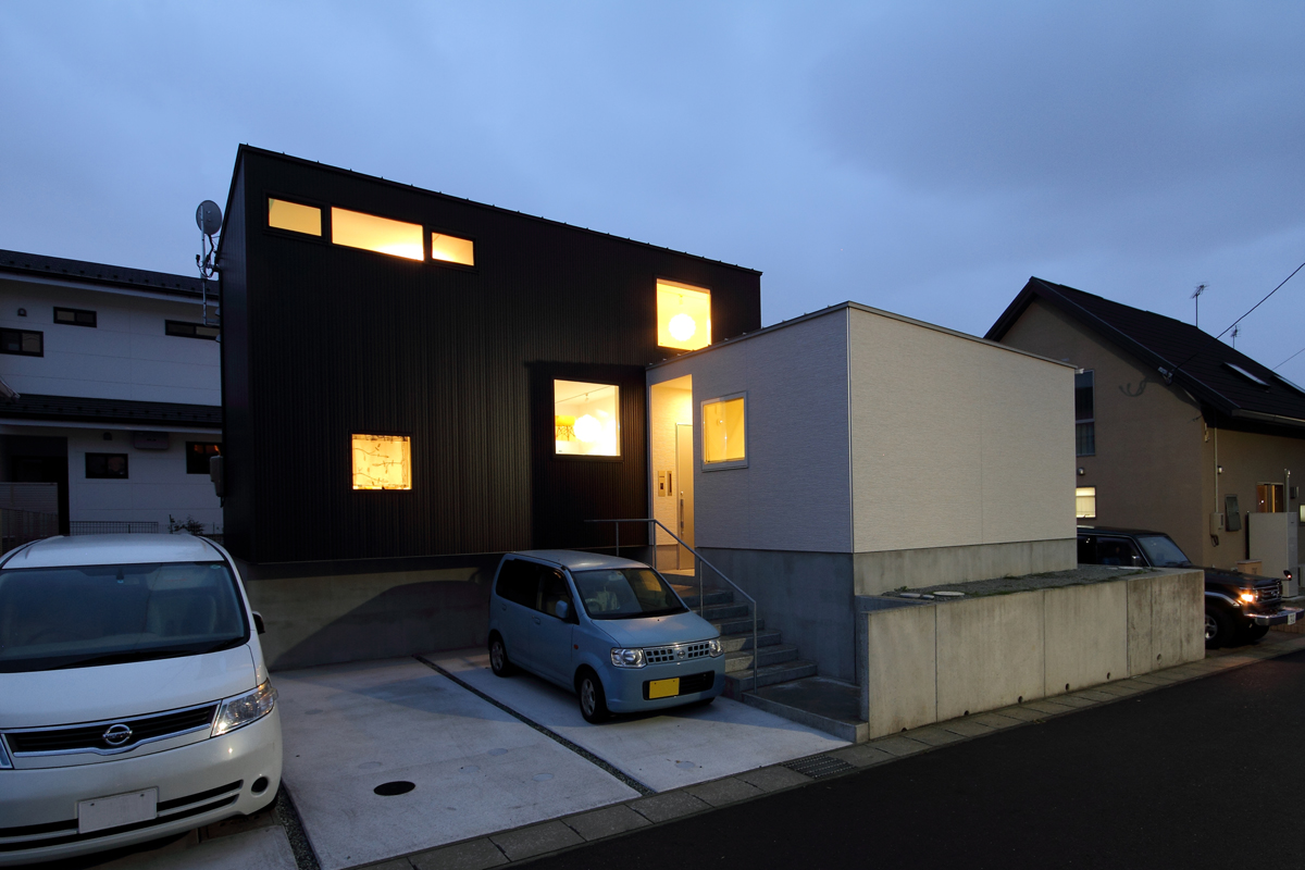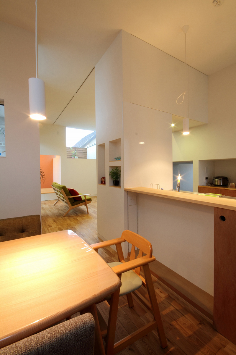 どこにでもある郊外型分譲宅地の風景に、性格の異なる3つのCUBEが連なる明快な構成を持つ住宅を計画することで、住宅の既成概念とは異なる空間配列の多様性を表現することを目指しました。 3つのキューブが織り成す空間はCUBE 01:個室の集合体 (主寝室、寝室1,2)、CUBE 02:家族のパブリックスペース (リビング、ダイニング、キッチン、テラス、畳スペース) 、CUBE 03:家族外のパブリックスペース (客間、両親のための和室)となっています。通常、廊下によって結ばれるこれらの空間をCUBEとして捉え、一つの住居に織り込む。そうすることにより、これまでの既成概念による住居の空間配列とは異なる空間配列を実現しています。 3つのCUBEは、住戸内に高低明暗といった多様性と迷路のようなシークエンス(連続性)を与えます。寝室からキッチンへ、キッチンから床下収納を経由して主寝室へと、これまでの住宅では予期しない空間の連なりにより、日々の生活に適度な驚きと変化をもたらす住宅を実現しました。