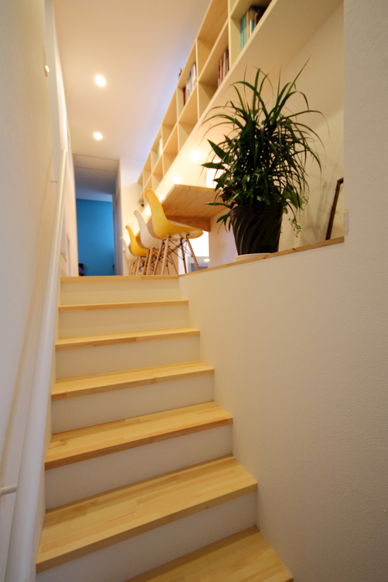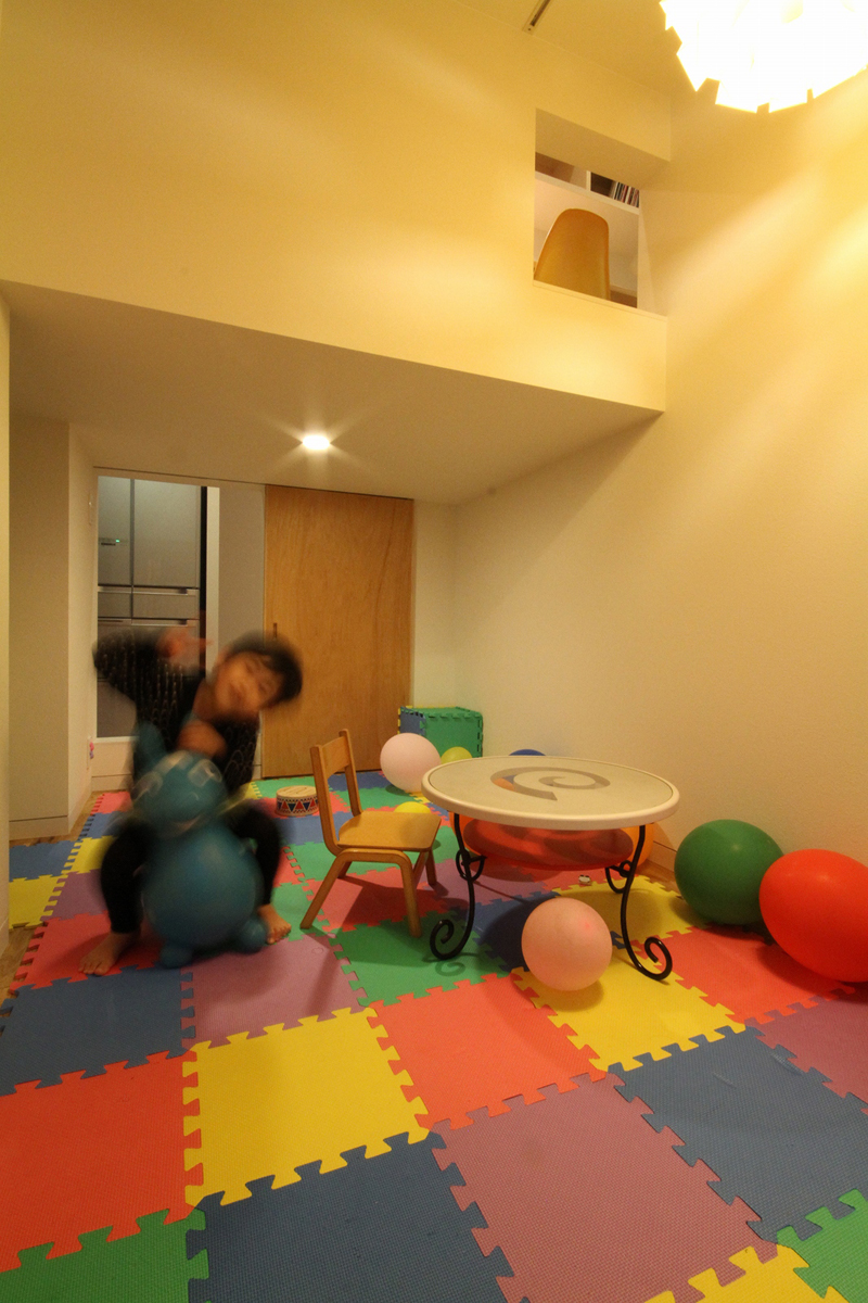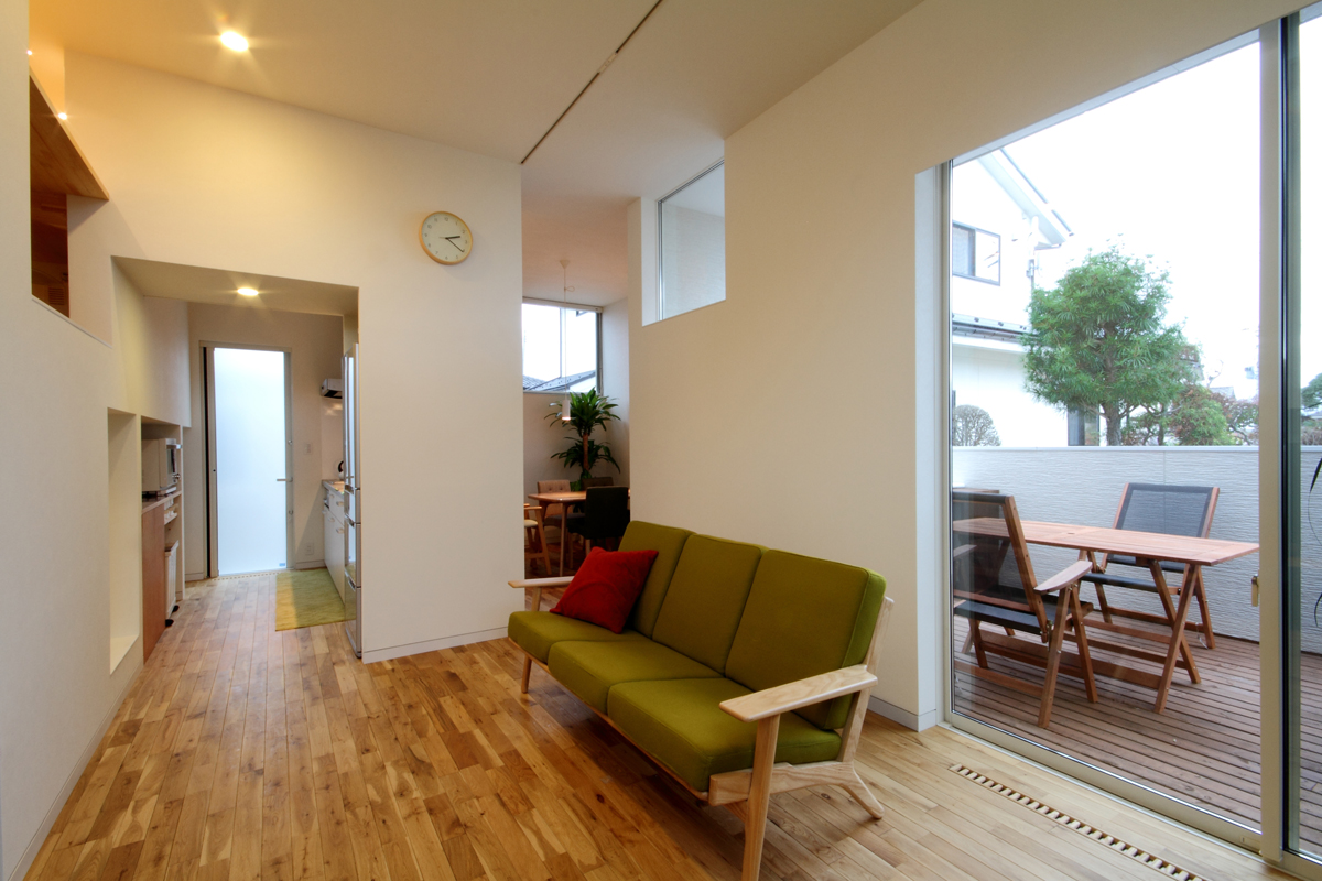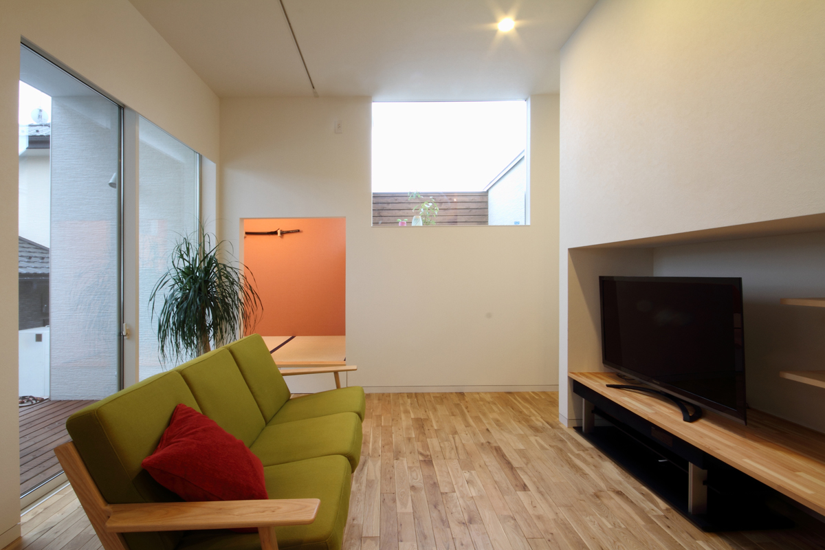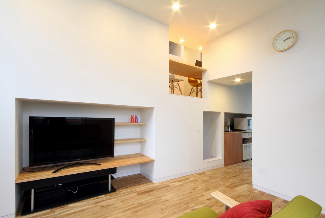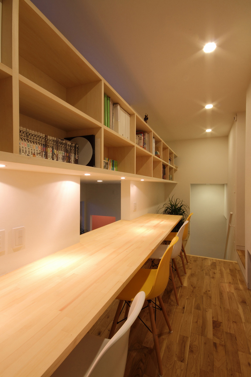 どこにでもある郊外型分譲宅地の風景に、性格の異なる3つのCUBEが連なる明快な構成を持つ住宅を計画することで、住宅の既成概念とは異なる空間配列の多様性を表現することを目指しました。 3つのキューブが織り成す空間はCUBE 01:個室の集合体 (主寝室、寝室1,2)、CUBE 02:家族のパブリックスペース (リビング、ダイニング、キッチン、テラス、畳スペース) 、CUBE 03:家族外のパブリックスペース (客間、両親のための和室)となっています。通常、廊下によって結ばれるこれらの空間をCUBEとして捉え、一つの住居に織り込む。そうすることにより、これまでの既成概念による住居の空間配列とは異なる空間配列を実現しています。 3つのCUBEは、住戸内に高低明暗といった多様性と迷路のようなシークエンス(連続性)を与えます。寝室からキッチンへ、キッチンから床下収納を経由して主寝室へと、これまでの住宅では予期しない空間の連なりにより、日々の生活に適度な驚きと変化をもたらす住宅を実現しました。