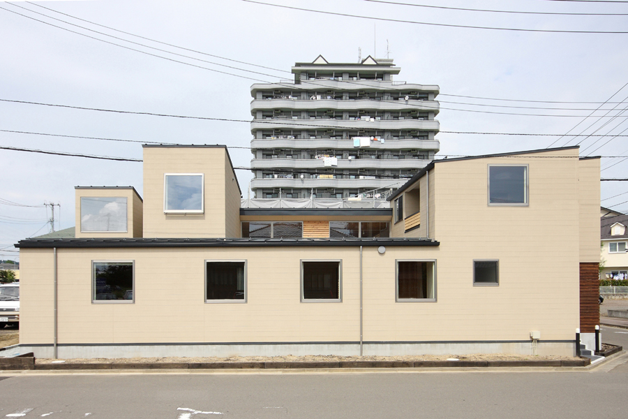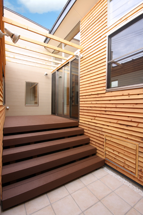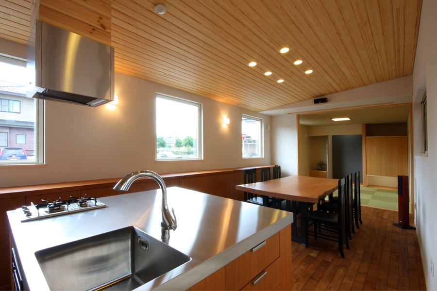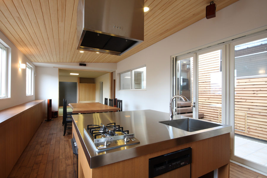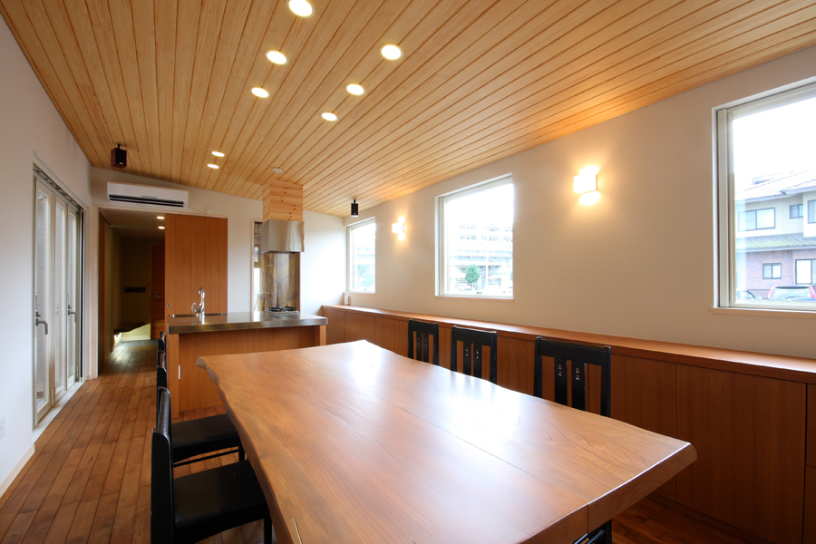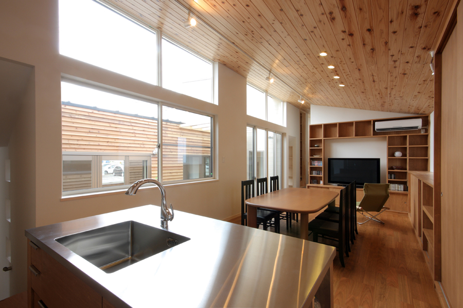 奥様から「料理サロンを開くスペースが欲しい」とのご要望から計画が始まりました。駅の近くであるため比較的人通りが多いこと、パブリックなサロンのスペースを確保しつつプライベートな空間の確保等の条件から中庭型とし、リビング側を高床にすることでサロンからの視線も気にならなくなり、プライベートなリビングとパブリックなサロンが中庭を解して緩やかにつながる空間としました。また、北側が高くなっていることで日照や通風の確保にもつながっており、高床の下は床下収納空間として利用することで空間のムダが出ないようにしています。
