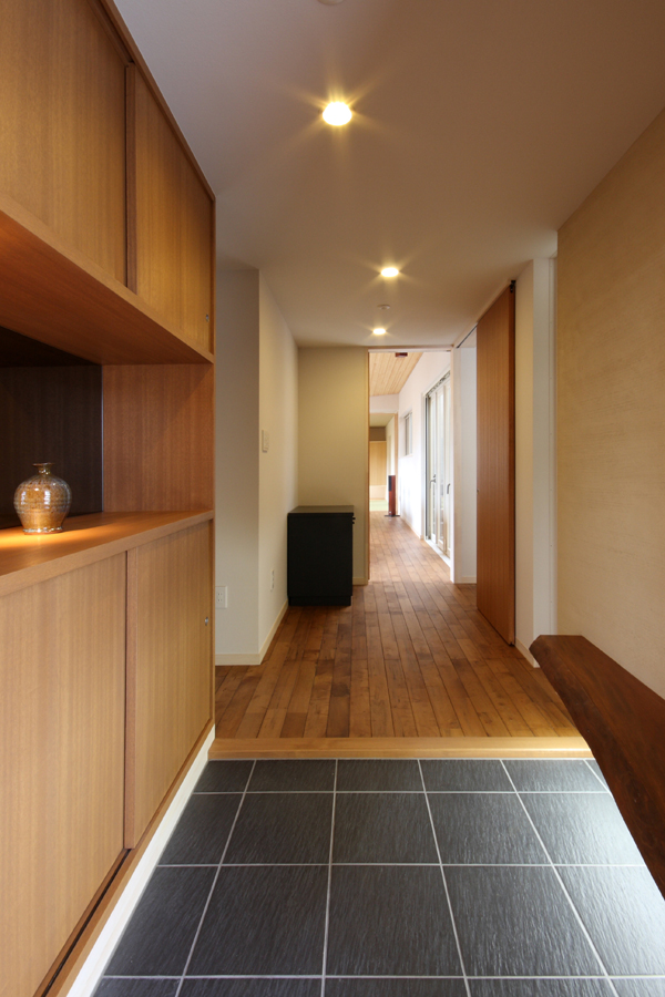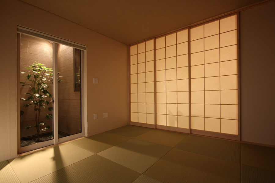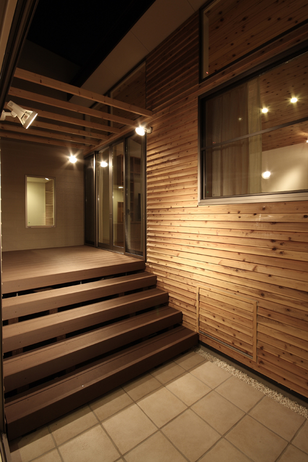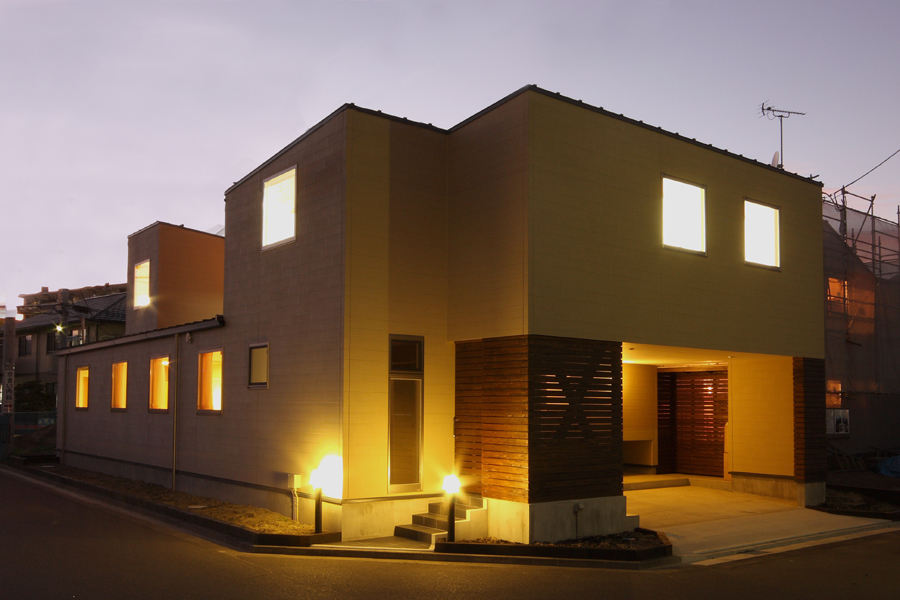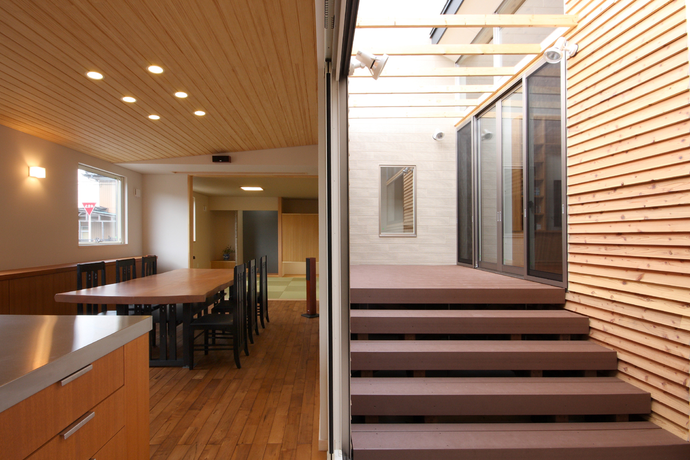 奥様から「料理サロンを開くスペースが欲しい」とのご要望から計画が始まりました。駅の近くであるため比較的人通りが多いこと、パブリックなサロンのスペースを確保しつつプライベートな空間の確保等の条件から中庭型とし、リビング側を高床にすることでサロンからの視線も気にならなくなり、プライベートなリビングとパブリックなサロンが中庭を解して緩やかにつながる空間としました。また、北側が高くなっていることで日照や通風の確保にもつながっており、高床の下は床下収納空間として利用することで空間のムダが出ないようにしています。