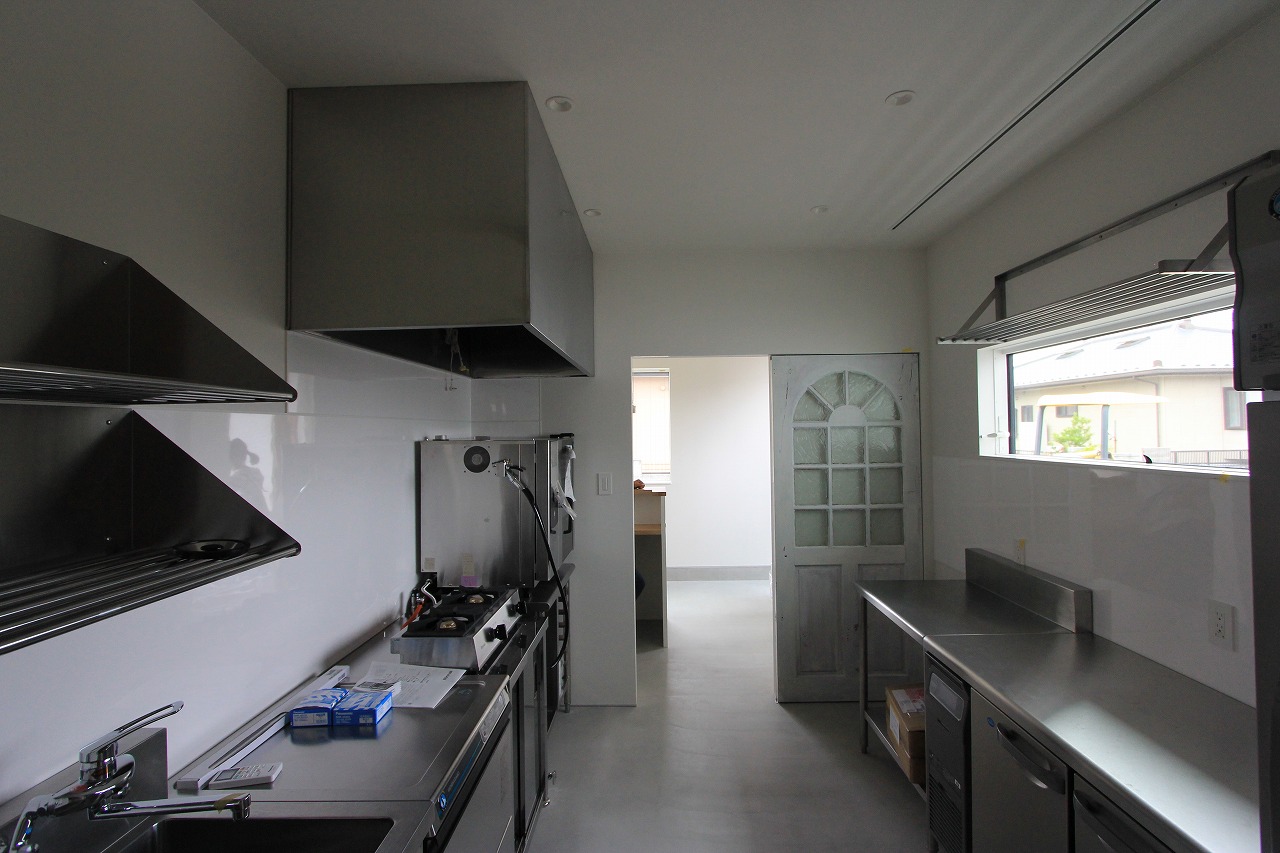 室内の動線計画としては住宅のキッチンから店舗の厨房へと行き来ができるようにすることで、